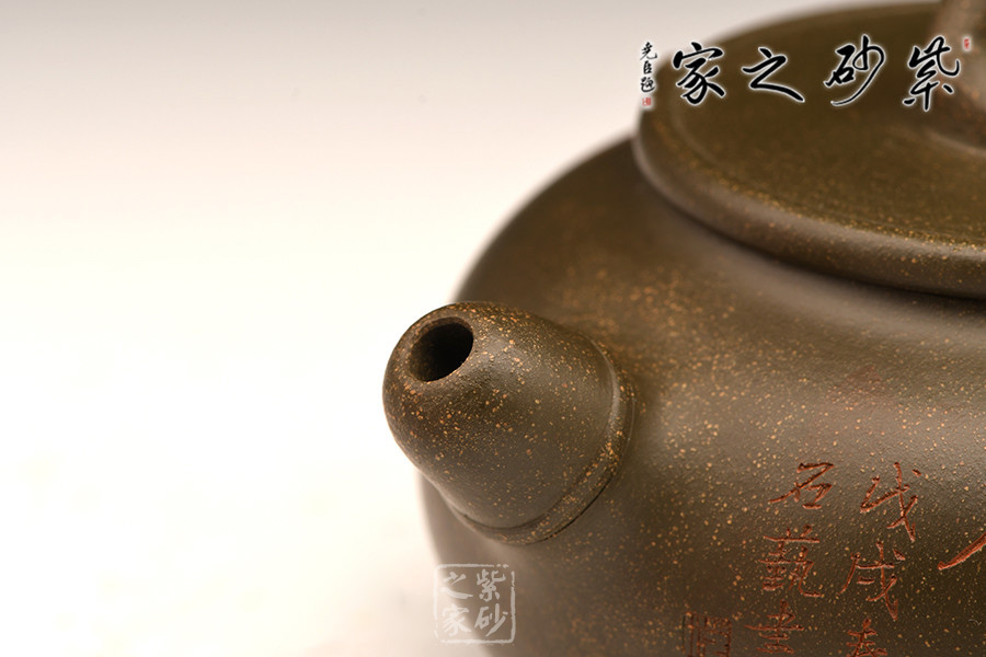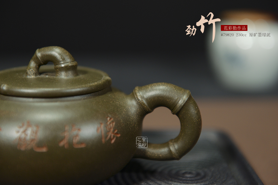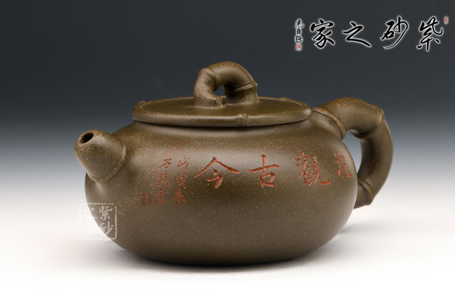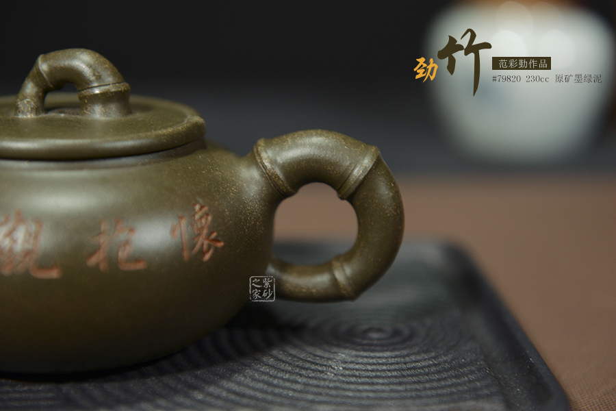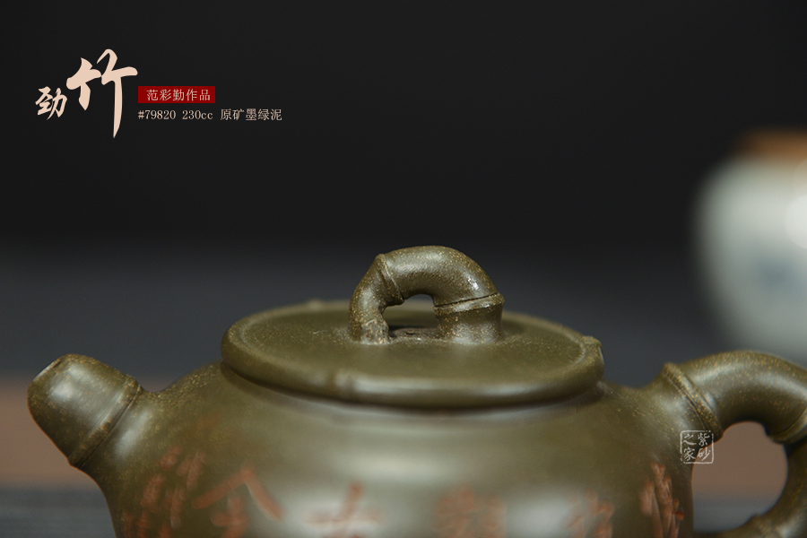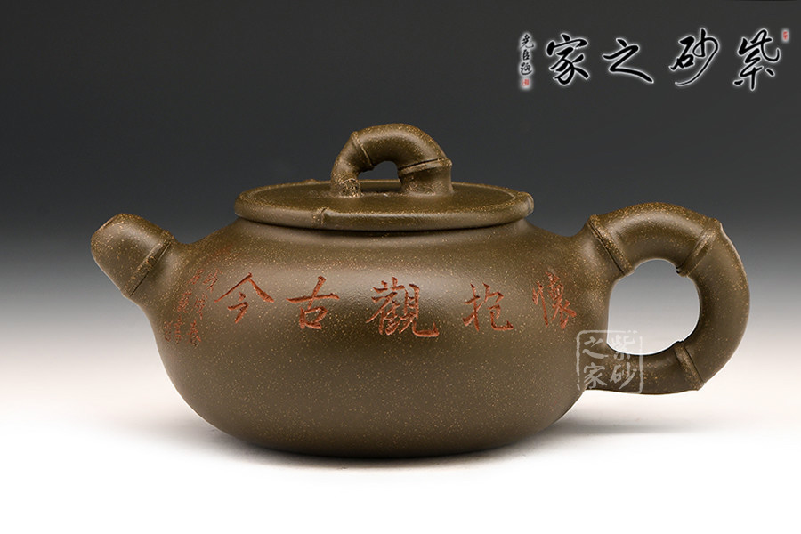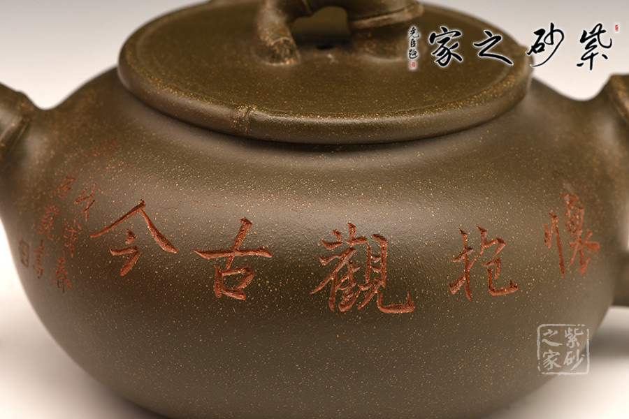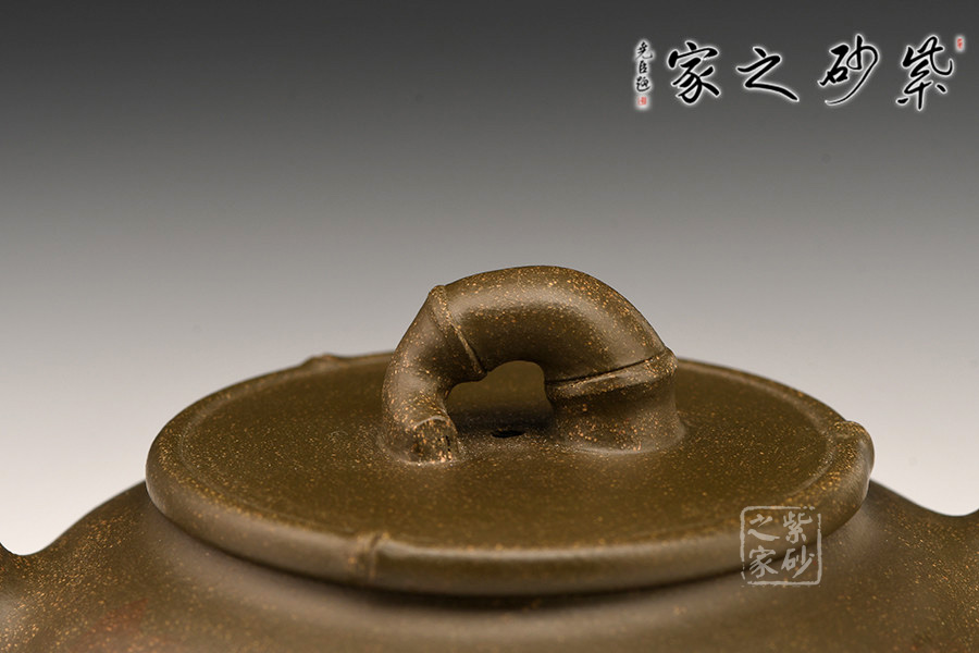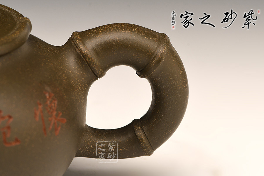 此款勁竹壺適度地表現(xiàn)出竹子的韻味。壺身扁圓,似一段極為飽滿的竹段,穩(wěn)重自然。整壺處處蘊涵了竹的細節(jié),壺嘴、壺把、壺鈕均采用竹節(jié)制作,粗壯有力,環(huán)環(huán)緊扣,別有趣味。作品秀雅端莊,透出一股古樸韻味,端莊大方,老味十足,色澤沉重扎實不妥協(xié)。