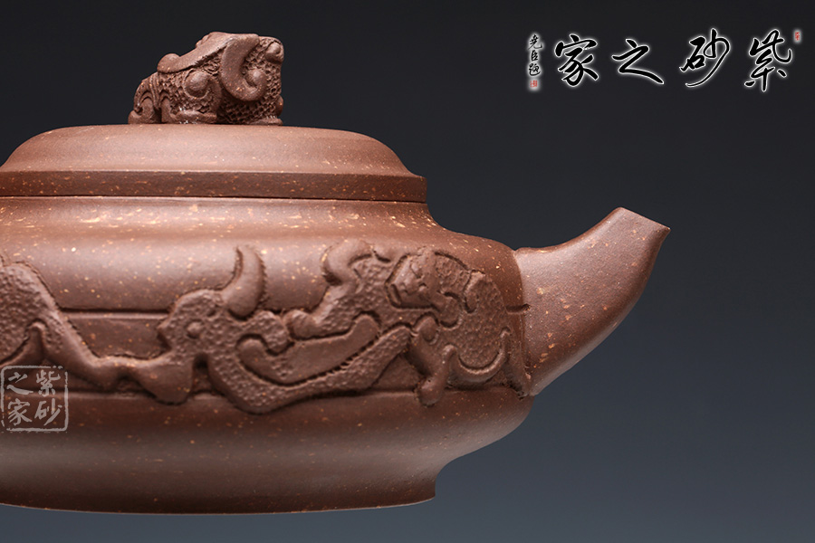 在民間有這樣的說(shuō)法:“摸摸獅子頭,萬(wàn)事不發(fā)愁”。此獅樽全體為原款紫泥精做而成,壺鈕成獅狀,精雕細(xì)琢。加之壺身之上雕塑的紋路及壺把上的裝飾設(shè)計(jì),細(xì)節(jié)到位,意境深遠(yuǎn),更顯其古意盎然、威儀凜凜又憨態(tài)可掬。