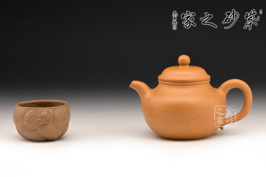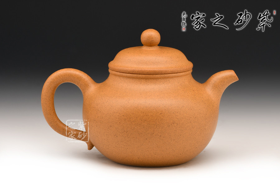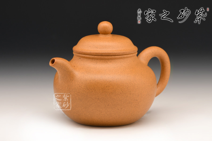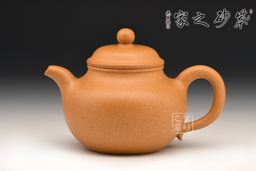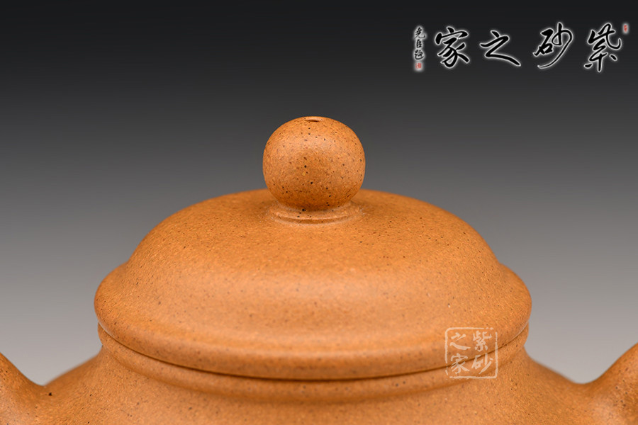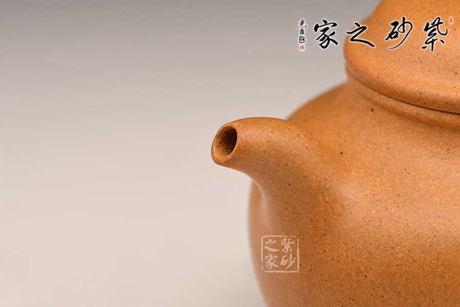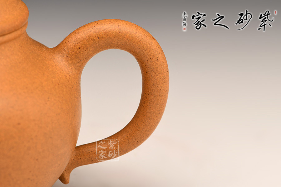 此作制作手法洗煉,泥料精良堅致,呈色橙紅鮮艷,潤澤如秋水,以手工拍制而成,壺形圓渾飽滿,頗為討喜。