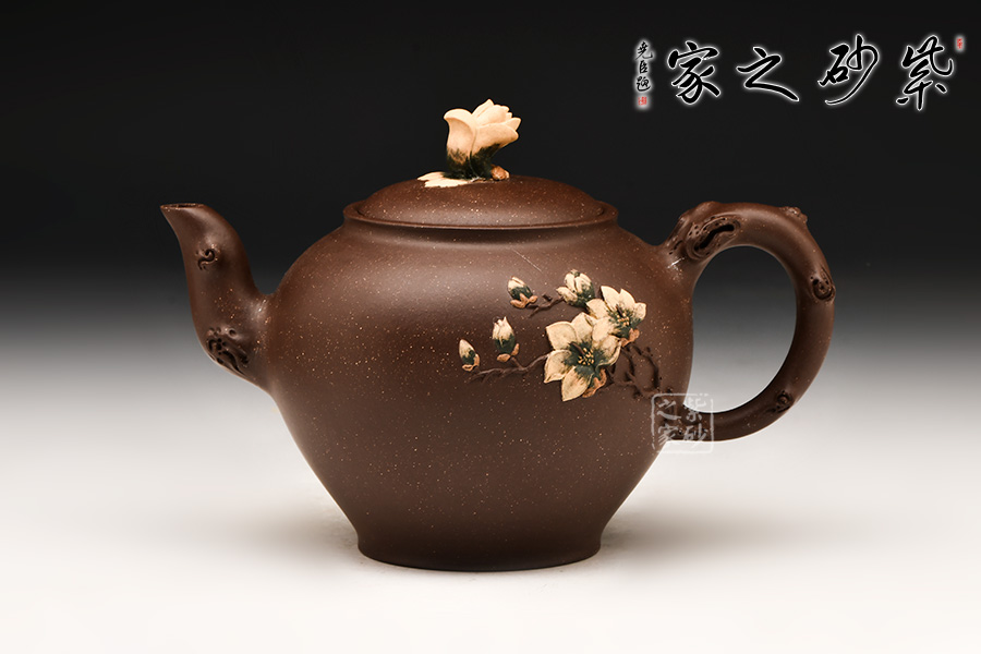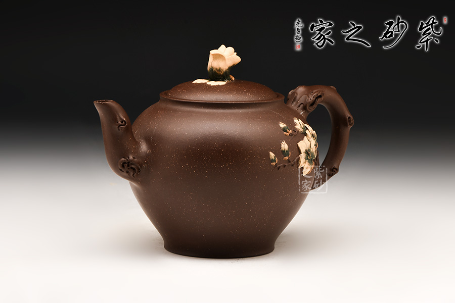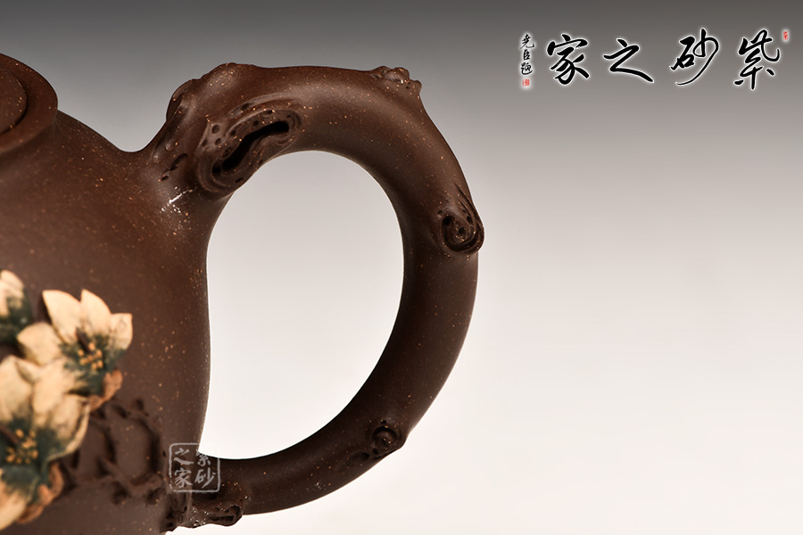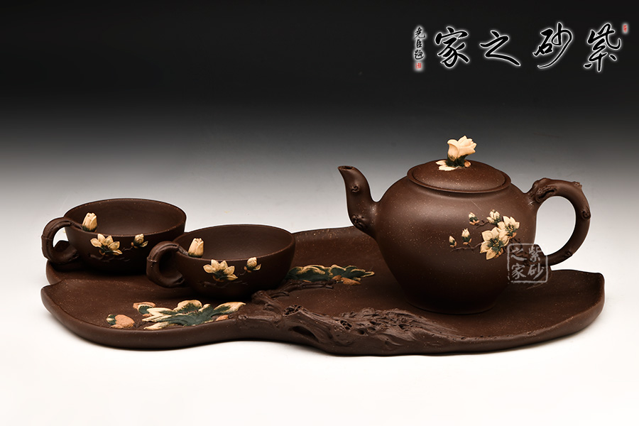 壺身雙色泥工藝貼塑梅花嫩葉,生機勃勃。一壺二杯一底盤,送禮自用皆宜。