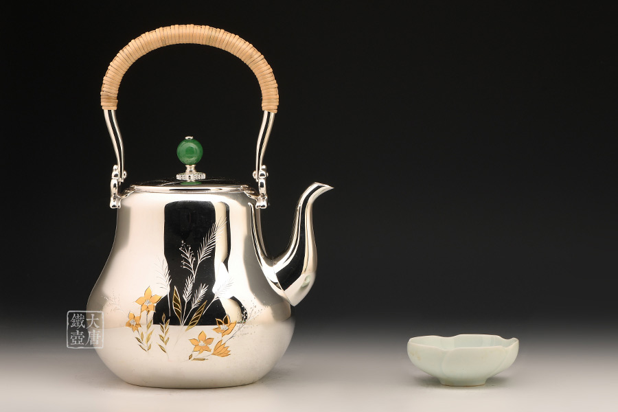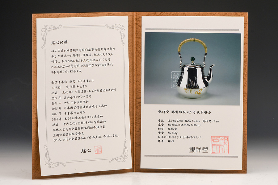銀祥堂與銀壺名家森川榮月老師曾合作交流設(shè)計(jì)限定款 山·月·鹿銀壺。以及與日展理事,著名雕刻家南部祥云先生合作交流創(chuàng)作了四瑞銀壺。并突破性的制作了耳口出一張打銅壺。