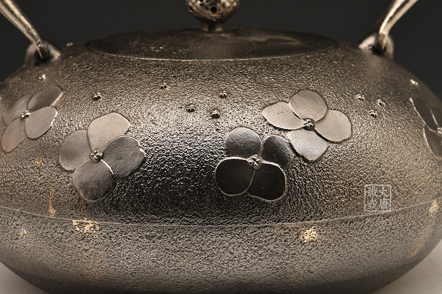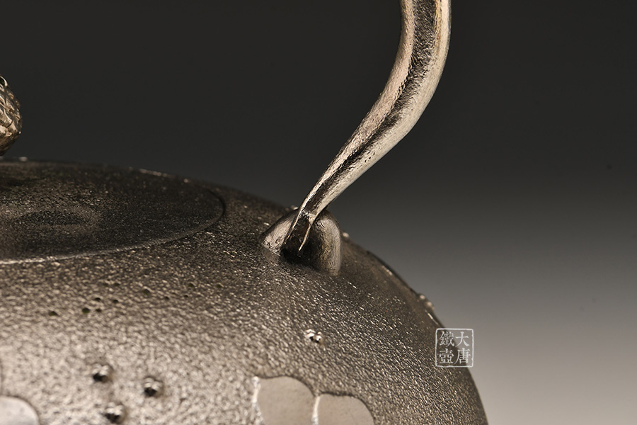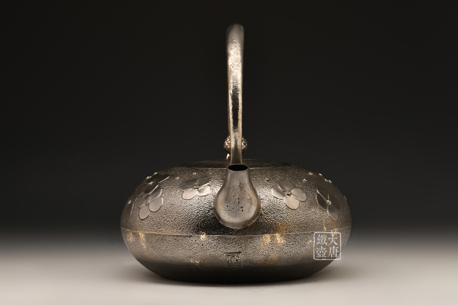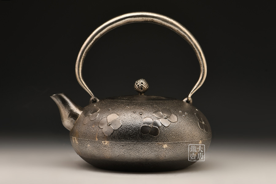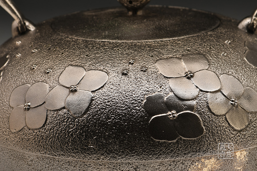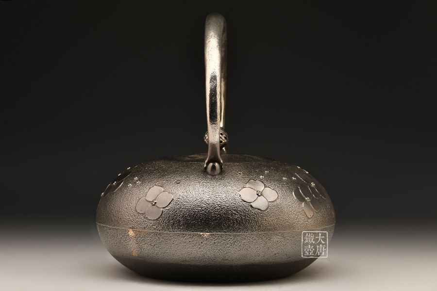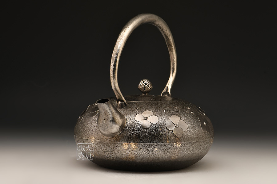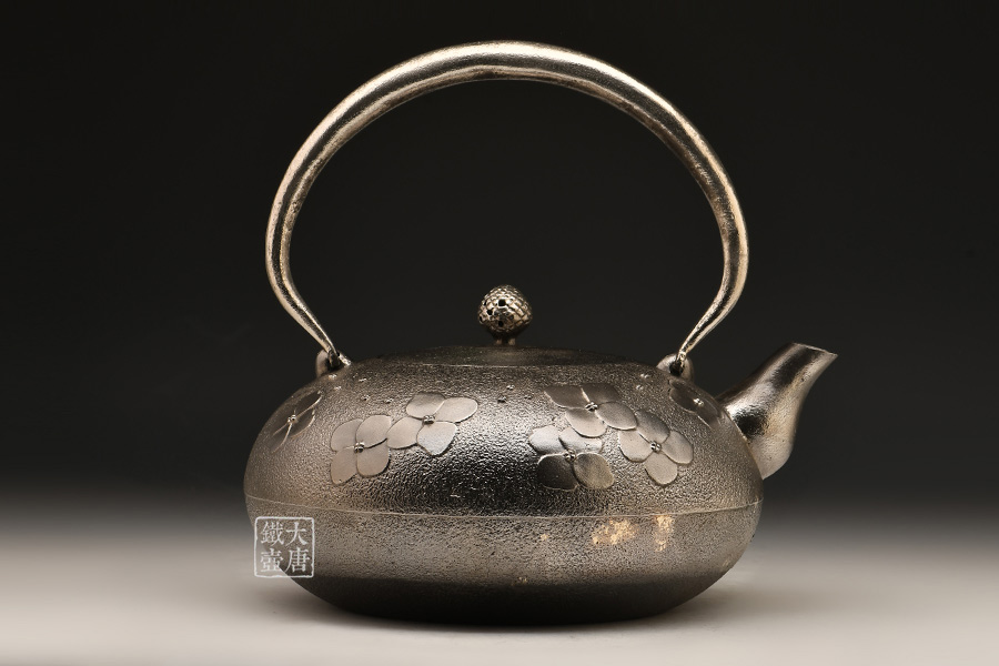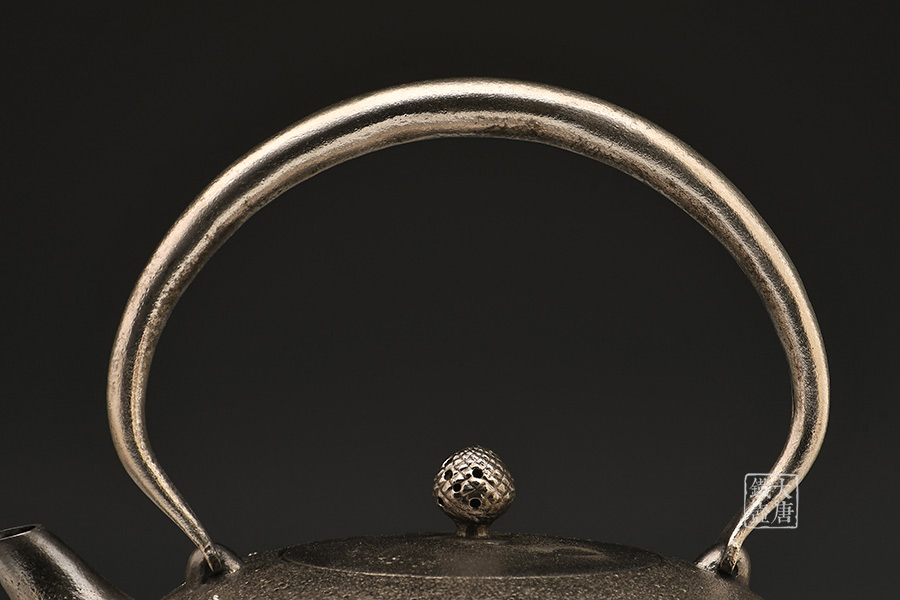 南部名家田山和康匠心手作,砂鐵制,經(jīng)典布團型,紫陽花紋飾,整器圓潤飽滿,鐵肌細(xì)膩潤和,搭配夾把式蟲蝕提梁,大氣簡約,品質(zhì)非凡。