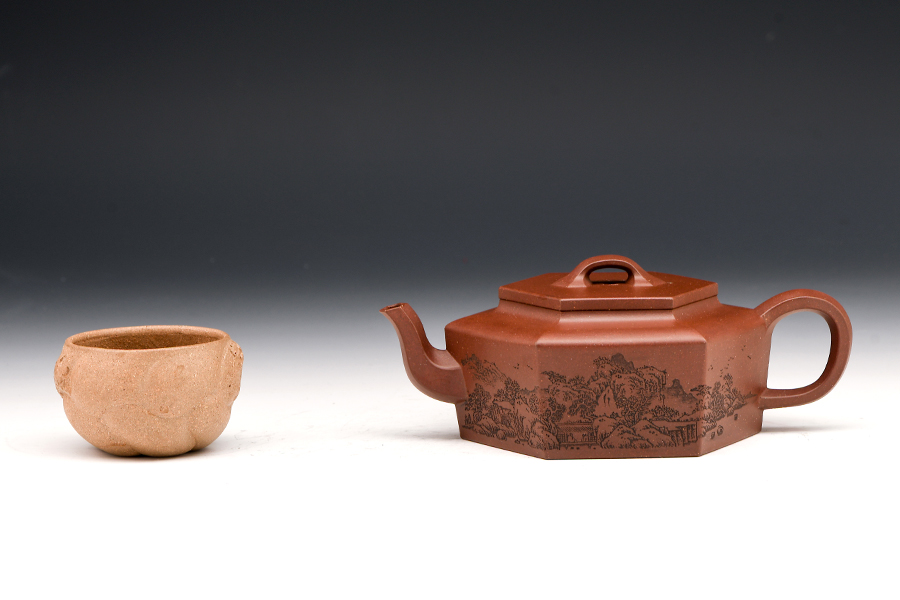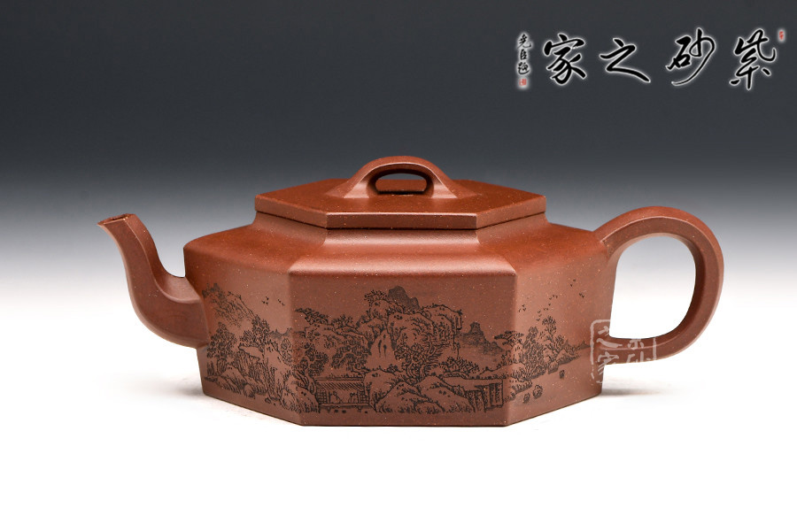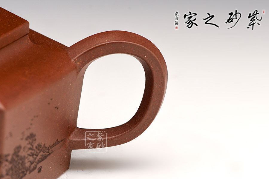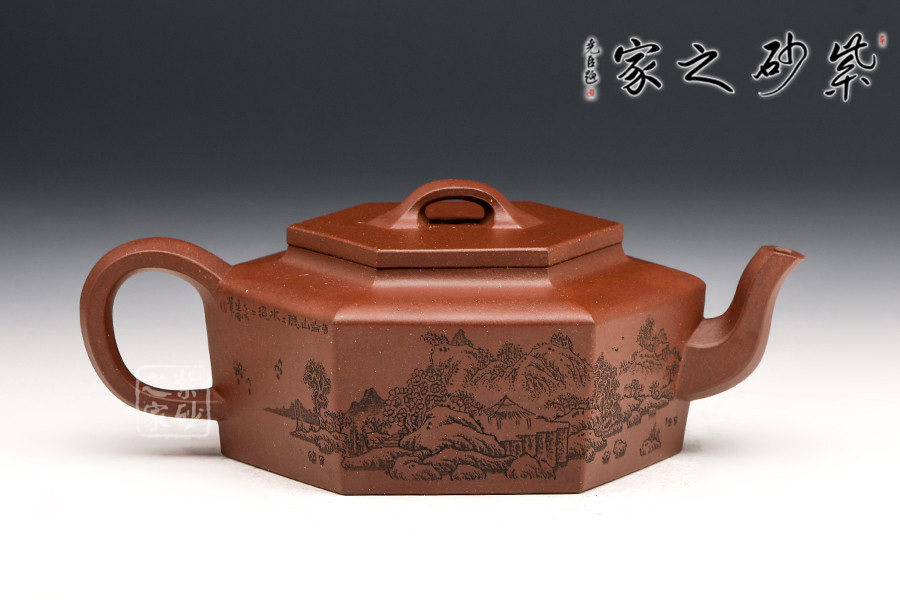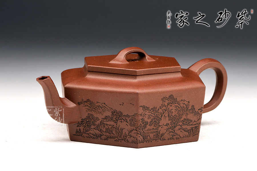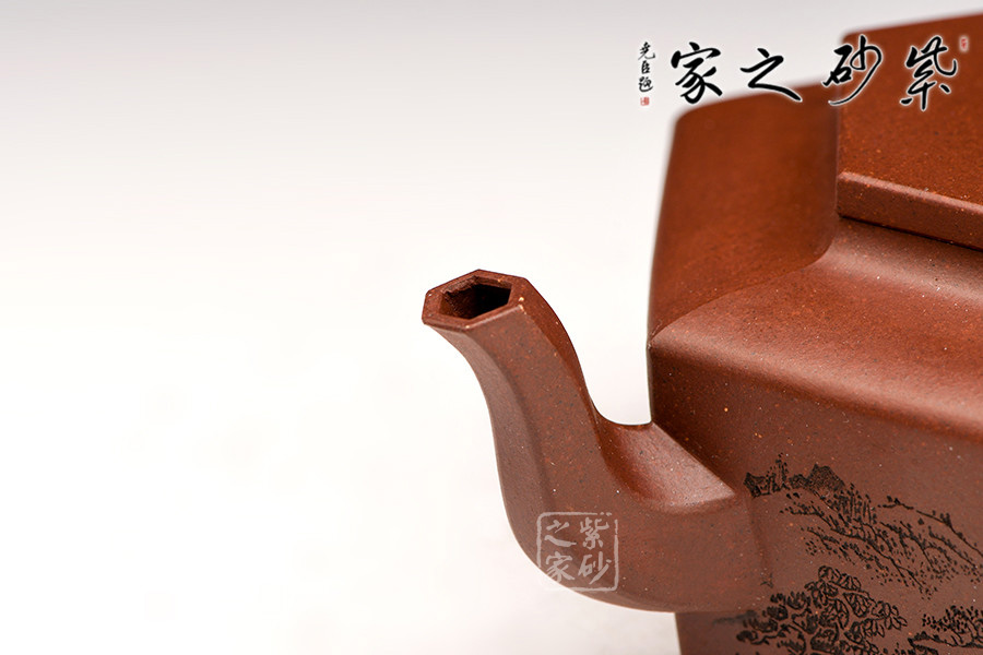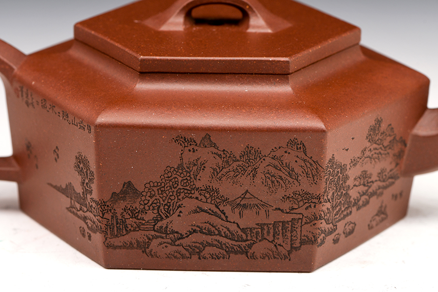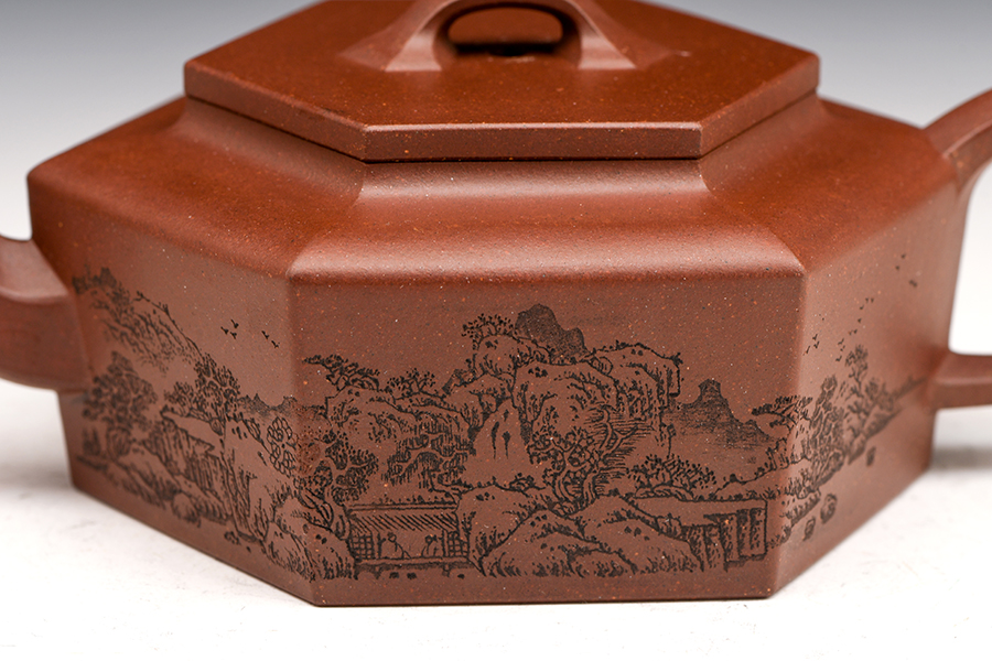壺體線條明朗,上密下疏,滿滿的視覺張力。壺體、把、流、鈕等形式要素,均由不同大小的六邊形線面融合構(gòu)成,統(tǒng)一和諧,敦厚樸拙,恰點(diǎn)山水裝飾之題,令人賞心悅目。