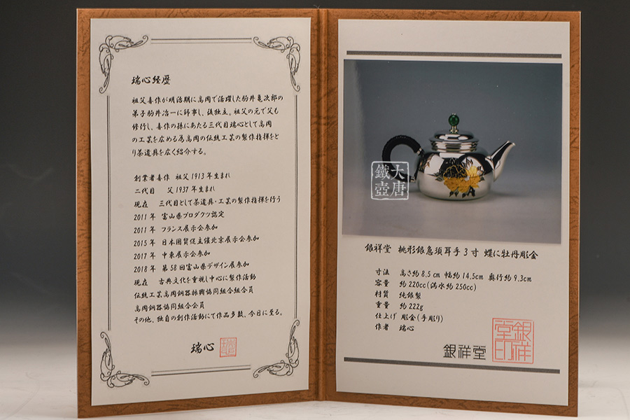 銀祥堂,誕生于工藝之鄉(xiāng)的匠人世家。銀祥堂堂主瑞心的祖父,是一位佛具匠人。師從于明治時期活躍在高岡的名人駒井龜次郎的弟子駒井冶一,后與金箔匠人兒子,瑞心的父親一起創(chuàng)建了佛具工房。在不斷擴大工房規(guī)模影響的同時,大力普及推廣高岡的銅器,香爐及茶具。其祖父與多位著名藝術家關系甚密。曾是已故日展(日本最高級別藝術展)理事大角勲先生的金工資助人。