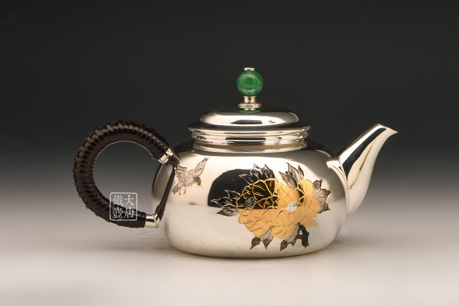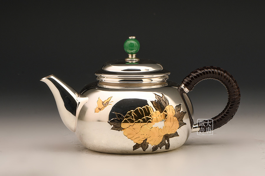 銀祥堂 3寸桃形牡丹紋翡翠壺摘耳手急須 220cc [ 編號:80165 ]