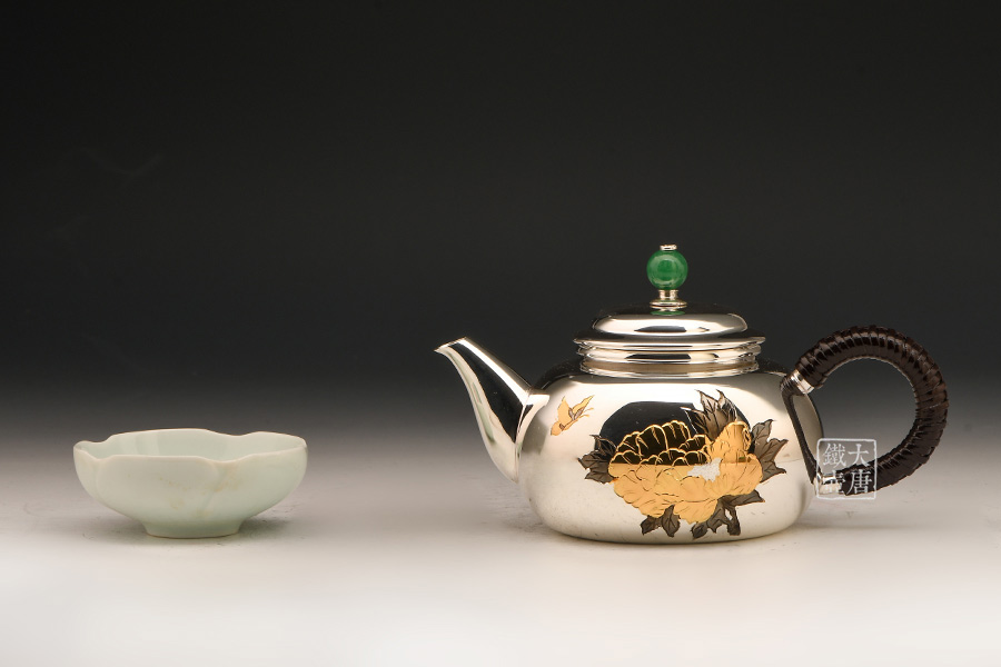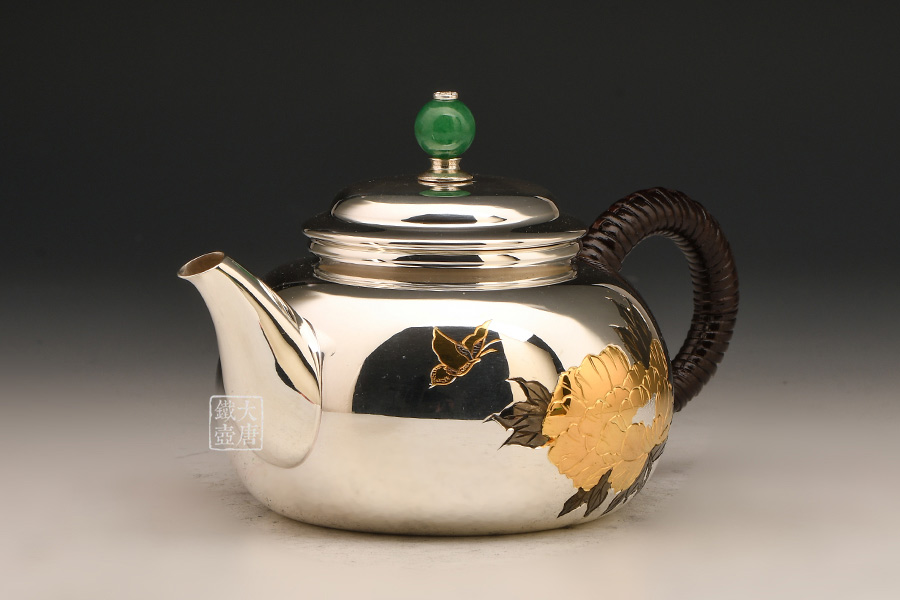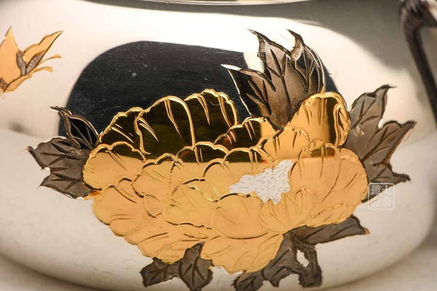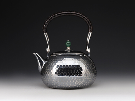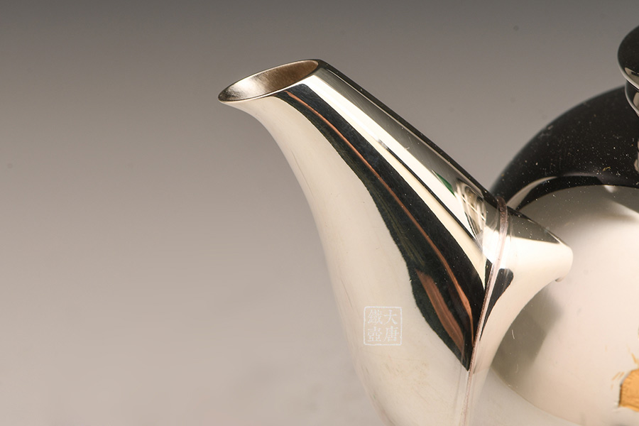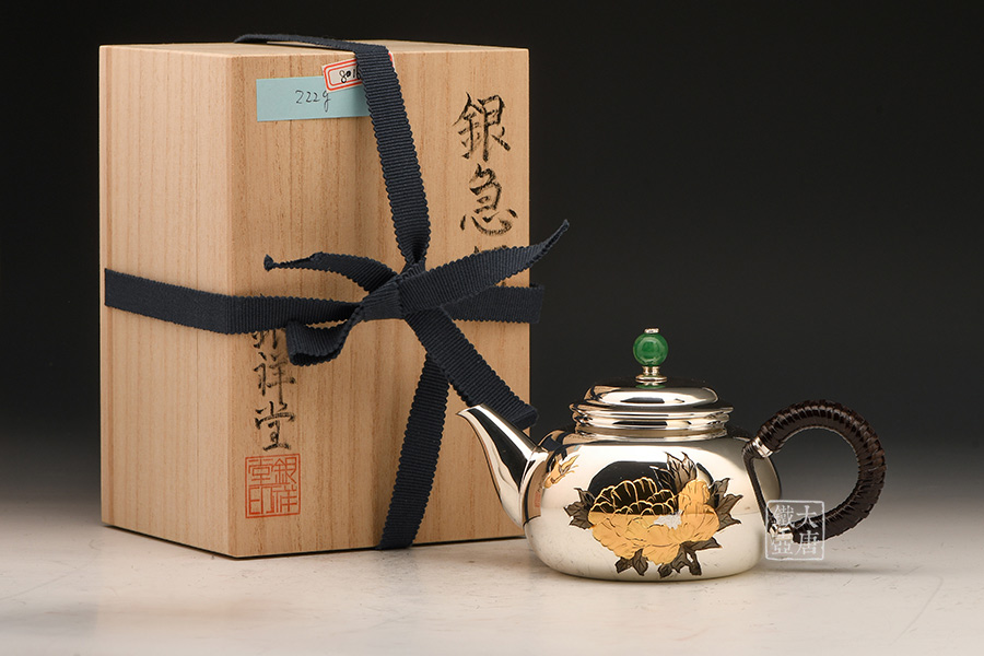 銀祥堂與銀壺名家森川榮月老師曾合作交流設計限定款 山·月·鹿銀壺。以及與日展理事,著名雕刻家南部祥云先生合作交流創(chuàng)作了四瑞銀壺。并突破性的制作了耳口出一張打銅壺。