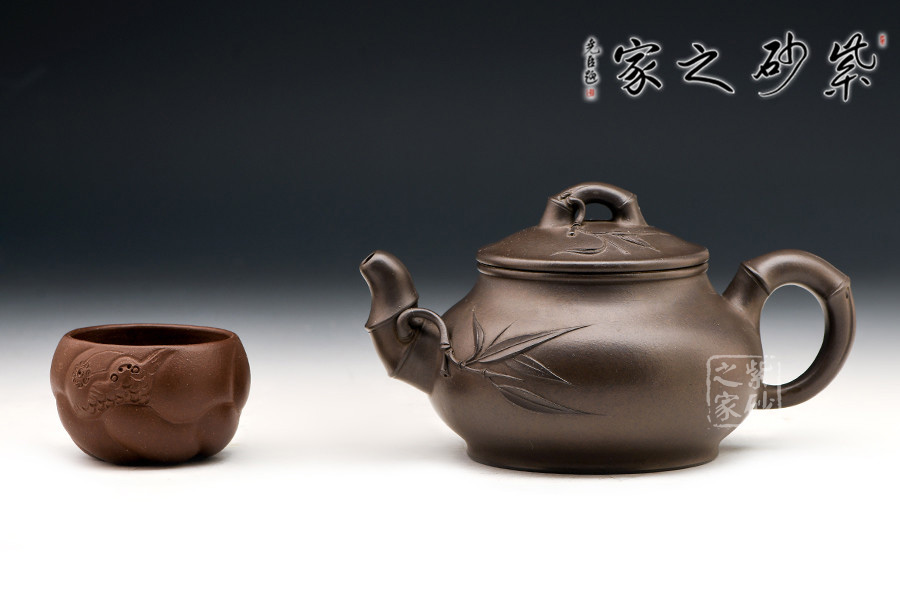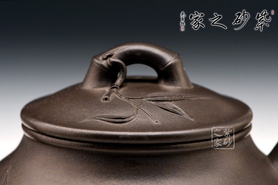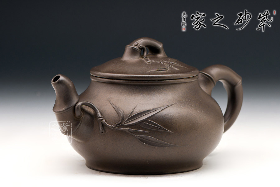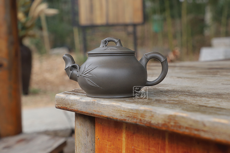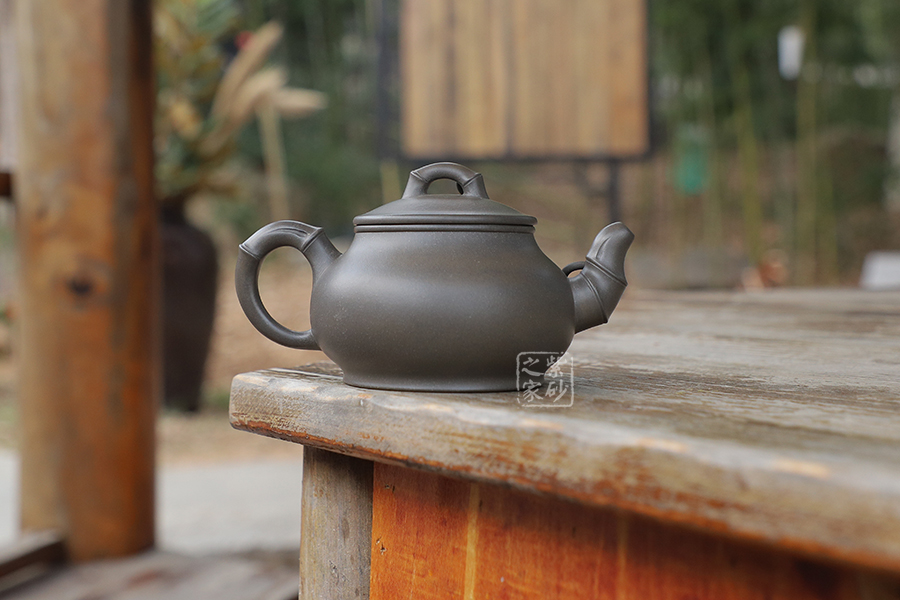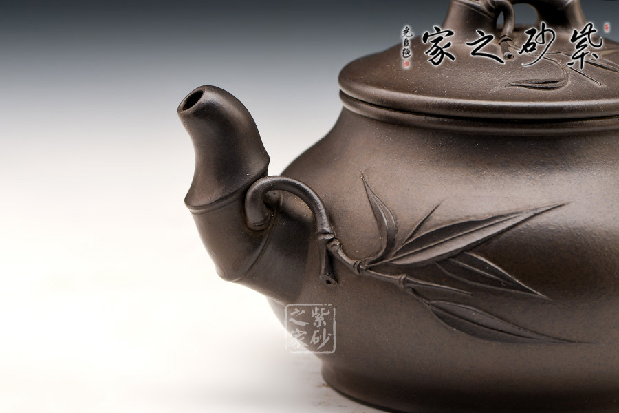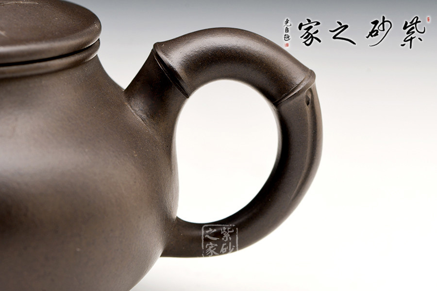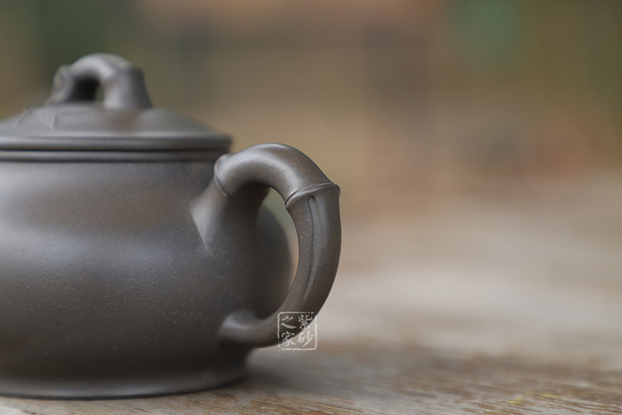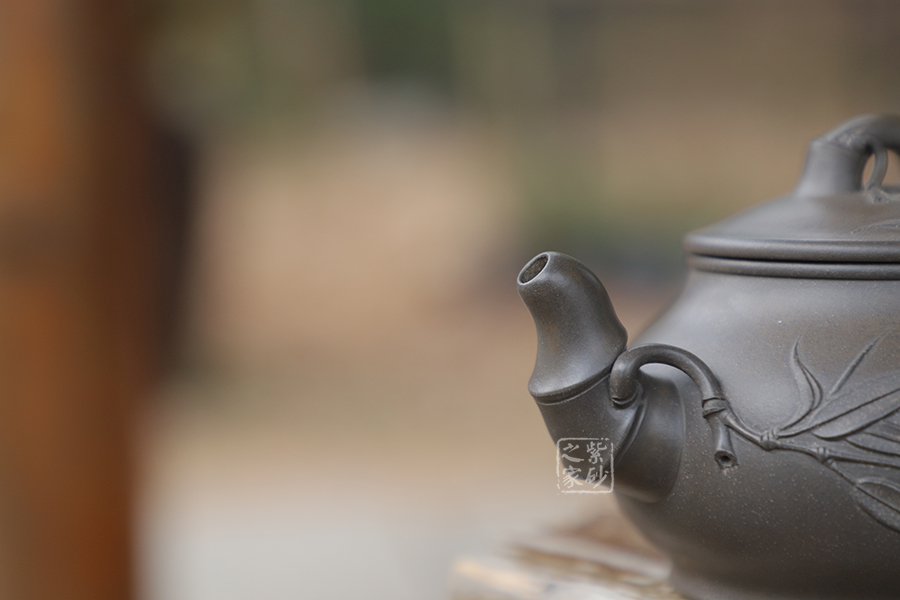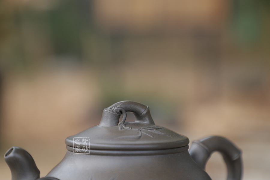 宜興紫砂常以竹為題材,皆因宜興地區(qū)多產(chǎn)竹,且竹之清品一向為文人墨客所推崇。 此壺取名竹蘊,作圓式,嘴、把、鈕采用竹節(jié)裝飾,整器更添幾分圓潤之感。