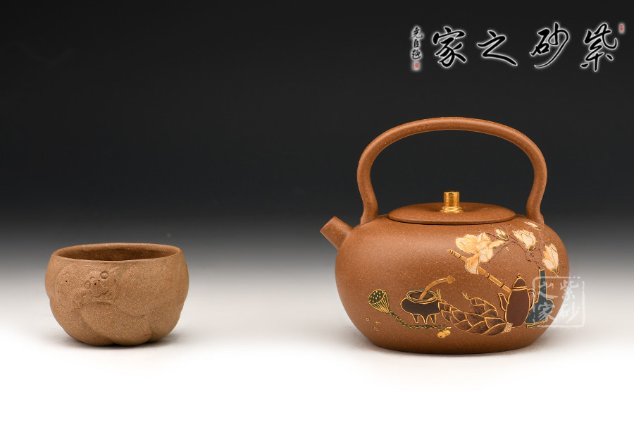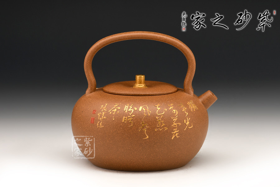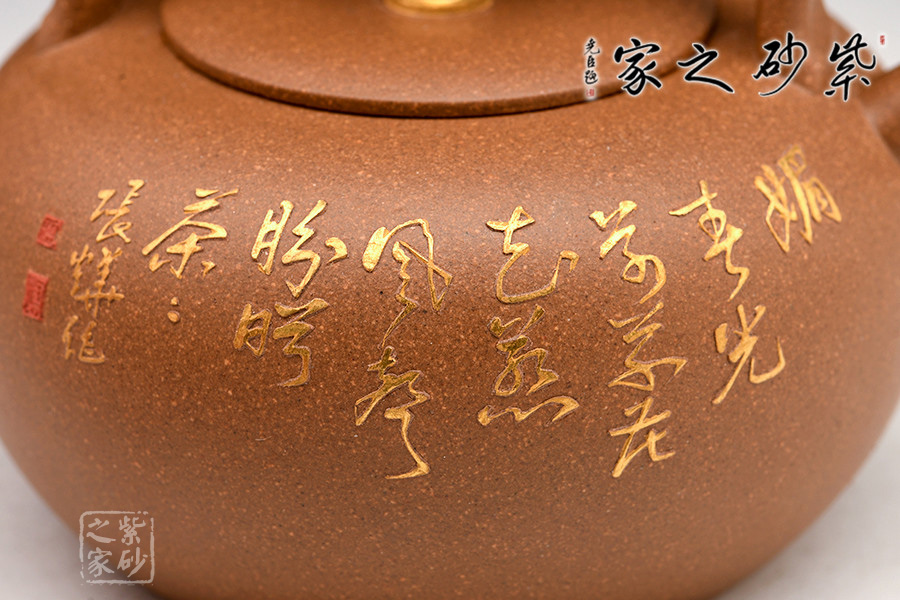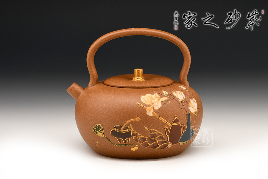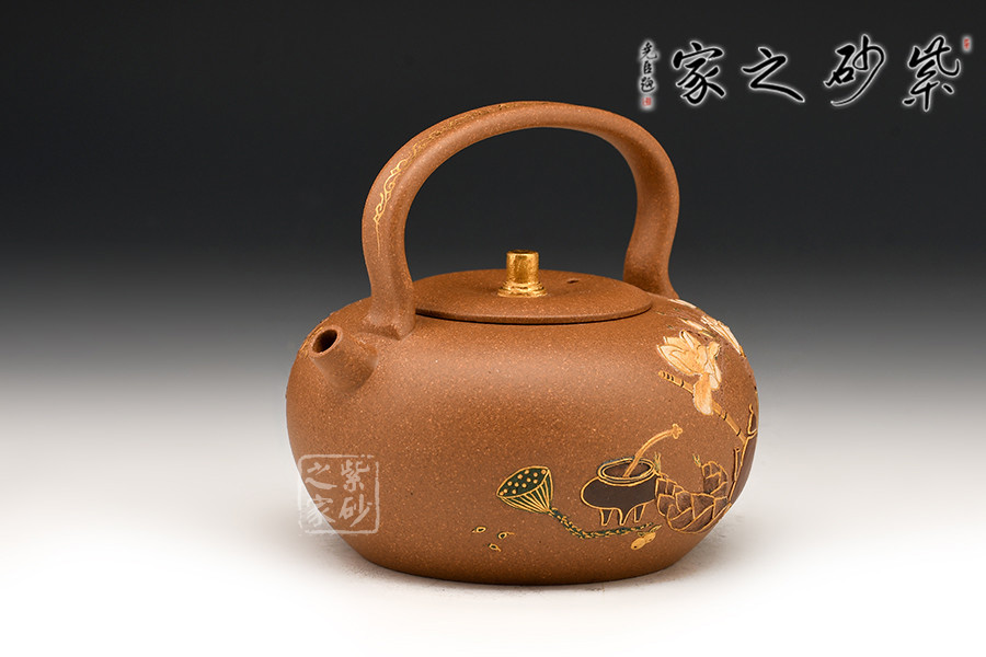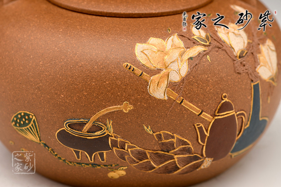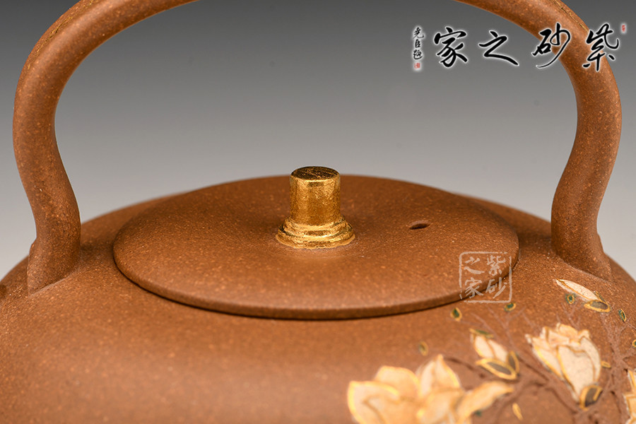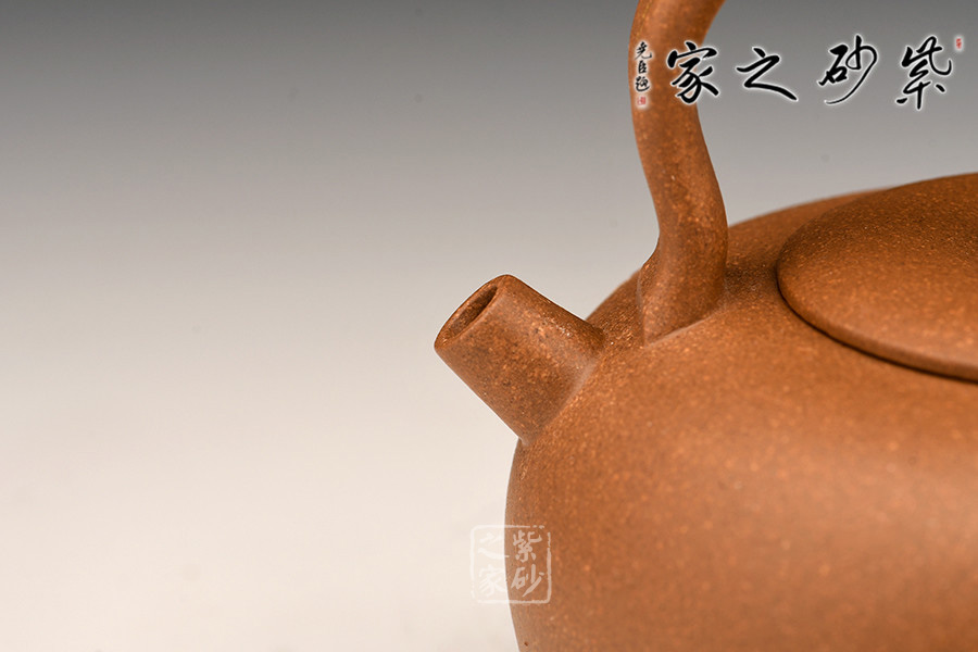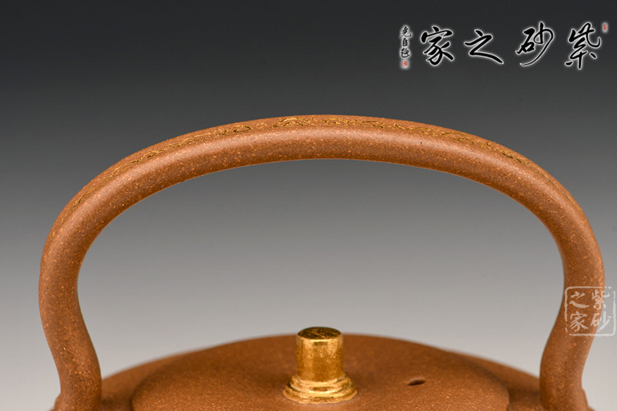 此作造型敦厚可愛(ài),短直嘴出水爽利,提梁把設(shè)計(jì)大氣簡(jiǎn)約。壺身之上的裝飾又增添了作品的貴氣怡人的氣質(zhì)。