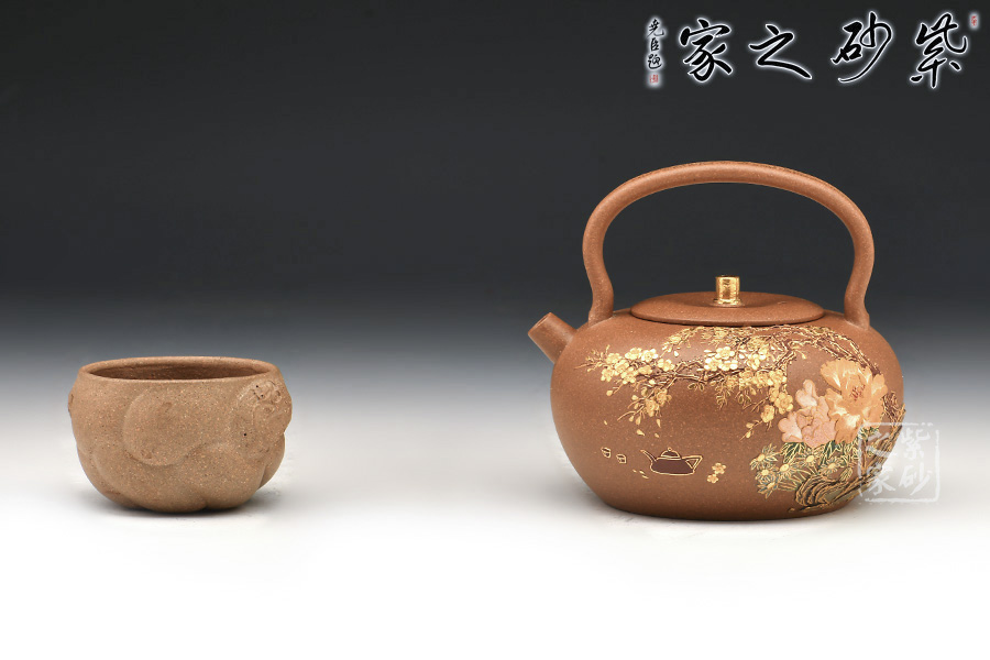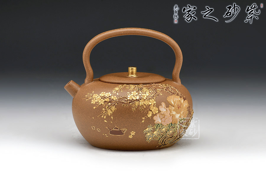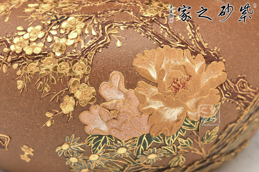以花為題,作花間茶事壺,壺身的泥繪色彩與形態(tài)結合為一體,講究形神具意,花朵、嫩葉走勢自然,留白更是恰到好處。