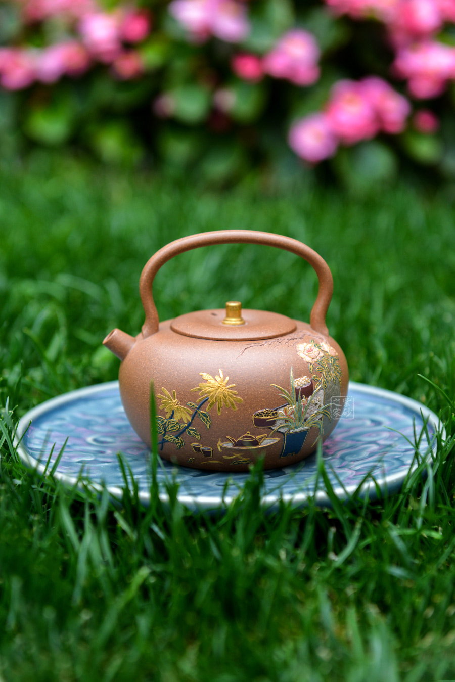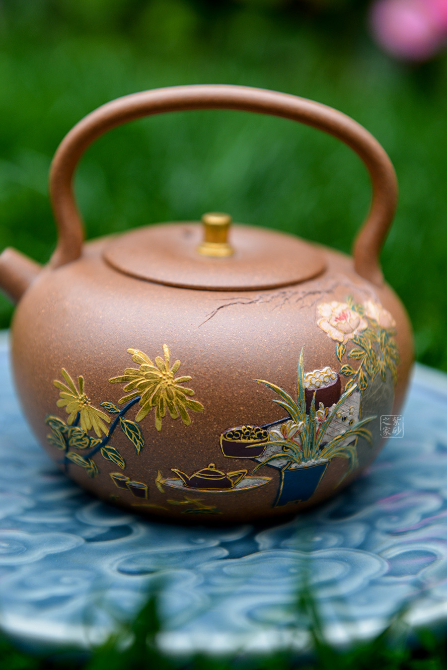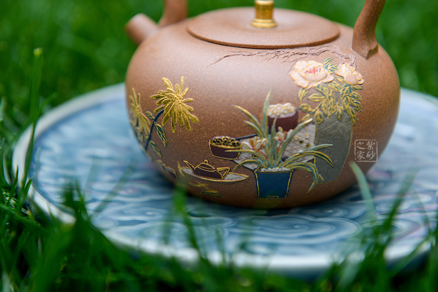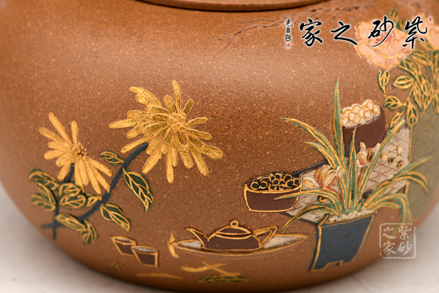 以花草棋盤為題,壺身的泥繪色彩與形態(tài)結(jié)合為一體,講究形神具意,走勢(shì)自然,留白更是恰到好處。