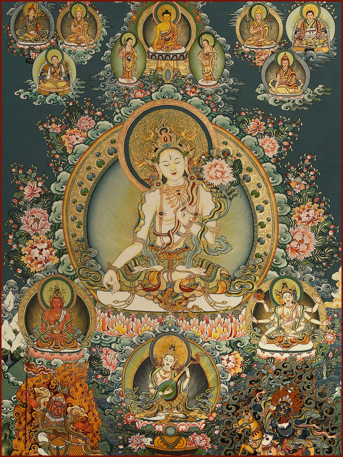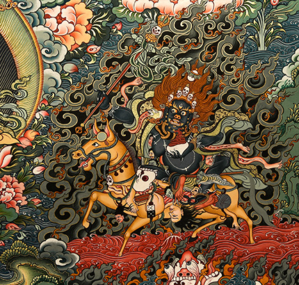 | 唐卡是歷史的瑰寶,現(xiàn)已被例入國(guó)家非物質(zhì)文化遺產(chǎn)名錄,得到了高度的重視和保護(hù)。同時(shí)由于顏料的珍稀、繪制周期長(zhǎng)、工藝復(fù)雜大大增強(qiáng)了其珍藏價(jià)值。一幅好的作品可遇不可求,近年來唐卡已成為收藏界炙手可熱的藏品。 | 唐卡的形式便于攜帶,其內(nèi)容體現(xiàn)了藏傳佛教的莊重、神圣、華貴,被稱為“移動(dòng)的佛像”。同時(shí)也是修行者積累善業(yè),追尋心靈的平靜與安寧的一個(gè)過程。 | 唐卡的內(nèi)容包羅萬象,它以圖像的方式承載著藏族文化精髓,是藏族智慧的結(jié)晶,廣泛傳播了藏地的文化、歷史和宗教理論。 | 唐卡絢麗的色彩、流暢的線條、嚴(yán)謹(jǐn)?shù)慕Y(jié)構(gòu),都充滿著濃郁的高原和游牧民族風(fēng)情,無疑是難得的藝術(shù)珍品。值得一提的是唐卡繪制顏料全部為天然礦物顏料,畫面效果艷麗,可以保存千年而不變色。 |