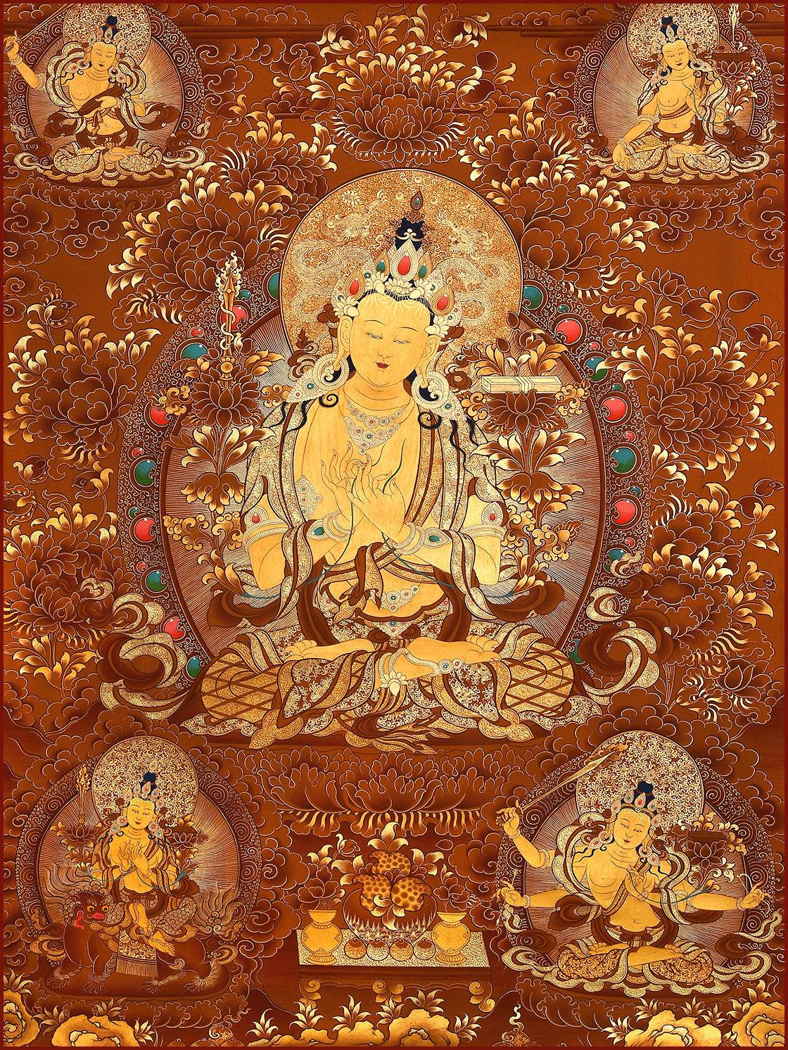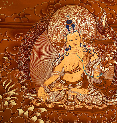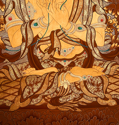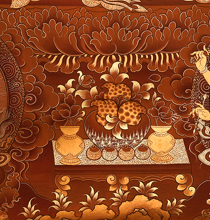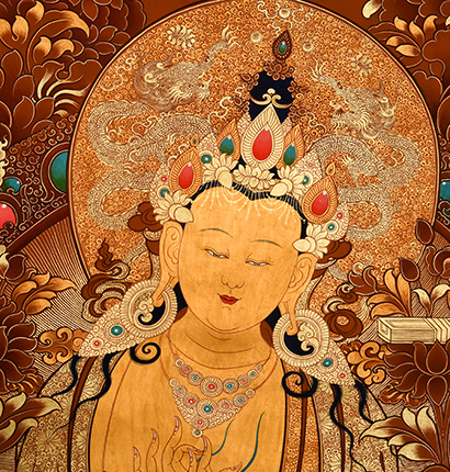 | 唐卡是歷史的瑰寶,現(xiàn)已被例入國(guó)家非物質(zhì)文化遺產(chǎn)名錄,得到了高度的重視和保護(hù)。同時(shí)由于顏料的珍稀、繪制周期長(zhǎng)、工藝復(fù)雜大大增強(qiáng)了其珍藏價(jià)值。一幅好的作品可遇不可求,近年來(lái)唐卡已成為收藏界炙手可熱的藏品。 | 唐卡的形式便于攜帶,其內(nèi)容體現(xiàn)了藏傳佛教的莊重、神圣、華貴,被稱(chēng)為“移動(dòng)的佛像”。同時(shí)也是修行者積累善業(yè),追尋心靈的平靜與安寧的一個(gè)過(guò)程。 | 唐卡的內(nèi)容包羅萬(wàn)象,它以圖像的方式承載著藏族文化精髓,是藏族智慧的結(jié)晶,廣泛傳播了藏地的文化、歷史和宗教理論。 | 唐卡絢麗的色彩、流暢的線條、嚴(yán)謹(jǐn)?shù)慕Y(jié)構(gòu),都充滿著濃郁的高原和游牧民族風(fēng)情,無(wú)疑是難得的藝術(shù)珍品。值得一提的是唐卡繪制顏料全部為天然礦物顏料,畫(huà)面效果艷麗,可以保存千年而不變色。 |