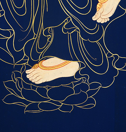 | 唐卡“師傅”開臉,筆路穩重流暢。體現完美天人相,可見佛菩薩慈眉善目,賦予唐卡畫像生的靈氣。 | 細節決定品質,點睛之筆不到位影響整體美觀,五官比例不協調,面目呆板,缺乏靈氣。 |
