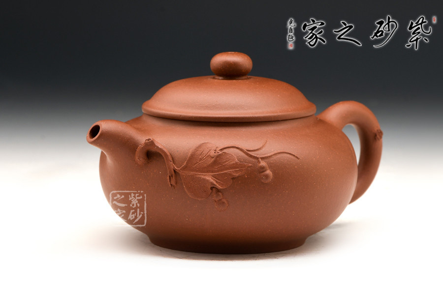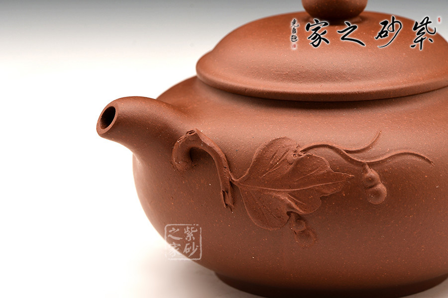 葫蘆壺取形于葫蘆瓜,型如實物,充滿情趣,為圓底形,其嘴、鋬自然流暢,線條優(yōu)美渾圓。