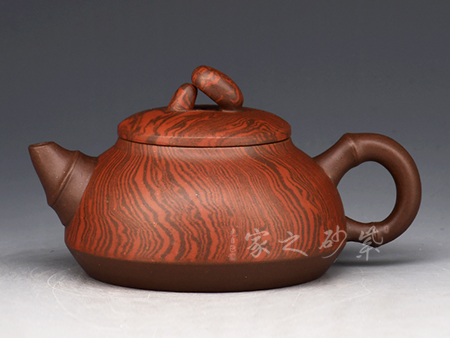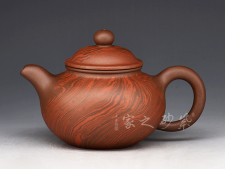 特點:塊狀中有青綠色的"雞眼"、"貓眼"、色呈偏紫泛青,細(xì)而純正, 十分稀少.燒成的壺呈現(xiàn) 紅豬肝色,燒成顏色具體要看礦料的成分構(gòu)成和燒成溫度。