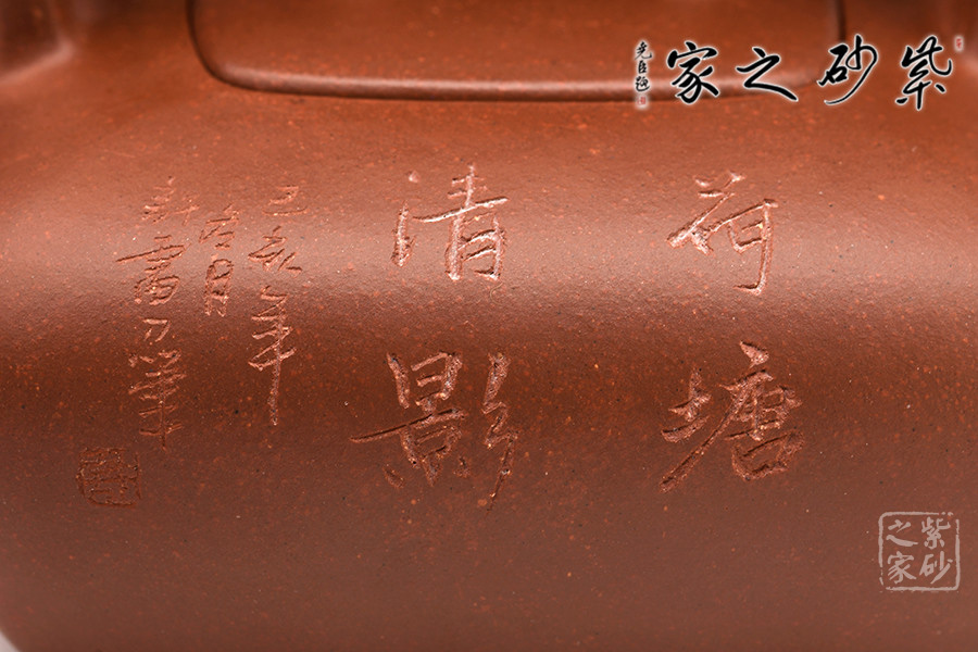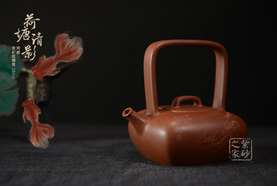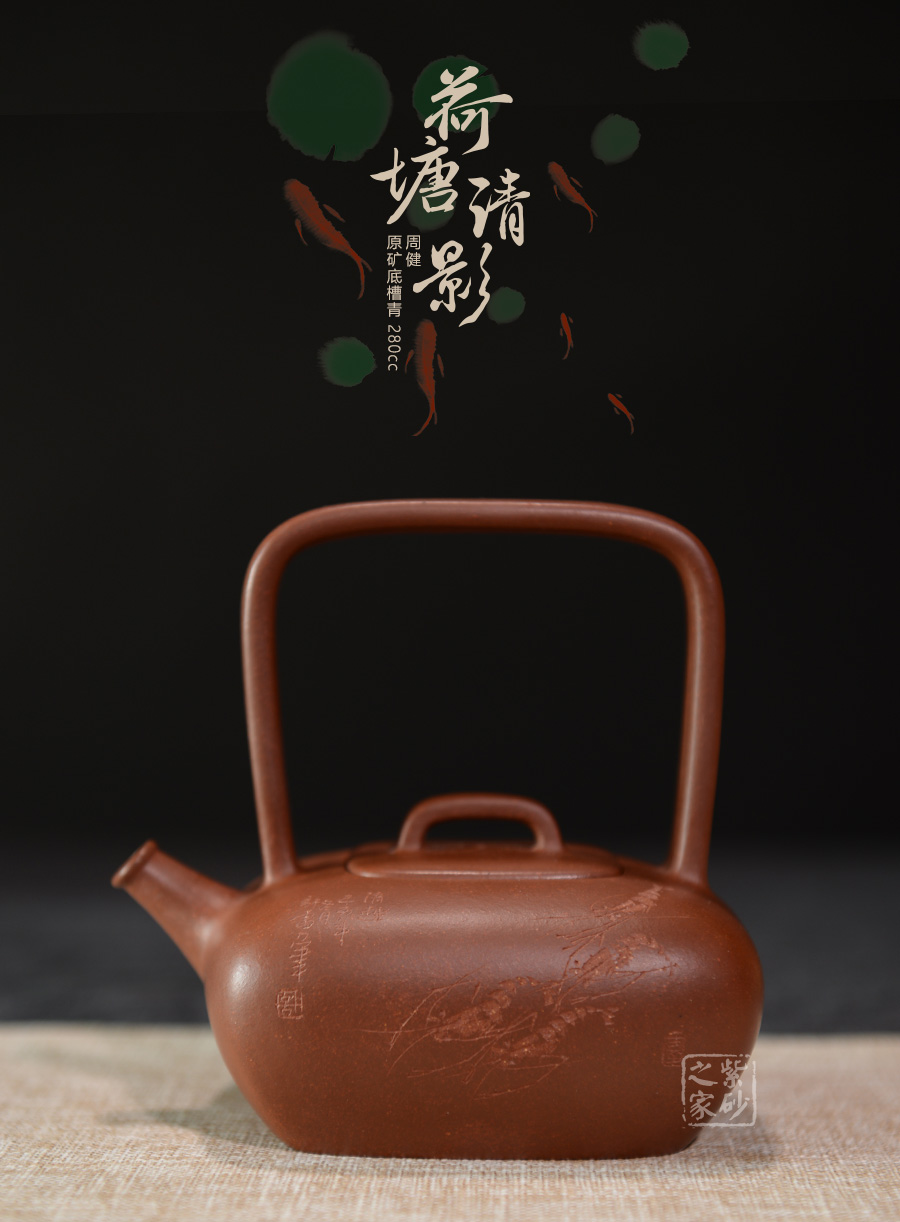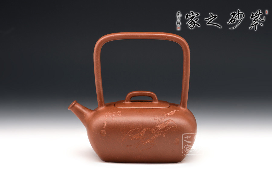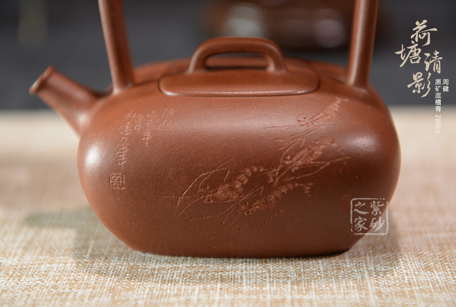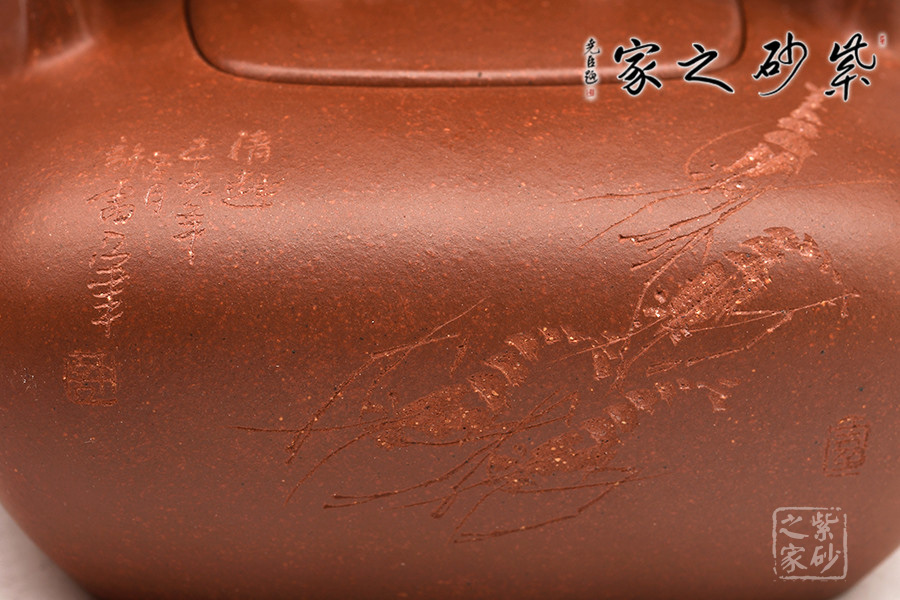 此壺壺身飽滿并采用混方的成型工藝制作,作者巧妙的將壺嘴設(shè)計成一個魚嘴的造型做為壺嘴,以及運用齊白石的蝦作為刻繪的裝飾,從中體現(xiàn)出作者對大自然的熱愛,以嵌蓋的設(shè)計理念。