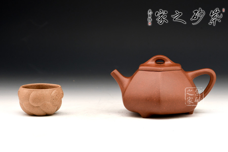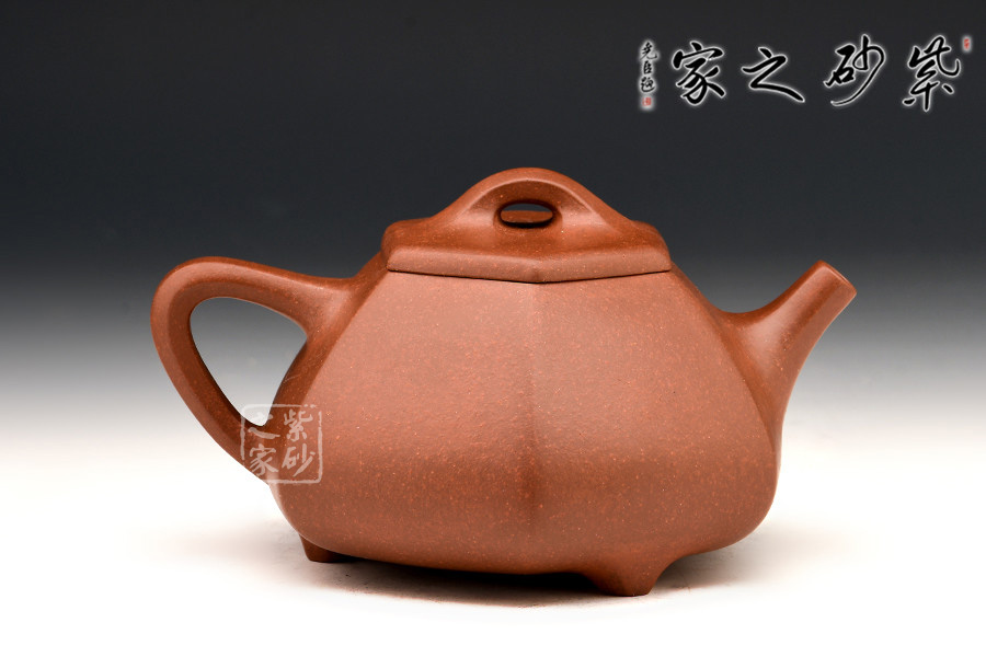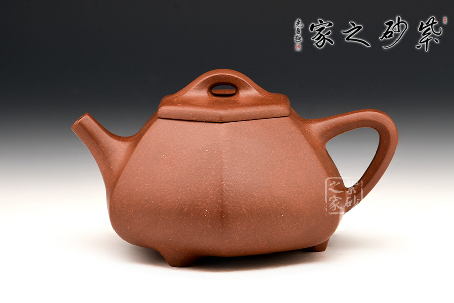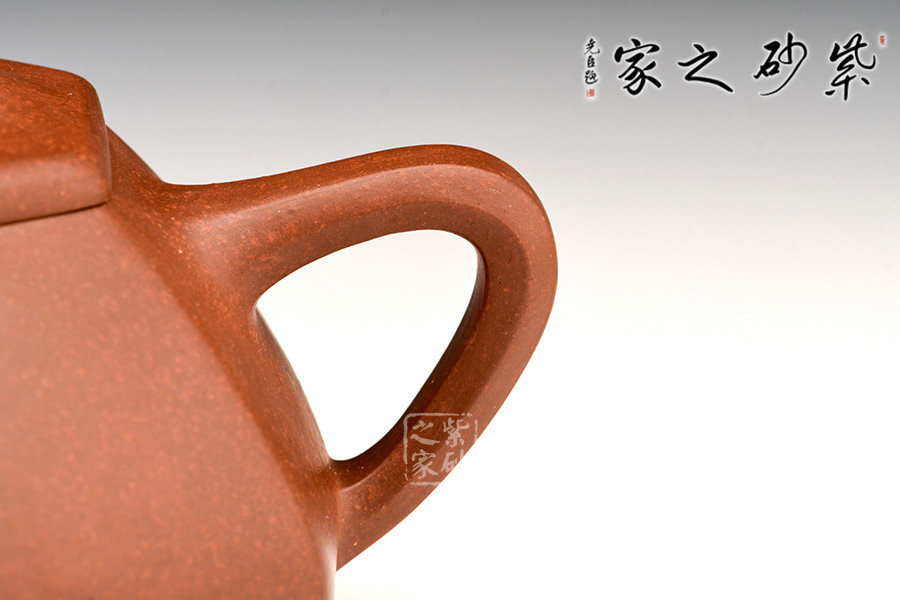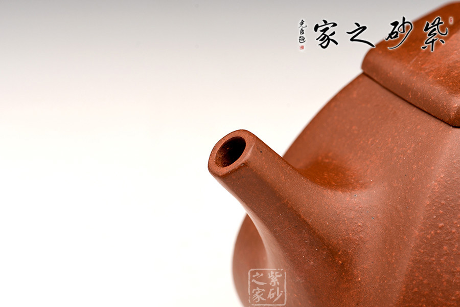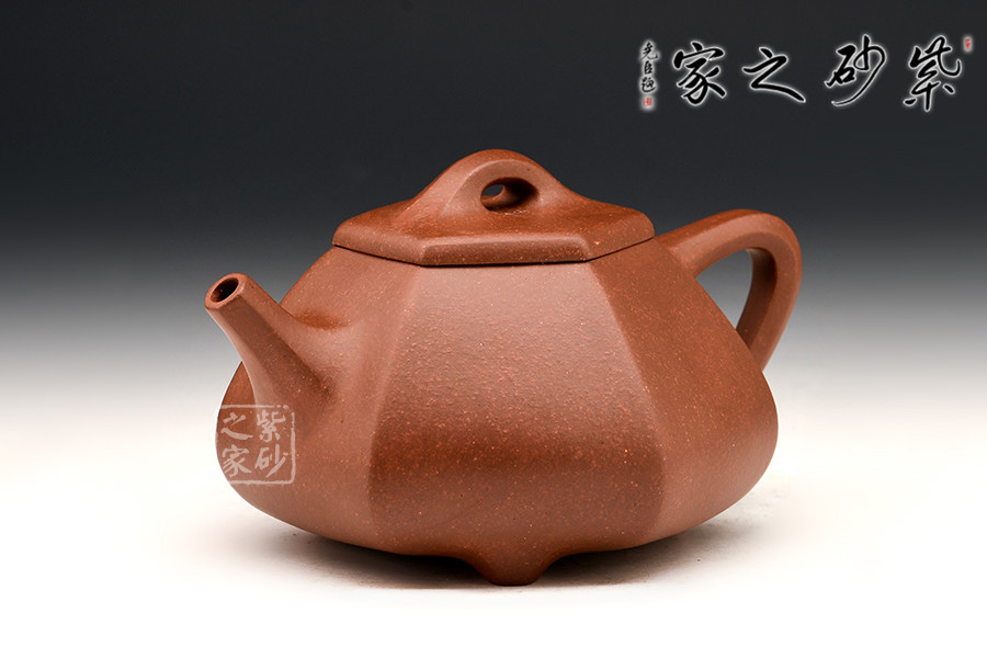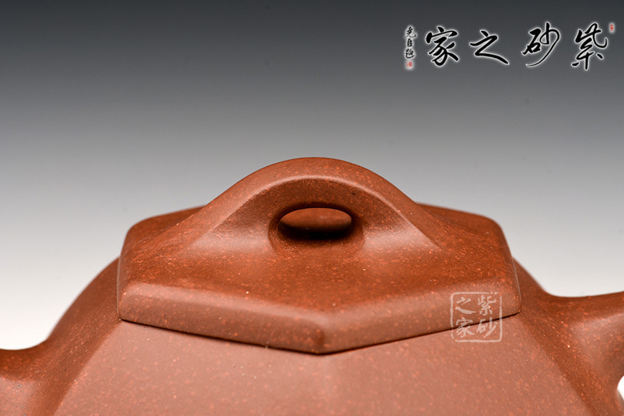 此作壺身呈六方,各處線條挺括流暢,方中寓圓,轉(zhuǎn)折如意。以六方制石瓢,通過(guò)直與曲、線與面的過(guò)渡和銜接,使整體造型統(tǒng)一協(xié)調(diào),呈現(xiàn)氣度。