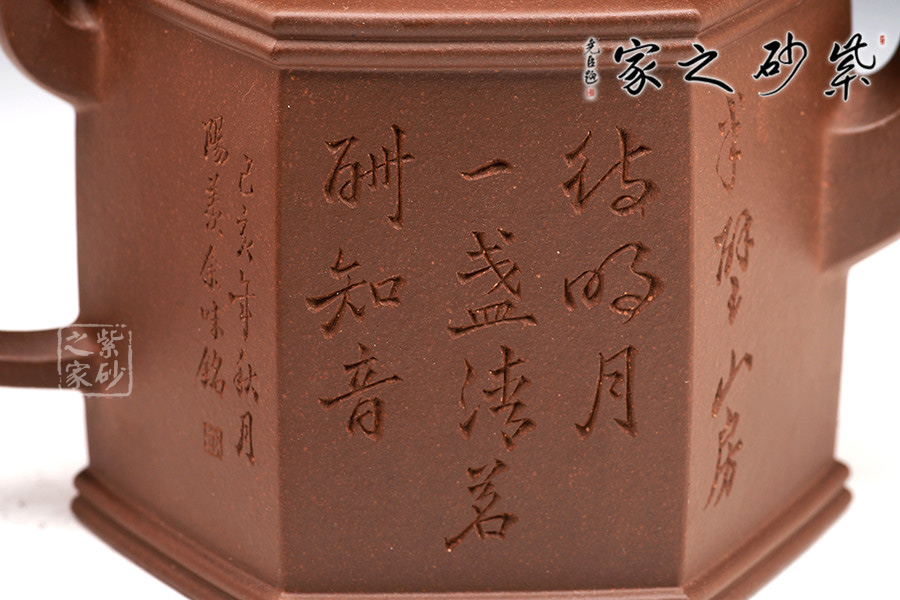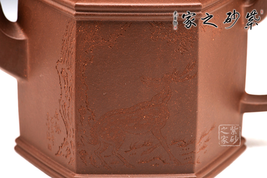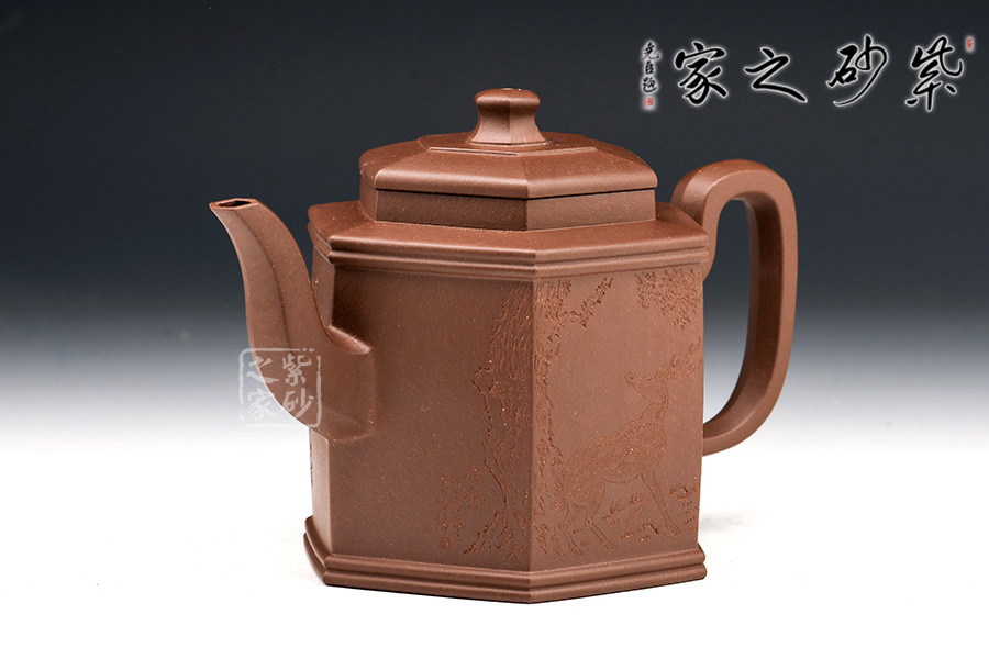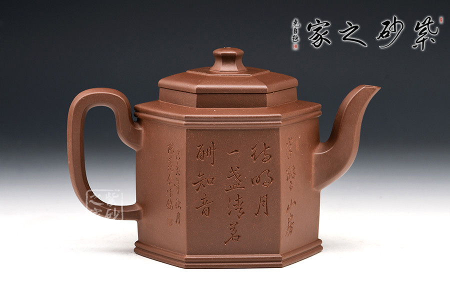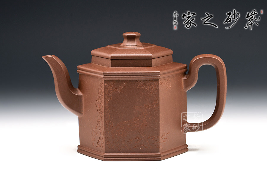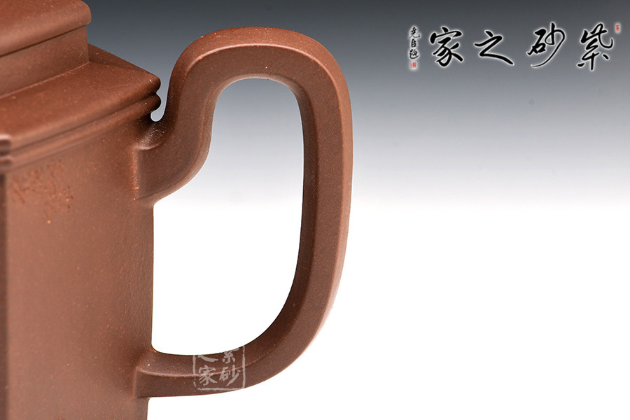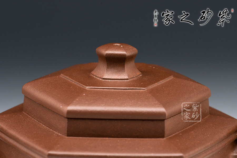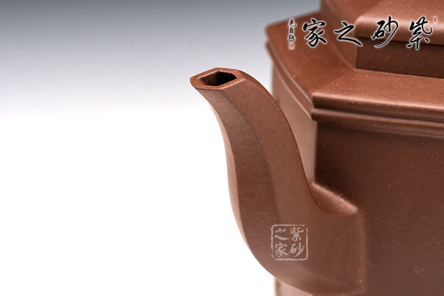 勁六方是一款經(jīng)典方器,此壺做工嚴(yán)謹(jǐn),且上手俱佳。壺身呈六棱柱型,壺蓋與壺口相對,亦呈六方形。壺的所有部位與壺形體相稱,混六方的小圓鈕剛?cè)岵?jì),不規(guī)則六棱形彎流壺嘴以及四方壺把,線面挺括平整,有棱有角。整體做到“方中寓圓,方中求變,口蓋劃一,剛?cè)嵯喾Q”,給人明秀挺快、干凈利落的陽剛之美。