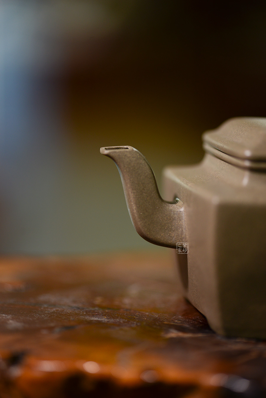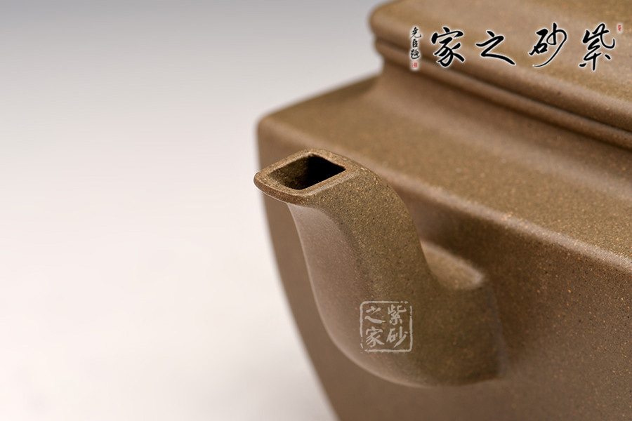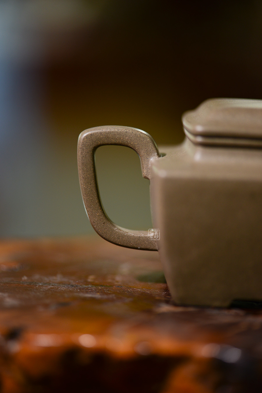 耳形壺鋬四方形線條與壺體、壺流線條相呼應(yīng),轉(zhuǎn)折迂回之間,舒暢自由。流鋬以四方切體,輪廓分明,整體造型比例協(xié)調(diào),于穩(wěn)健中見(jiàn)大氣度。