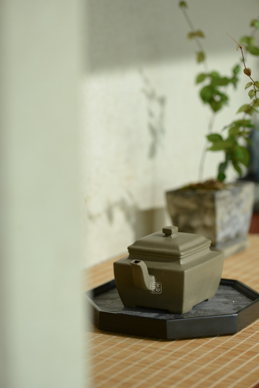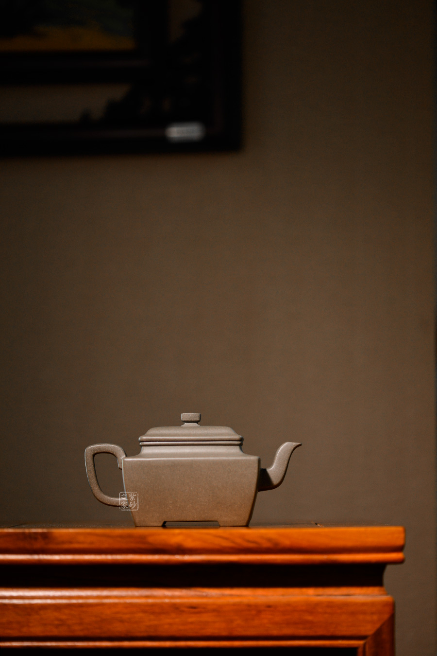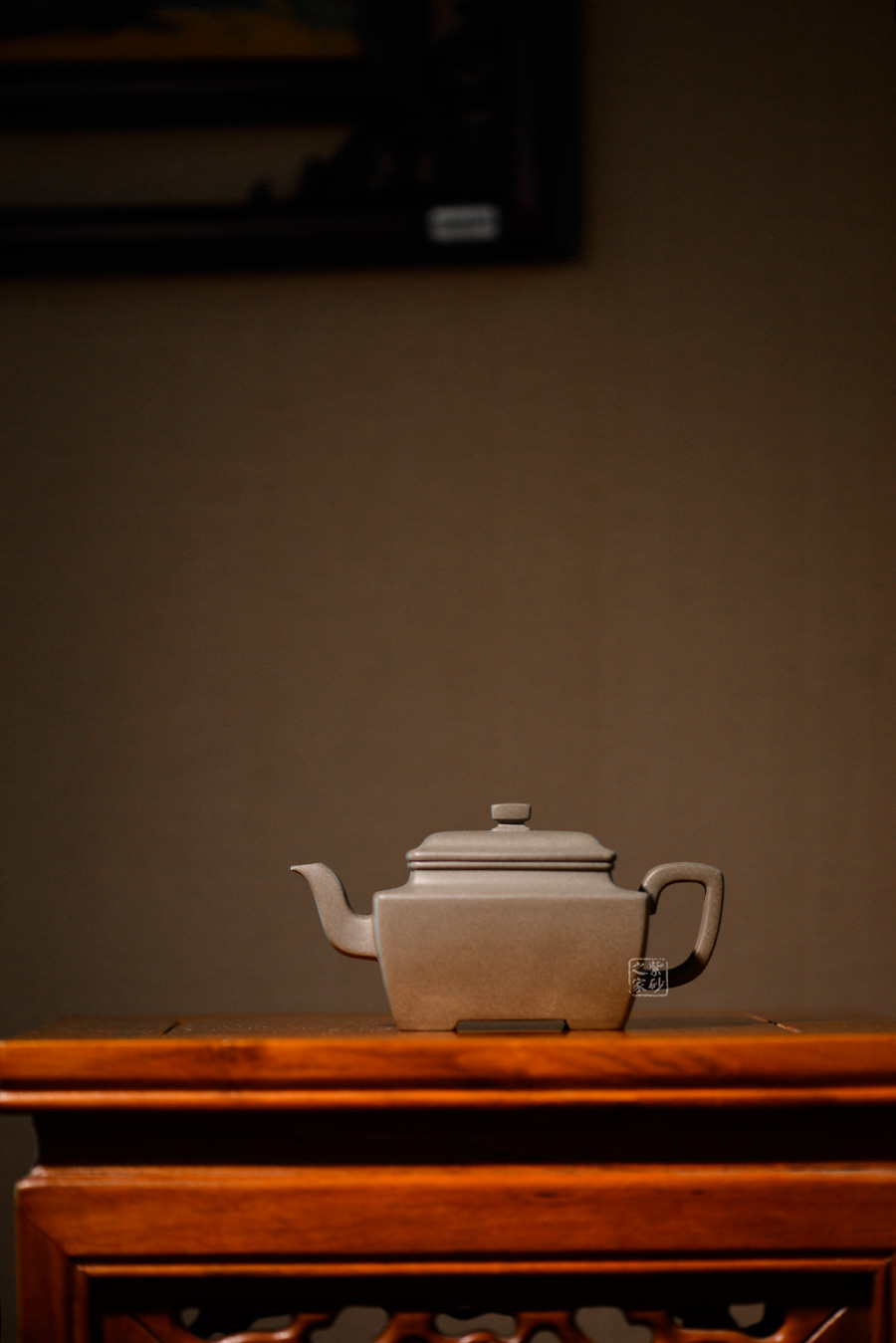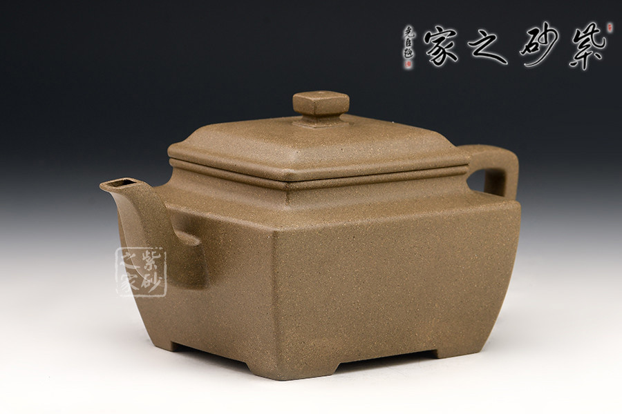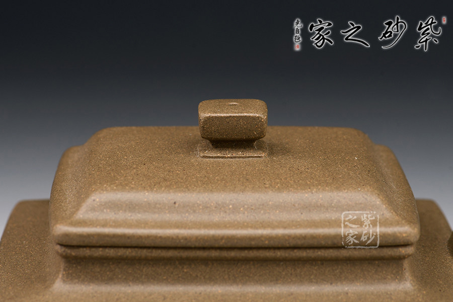 此壺型制方正,四角垂方,角鈍而勻,棱線隱而不沒(méi),線挺而直,方中寓圓,四方蓋鼓。圓方形鈕挺而大氣,四面昂藏。