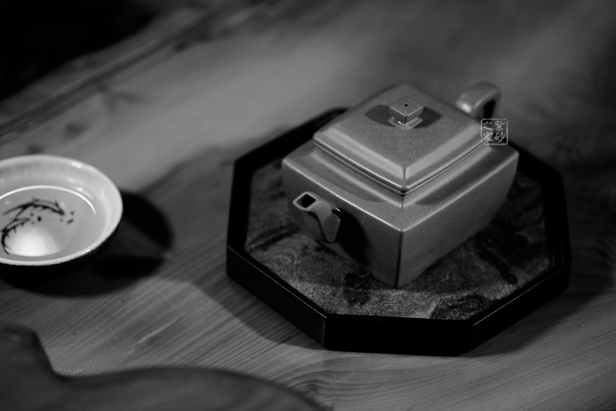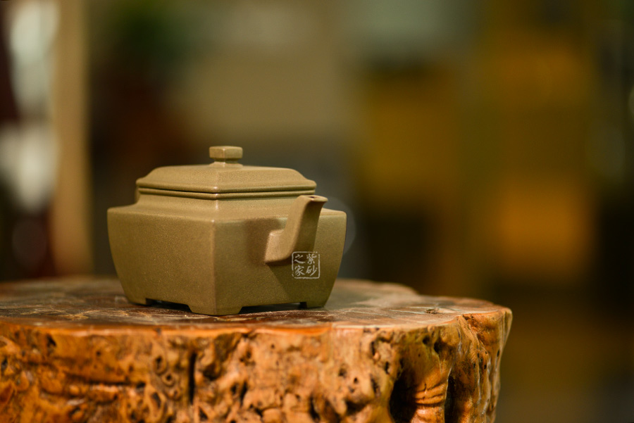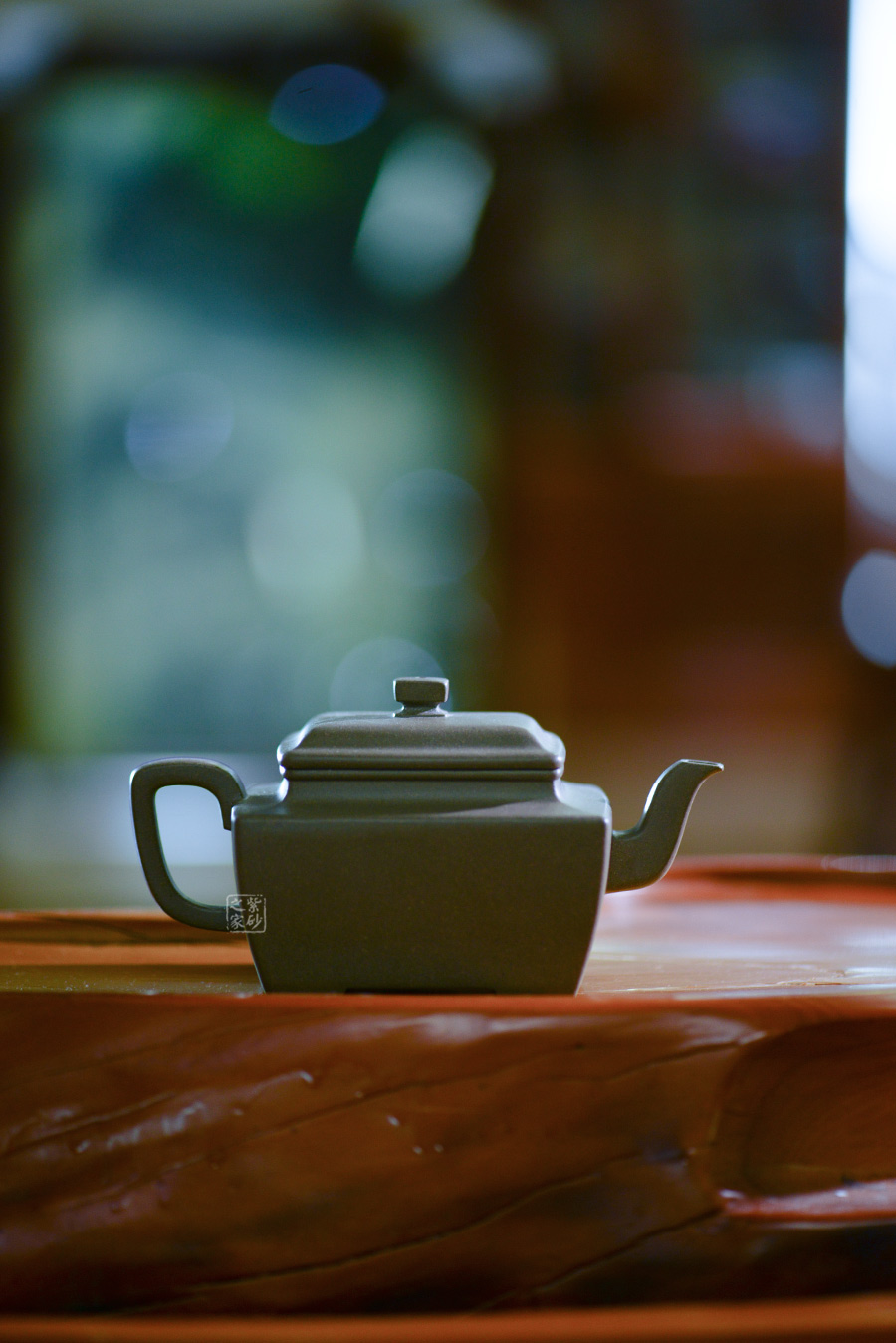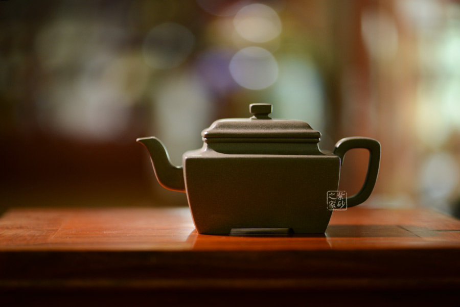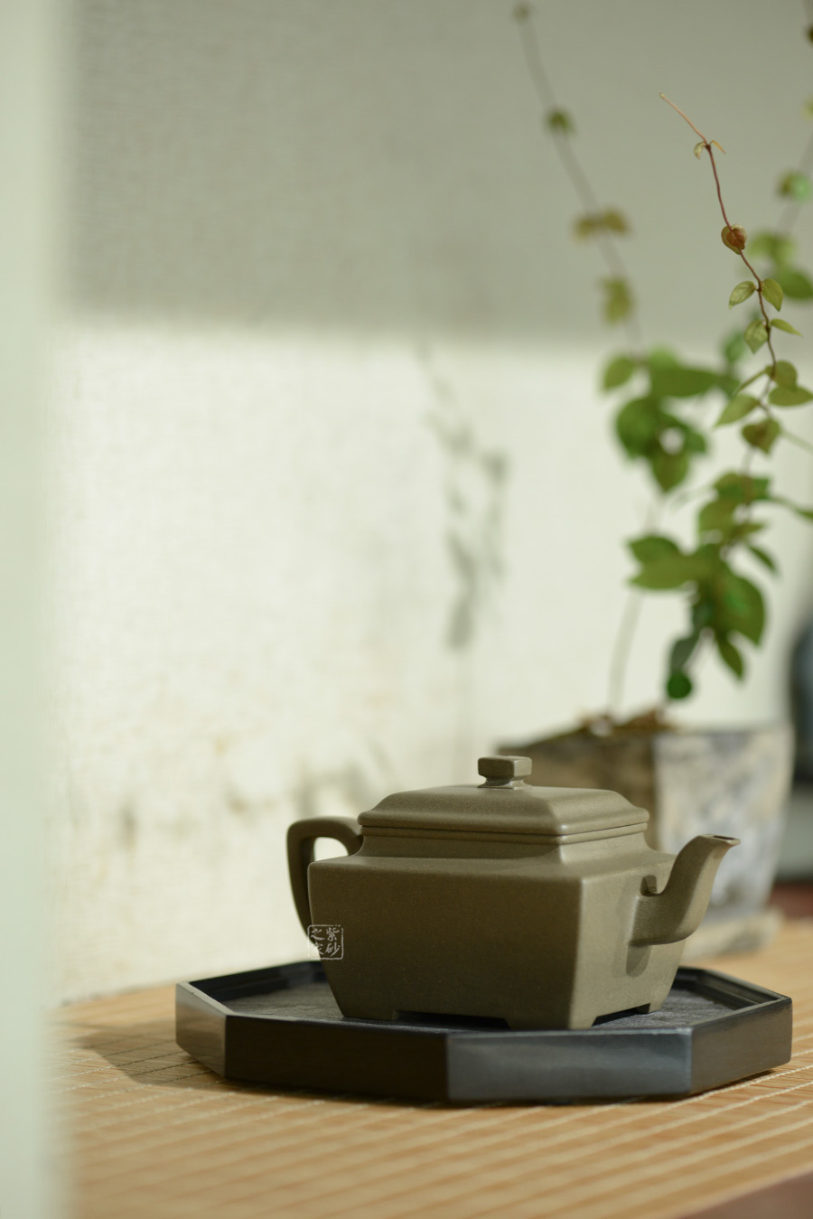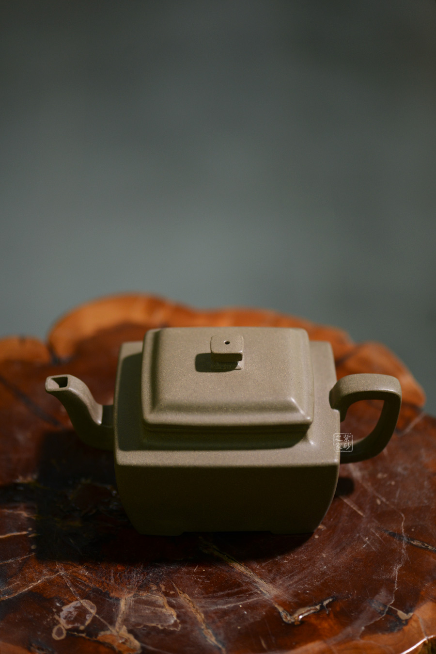此壺型制方正,四角垂方,角鈍而勻,棱線隱而不沒(méi),線挺而直,方中寓圓,四方蓋鼓。圓方形鈕挺而大氣,四面昂藏。