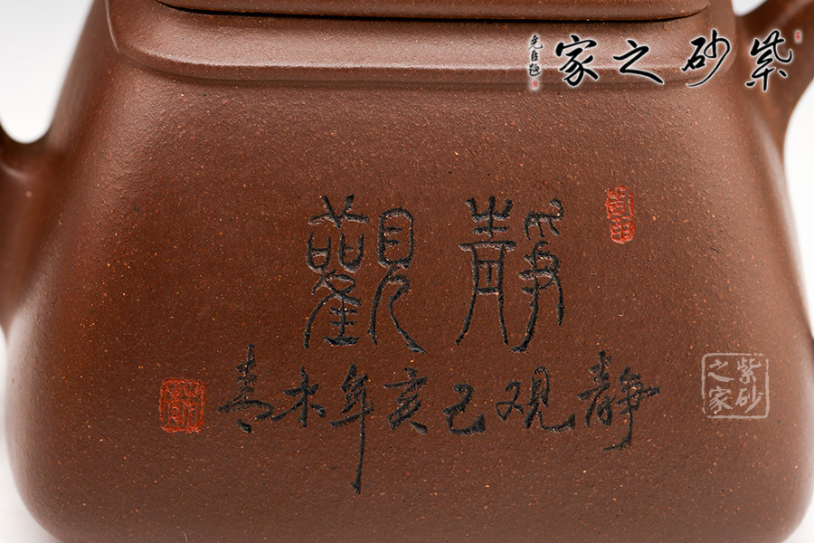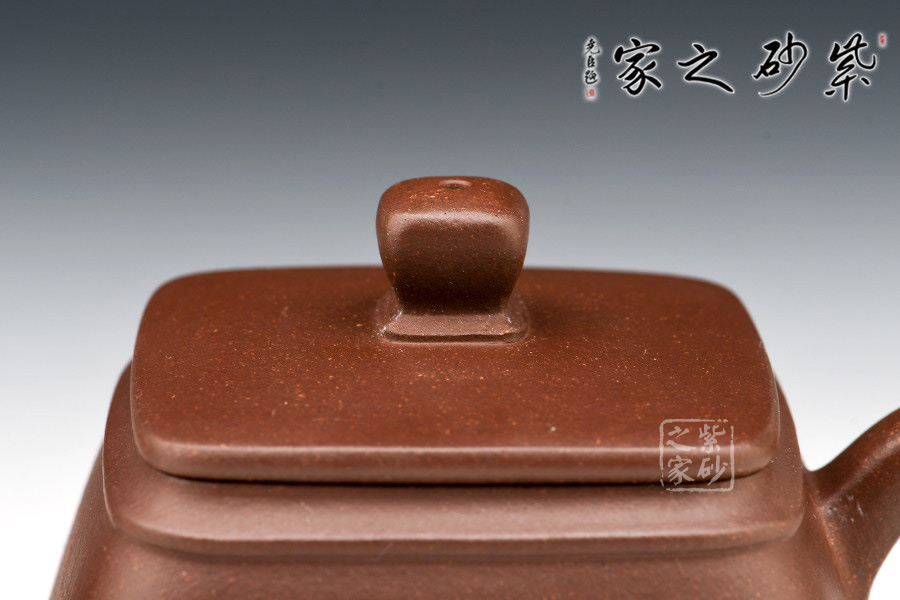 這款四方壺,是精品方壺的典型代表。其壺身周正,棱角分明,對稱性強。壺身的四邊向外挺括,使得重心下移、穩(wěn)立于茶席,頗顯端莊、穩(wěn)重的氣質。