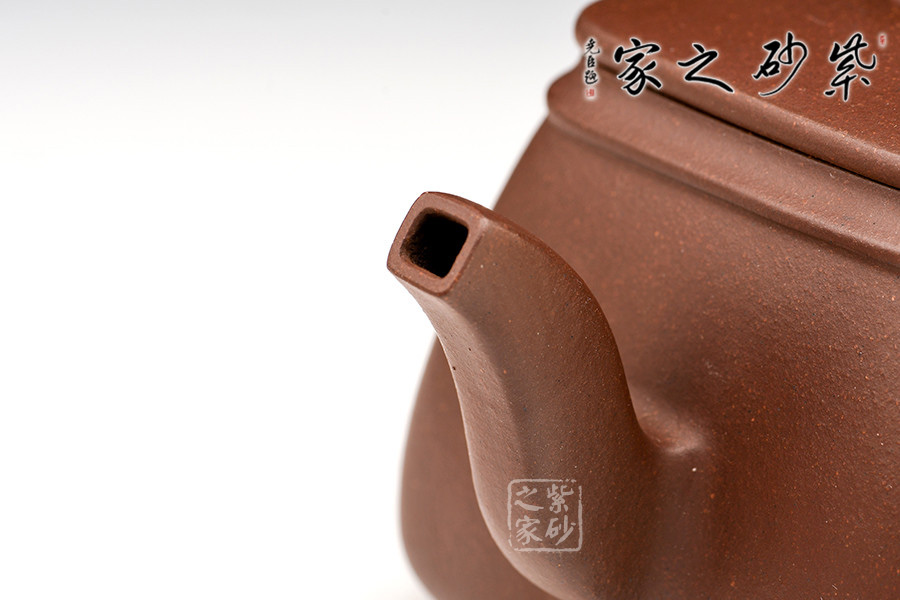 弧度圓潤,與直邊巧妙融合,方中帶圓、兼具柔情與傲骨。蓋鈕小巧玲瓏、綴于方正的壺蓋之上,精致而恰當。壺嘴微翹,出水流暢、斷水利落,是泡茶時的一把實用利器。