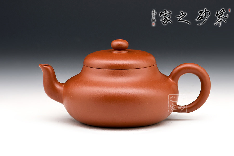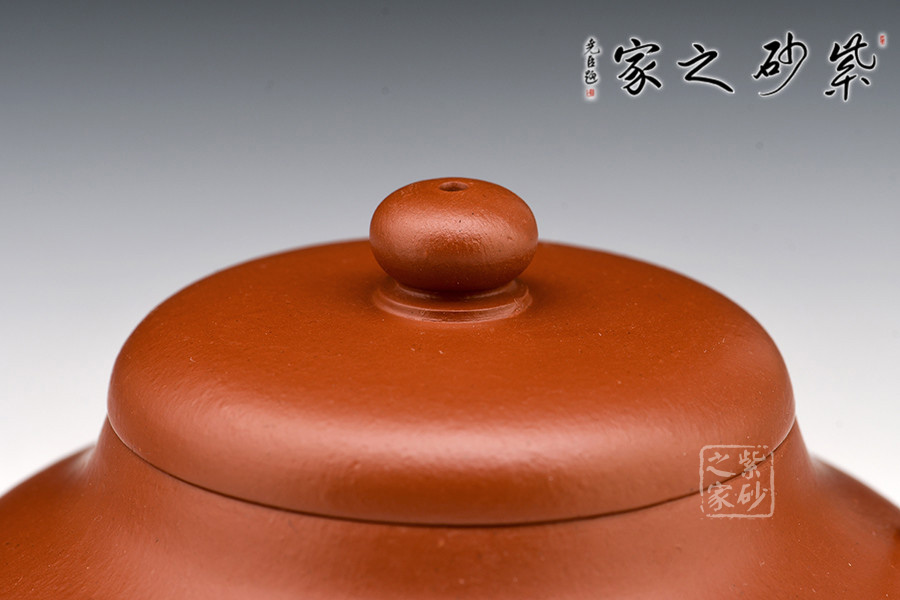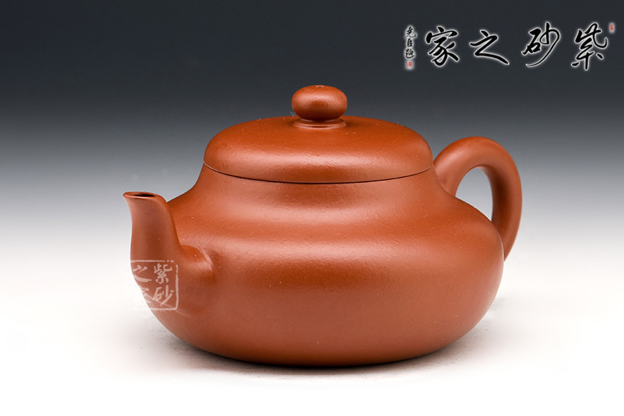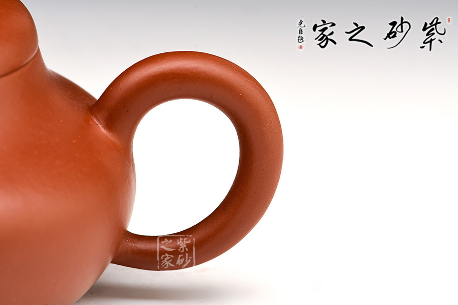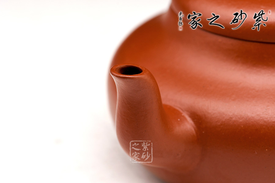呈鼓腹矮梨形,三彎流朝天,圓環(huán)把,截蓋圓珠鈕。整器簡樸大度,個性鮮明,在角線、面的處理上達(dá)到了“均、挺、圓、正”。