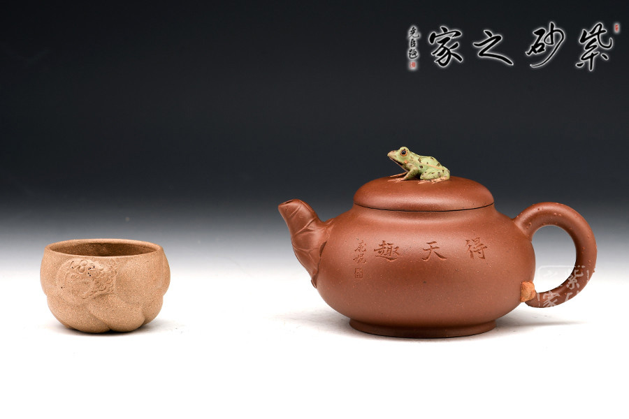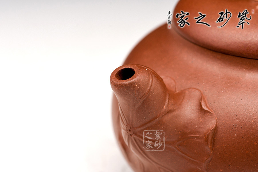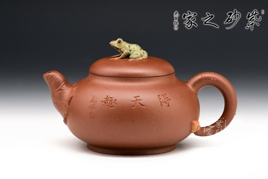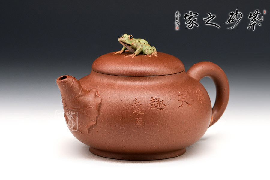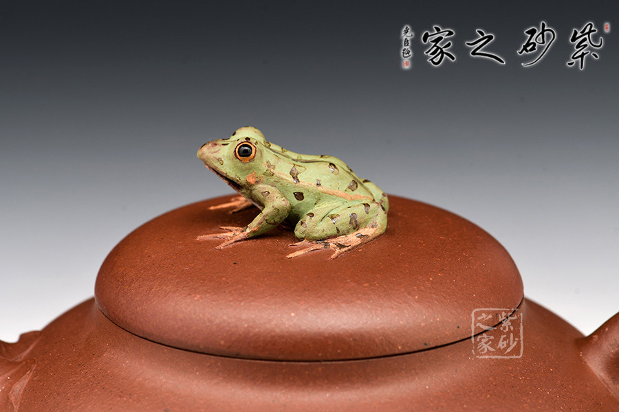 壺鈕新穎別致,一青蛙圓瞪雙眼,眉眼傳神,栩栩如生。壺嘴處仿若荷葉鋪就,形象自然。端把更是出奇制勝,仿若一根中通外直、不蔓不枝的荷花莖彎曲而成,于把底之處一朵睡蓮含苞待放,逼真生動(dòng)。該壺,極具實(shí)用和欣賞價(jià)值,不可錯(cuò)過(guò)。