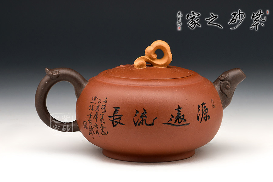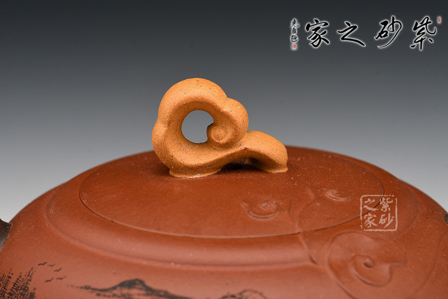 此壺整體型制簡單大方,實用方便,運用雙色泥技法,在細節(jié)處處理巧妙,體現(xiàn)在壺鈕,呈翻騰的浪花形態(tài),亮眼但不突兀,呼應(yīng)“源遠流長”的主題。