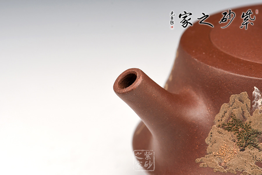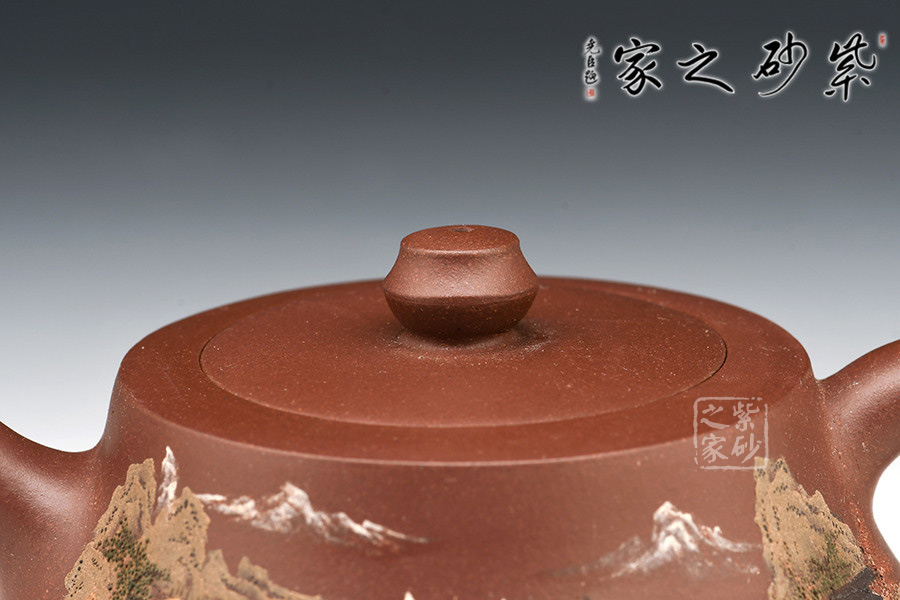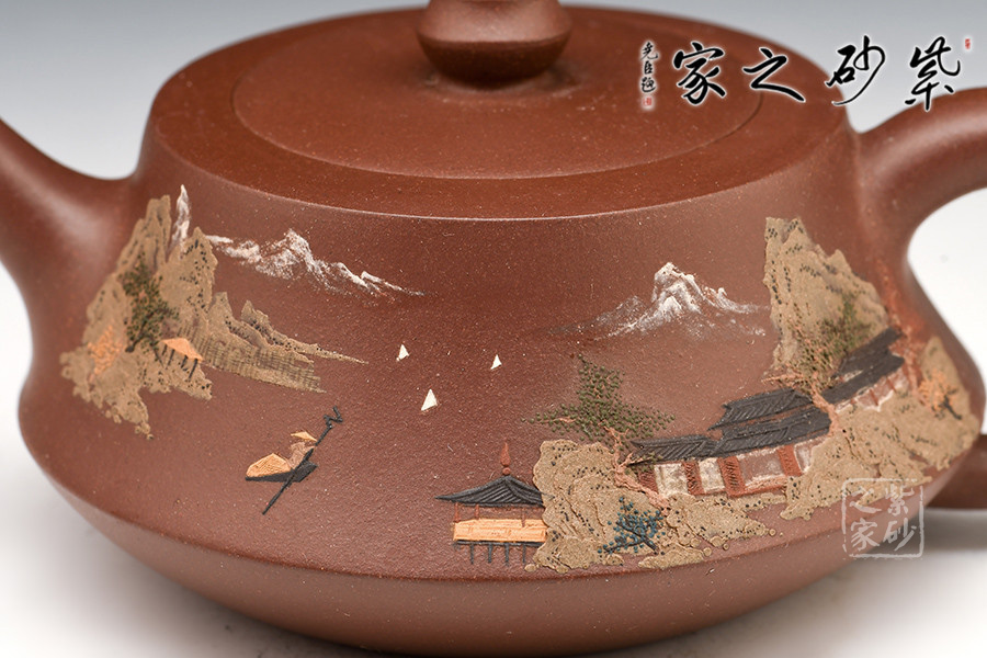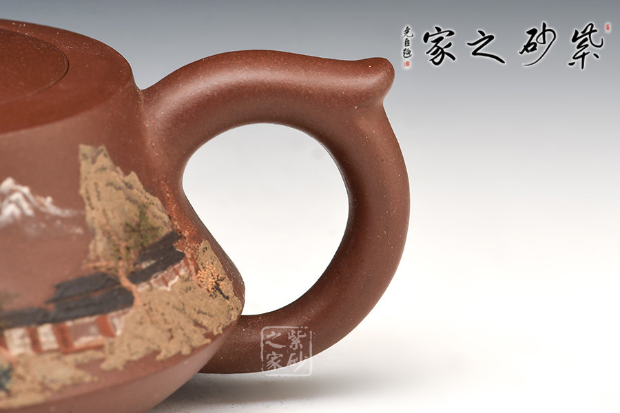 壺體細繪山水書畫,通過不同的筆墨、色彩來展現(xiàn)山水,筆法細膩,惟妙惟肖,山水布局精妙,泥繪用色濃淡相宜,讓人如臨詩詞古人之境。