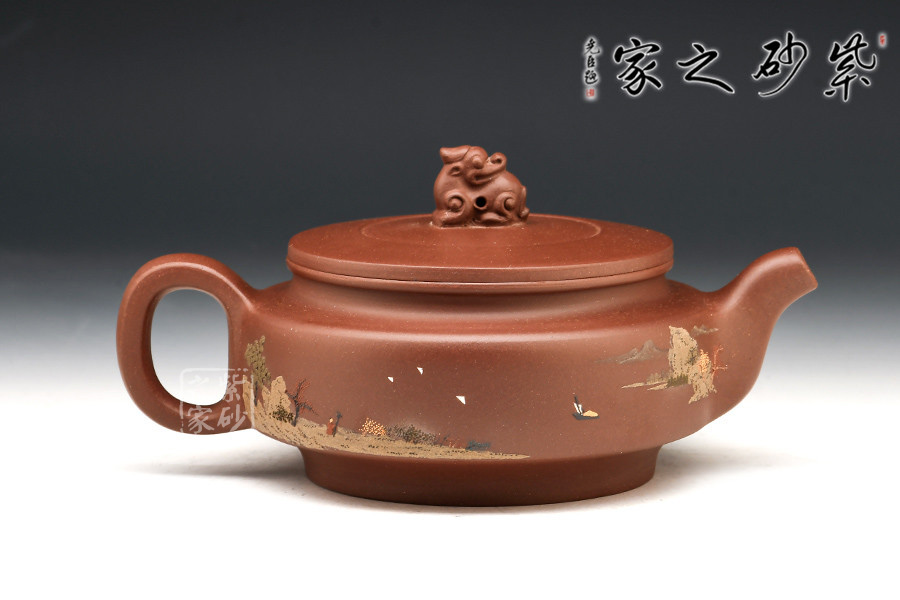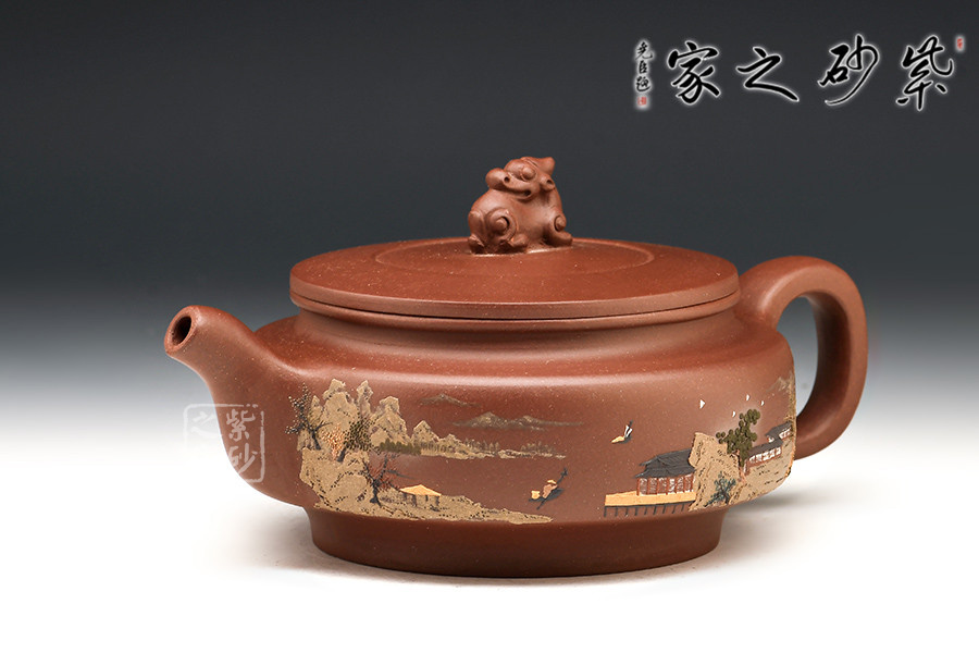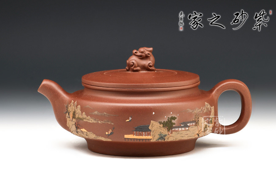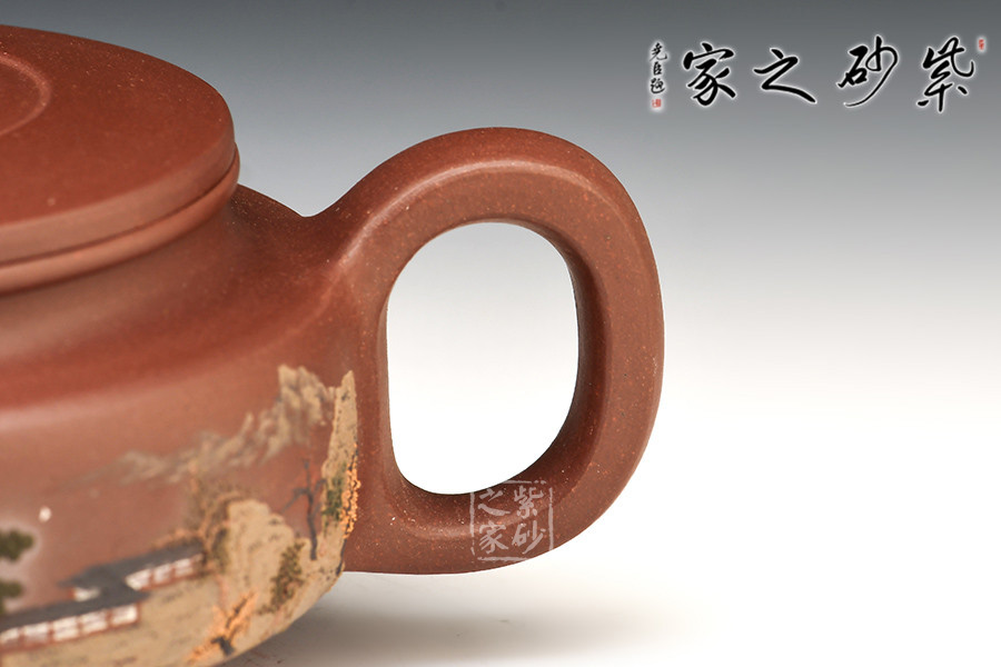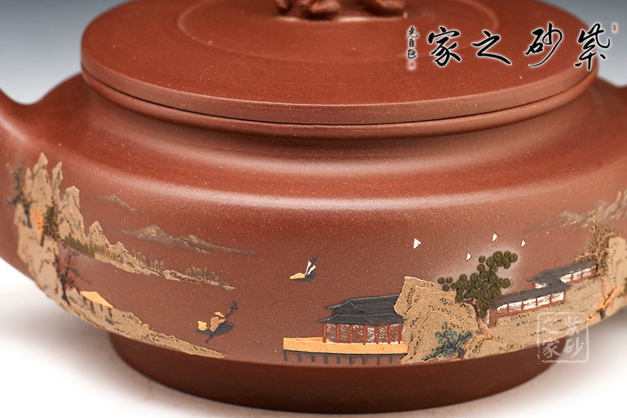 壺體周身細繪山水書畫,通過不同的筆墨、色彩來展現山水,筆法細膩,惟妙惟肖,山水布局精妙,泥繪用色濃淡相宜,讓人如臨詩詞古人之境。