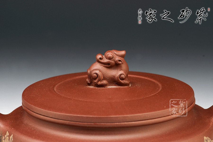 壺身為扁圓形,圈足作底將壺體托起,穩(wěn)定中增加了靈空之感。肩線圓順爽朗,質感強烈,暗接扁嘴上翹,豪邁瀟灑之氣躍然而出。壓蓋與壺口結合緊密自然,造型流暢大氣,蓋中立一小龍為鈕,經作者精心刻畫,使其造型生動,神完氣足,奇趣之極。