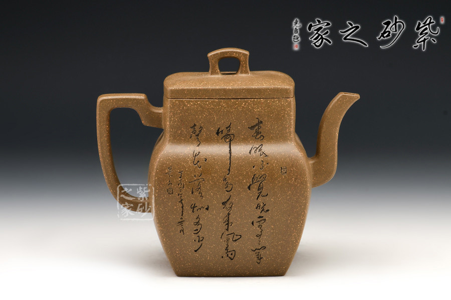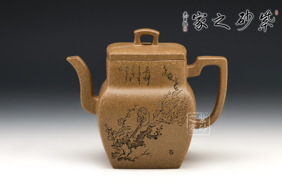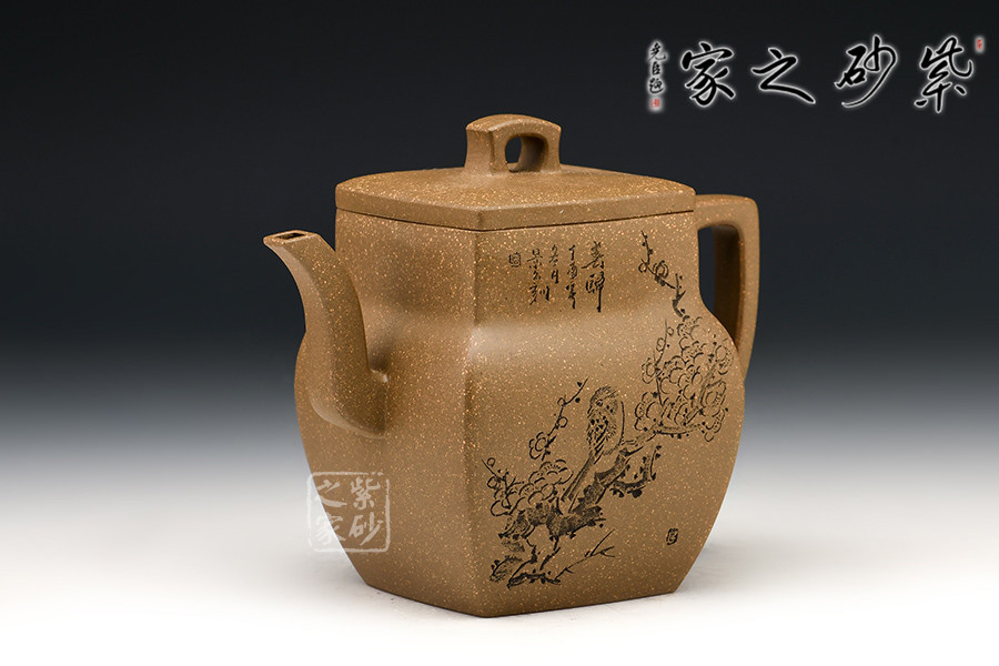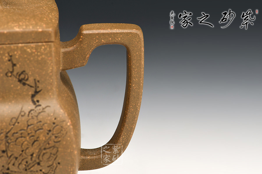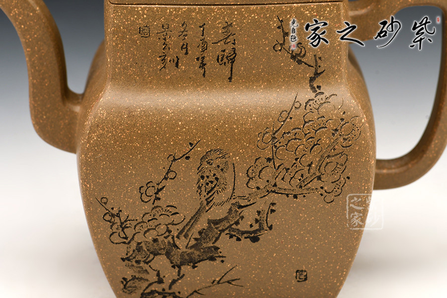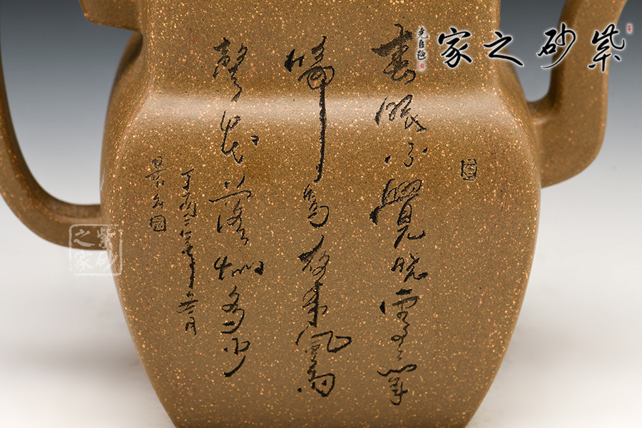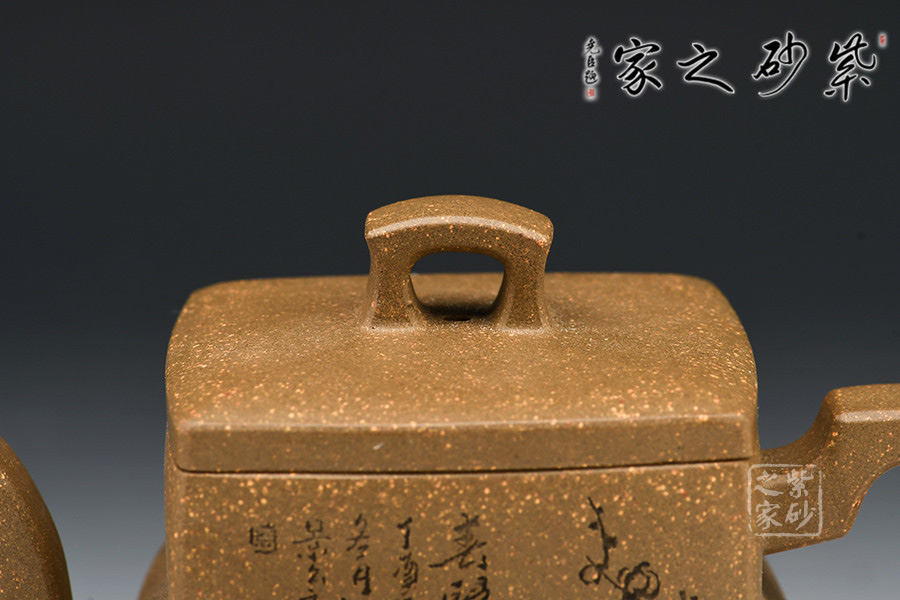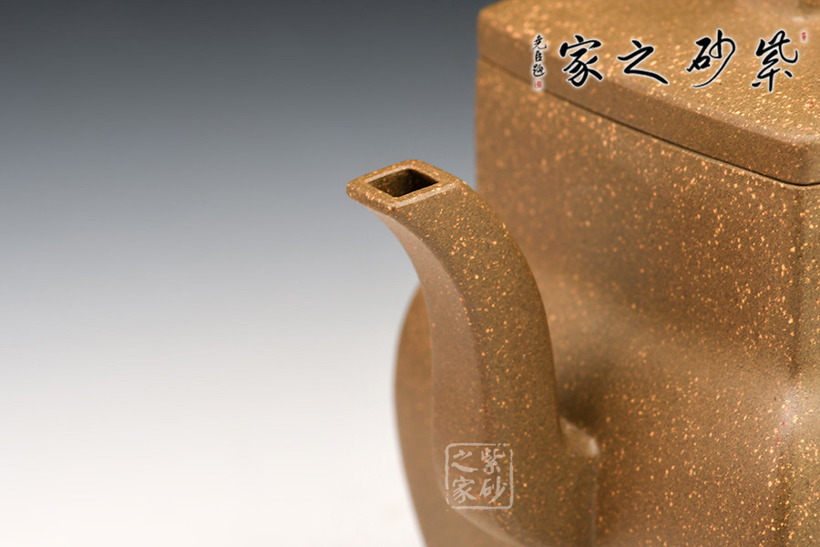 四方形高壺身,鼓腹、長(zhǎng)肩。半環(huán)狀飛把執(zhí)柄,外圓內(nèi)方形三彎流胥出,壺蓋弧起,子母扣合,拱形橋鈕,整器落落大方。