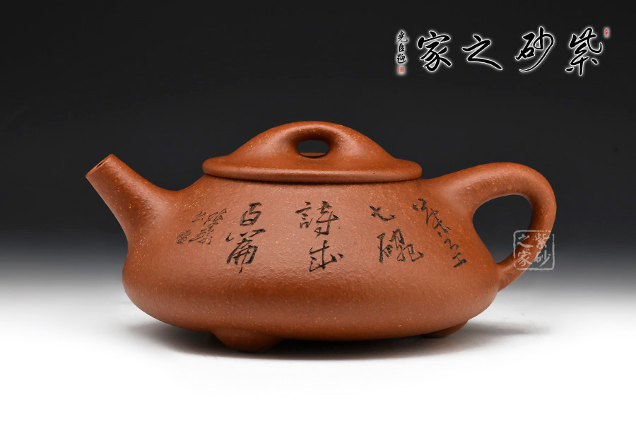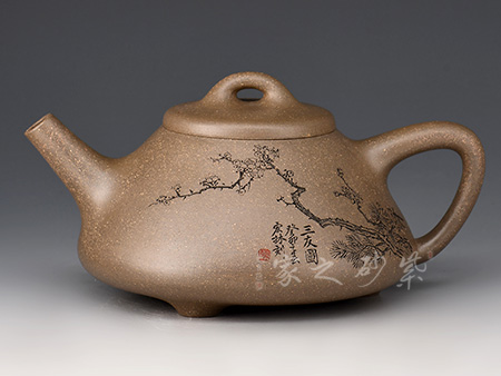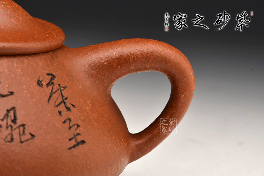 本件石瓢壺從壺式上看,壺形上小下大,重心下垂,造型沉穩(wěn),壺嘴為矮而有力的直筒形,出水暢順,極速有力。壺身呈“金字塔”式,壺流、壺口、壺把三點(diǎn),符合科學(xué)性,觀賞端莊敦穆。