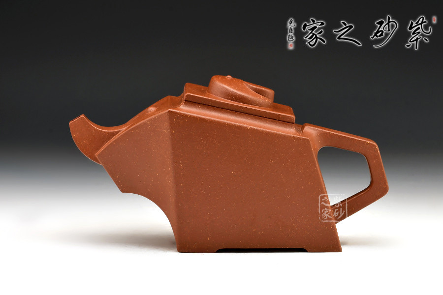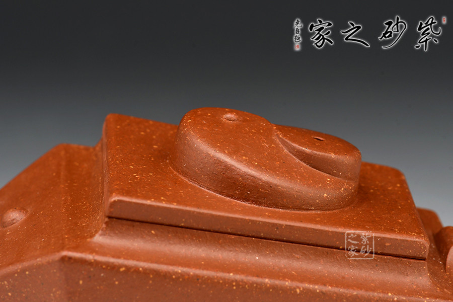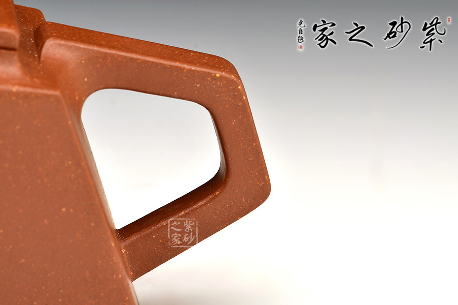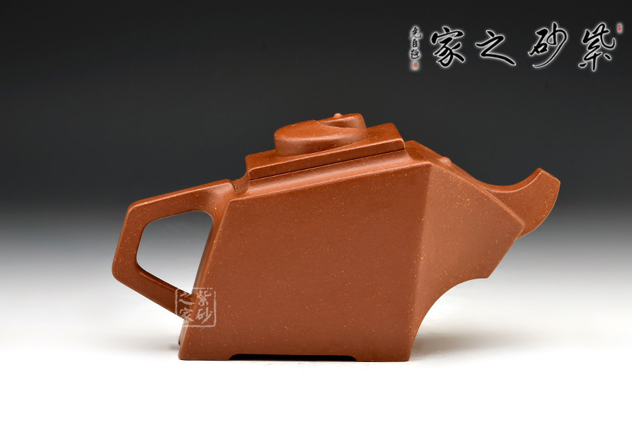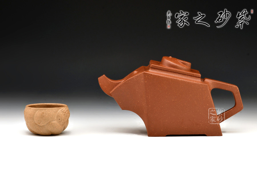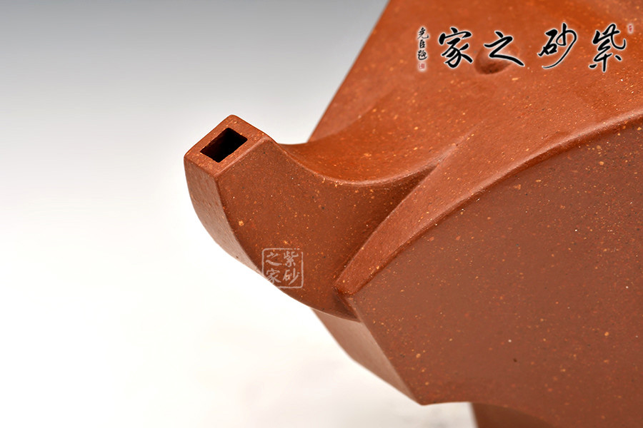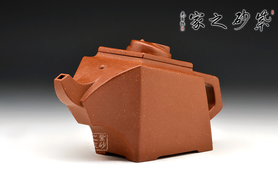此壺呈不規(guī)則的四方形體,整體似一犀牛的形狀,設(shè)計(jì)巧妙,意蘊(yùn)深厚,別具匠心。不規(guī)則的四方狀壺身,流為犀牛嘴,把為犀牛尾,蓋紐設(shè)計(jì)也是根據(jù)犀牛的形體設(shè)計(jì),趣味十足,且保證茶具的實(shí)用性。