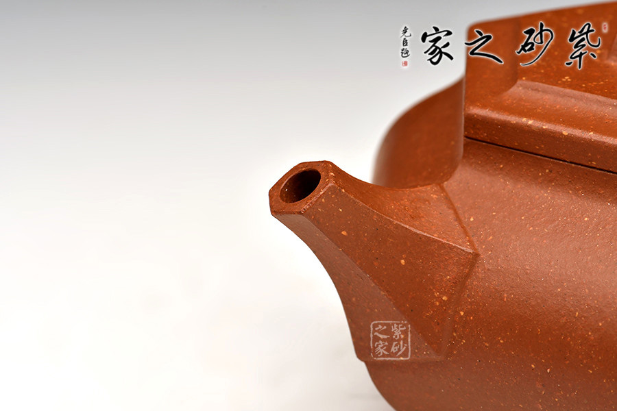 壺的所有部位與壺形體相稱,混方的小橋形鈕剛柔并濟,不規(guī)則六棱形彎流壺嘴以及壺把,線面挺括平整,有棱有角。整體做到“方中寓圓,方中求變,口蓋劃一,剛柔相稱”,給人明秀挺快、干凈利落的陽剛之美。