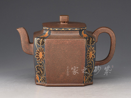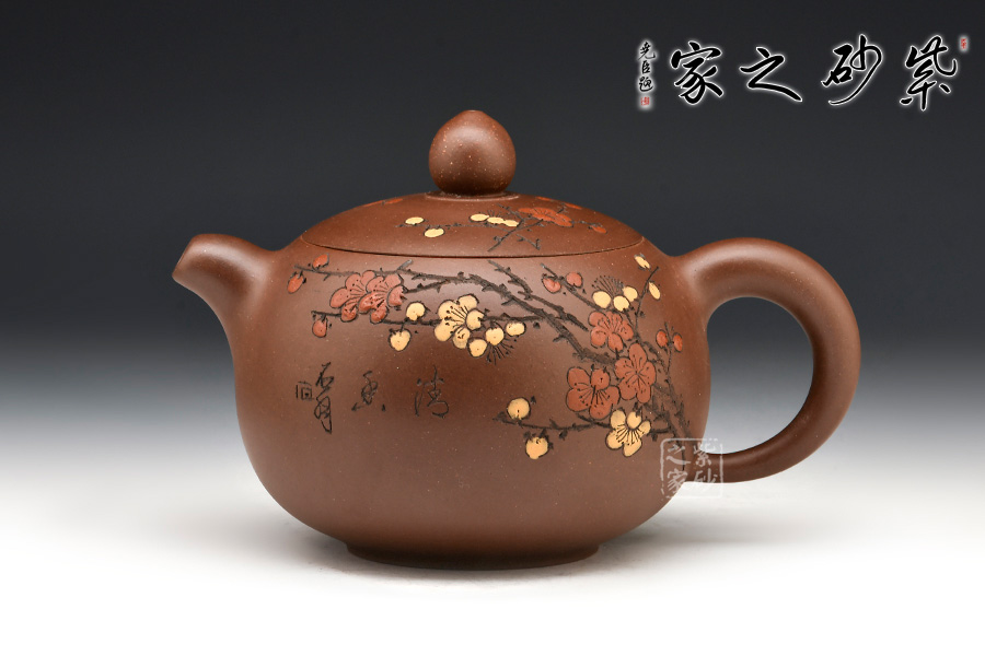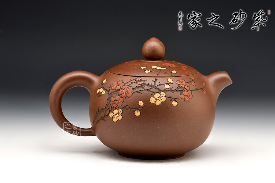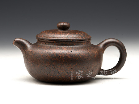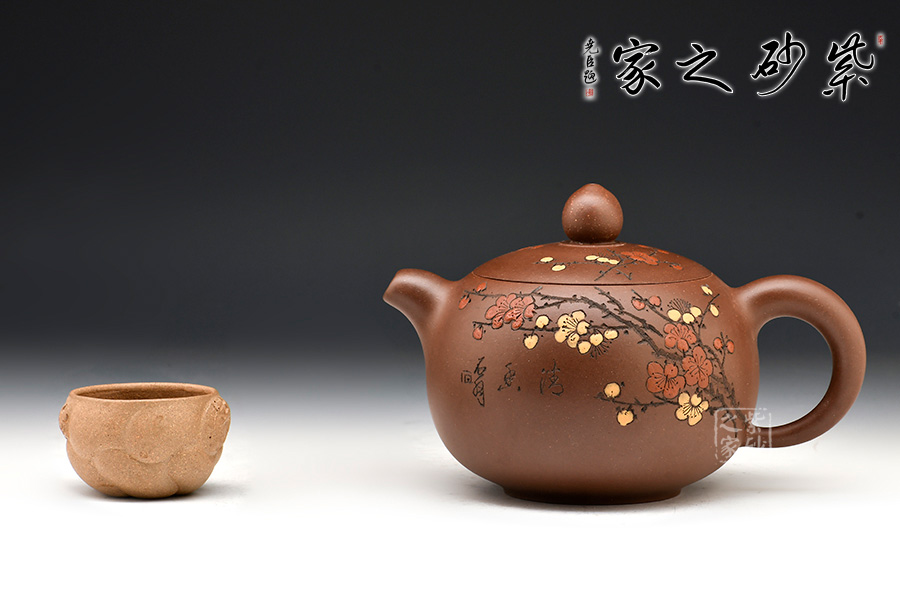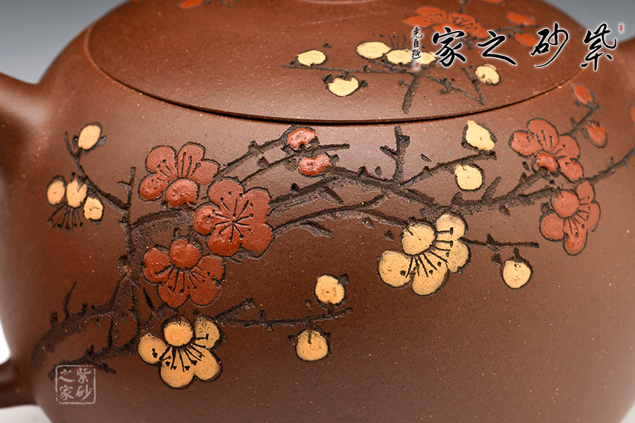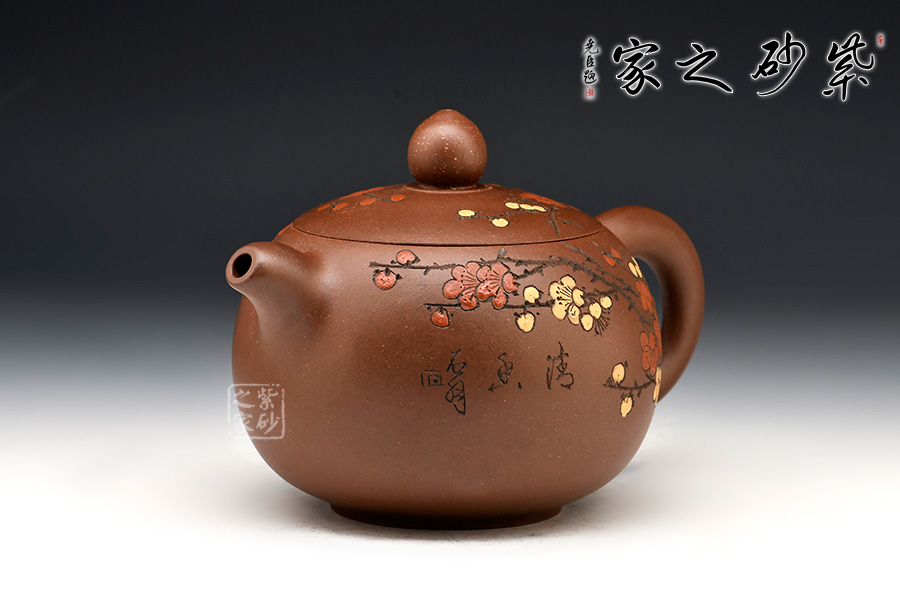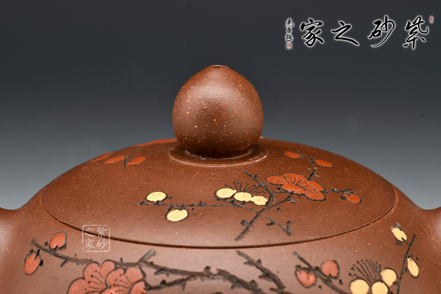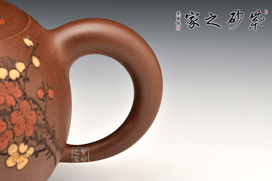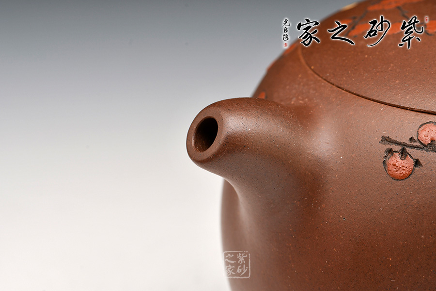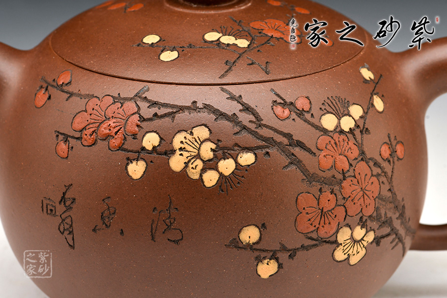 壺身飽滿挺括,光澤鮮亮,可謂是珠圓玉潤。此壺采用雙色嵌泥裝飾工藝,壺身的比例得當,截蓋與壺身不可分割,點線之間見出魅力,骨肉亭勻,簡練大方,制作頗見功力。加之,沈漢生老師裝飾,平添一份淡雅的情趣。