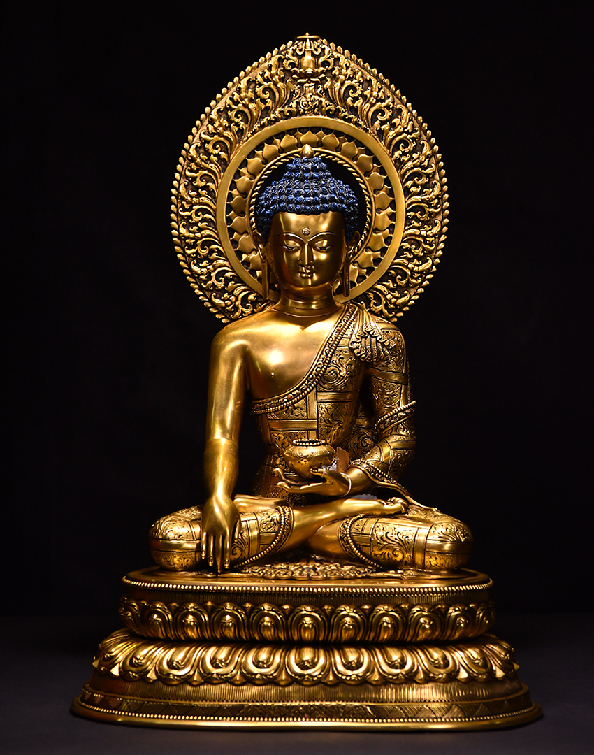 產地:尼泊爾佛像 工藝:鎏金 創作年份:2019 題材:釋迦牟尼 繪制時間:0日 尺寸:*53*53cm 重量:0 g 材質:紫銅 使用場地: