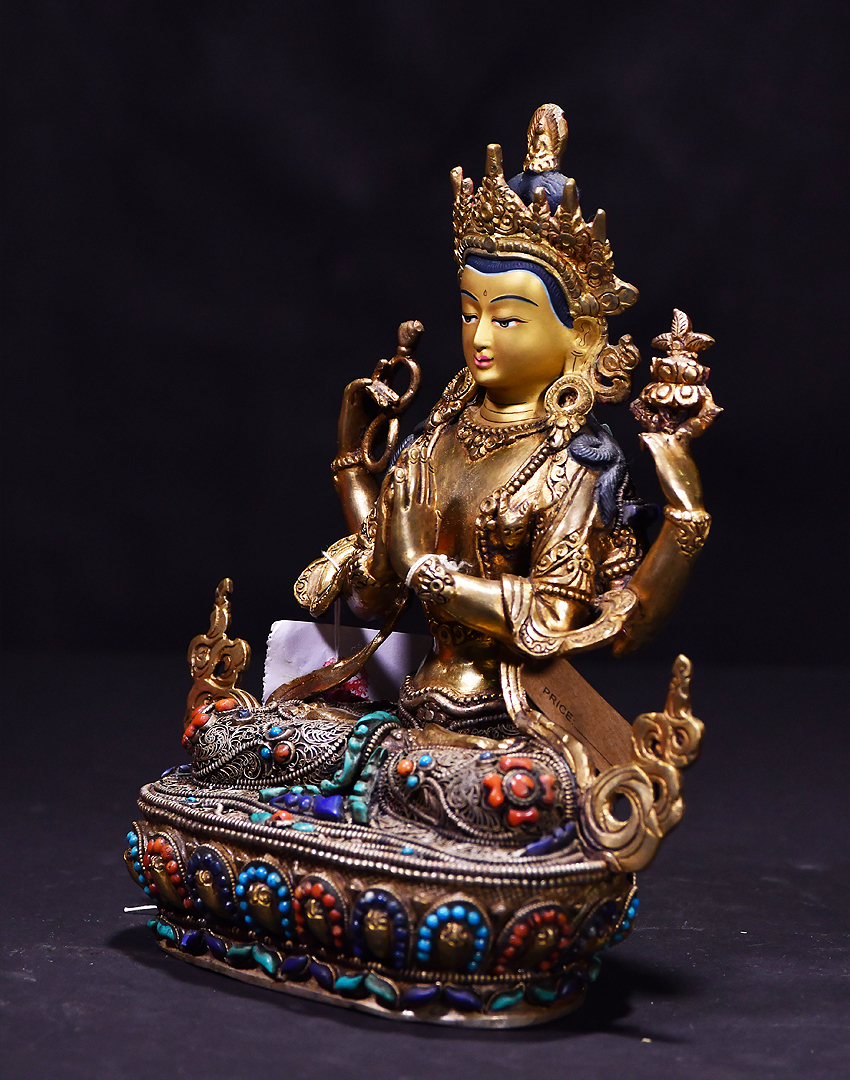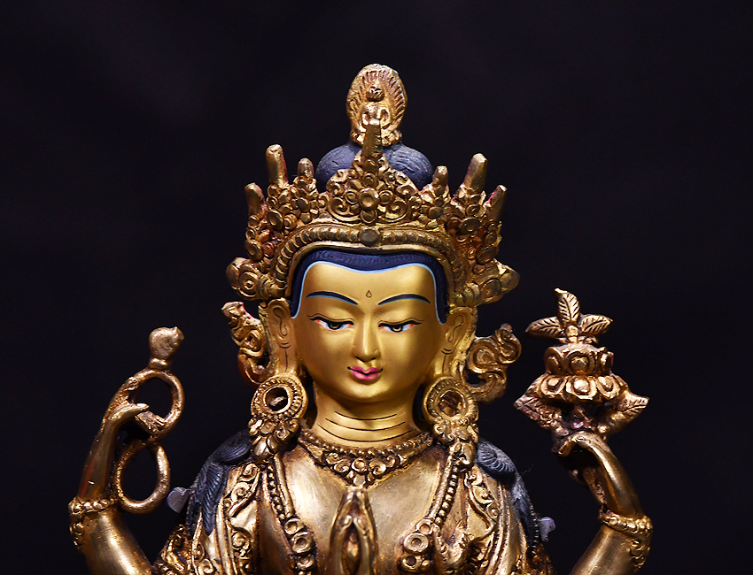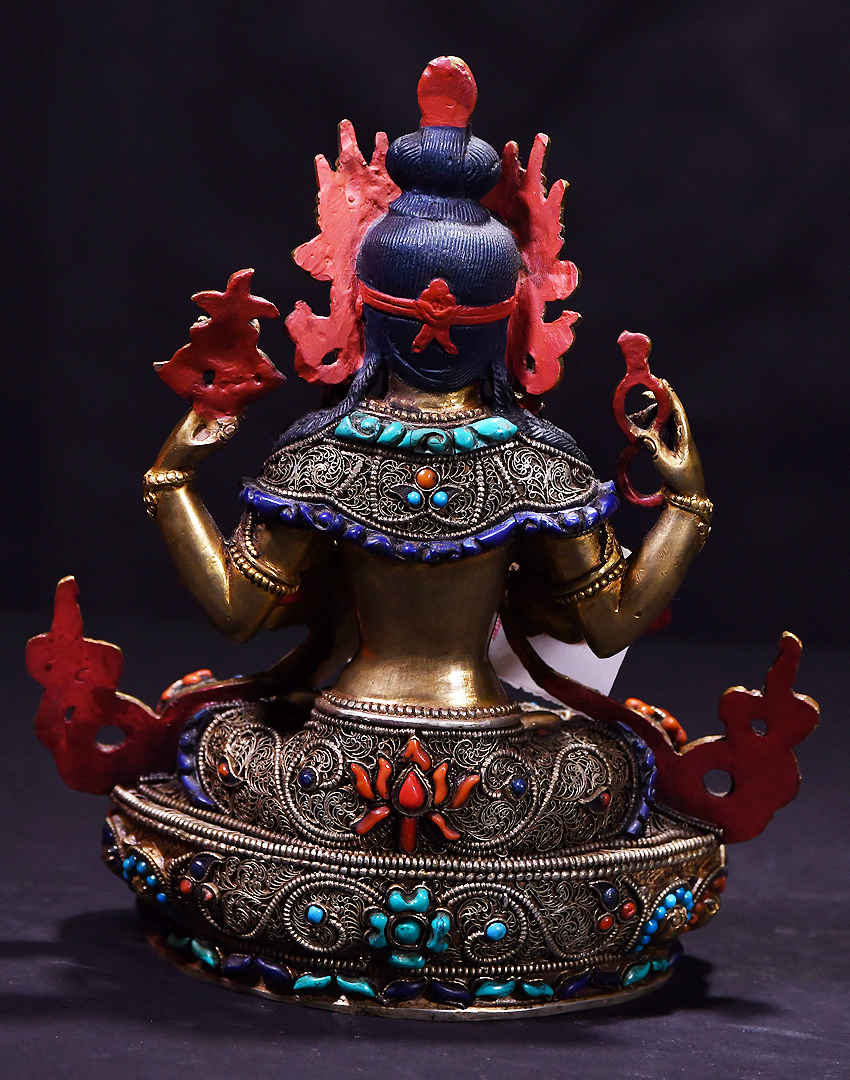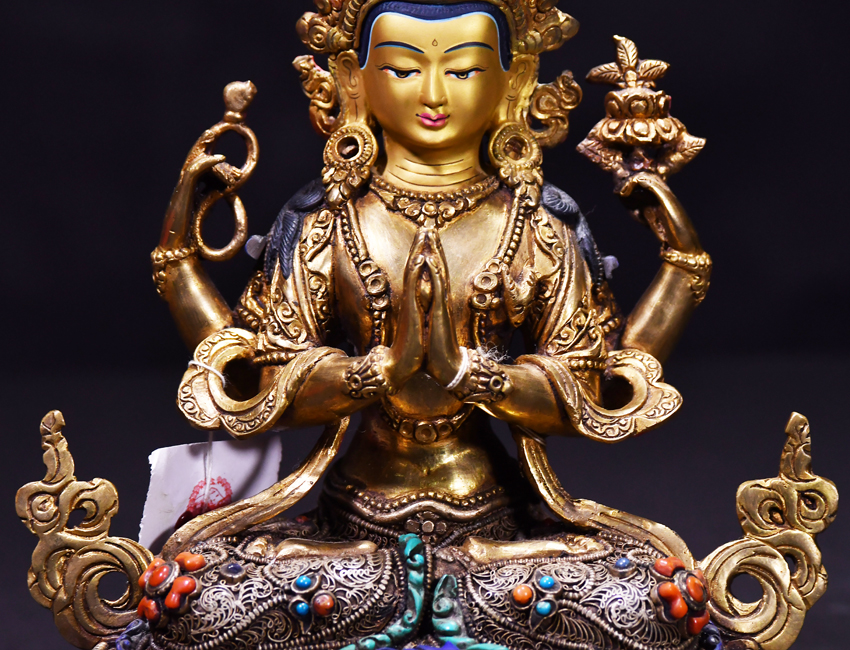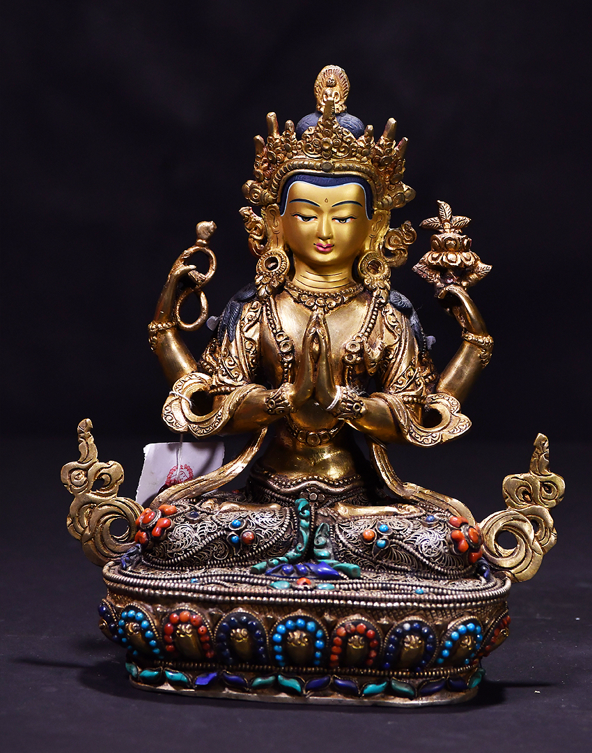 產地:尼泊爾佛像 工藝:掐絲 創作年份:2019 題材:四臂觀音 繪制時間:0日 尺寸:*23*23cm 重量:0 g 材質:紫銅 使用場地: