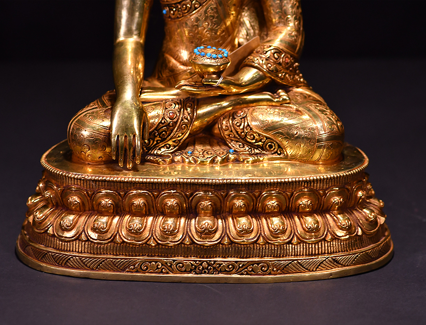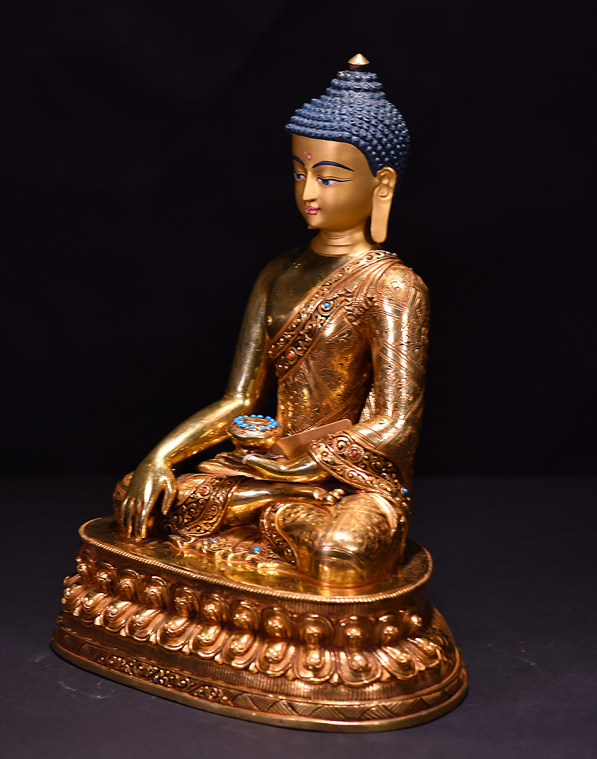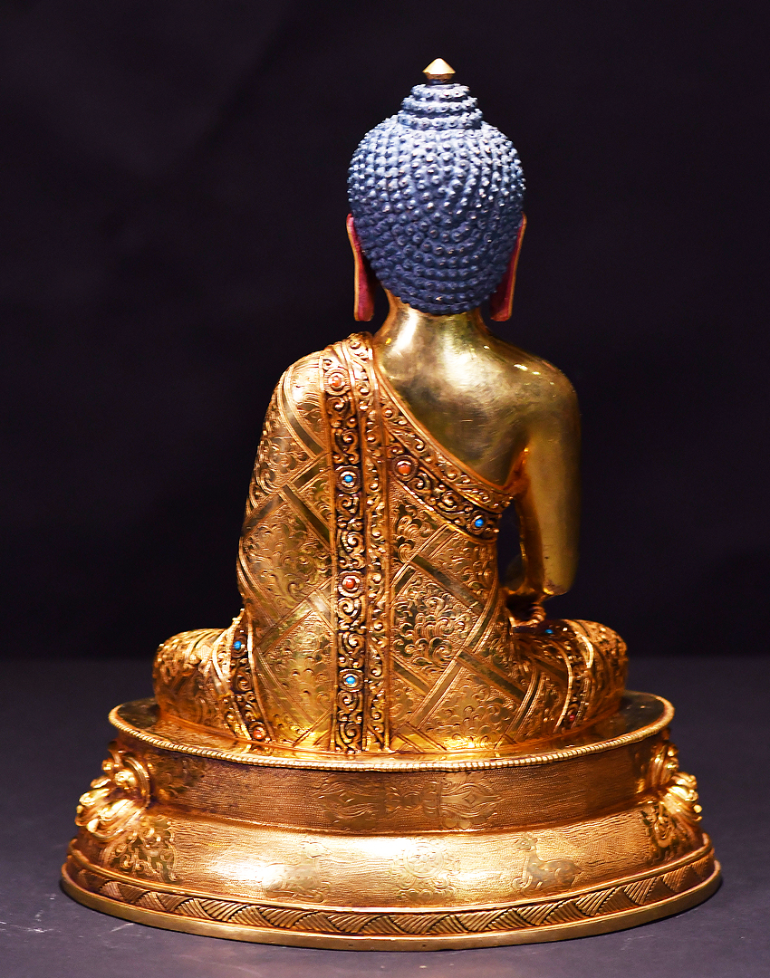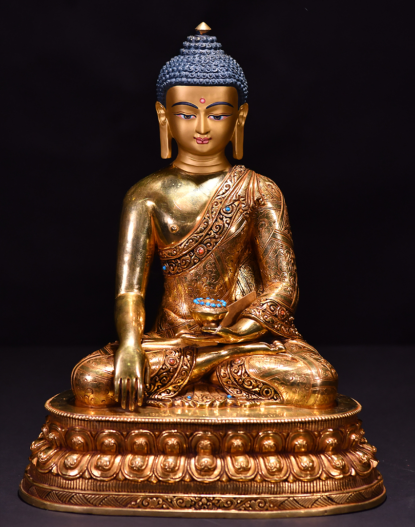 產地:尼泊爾佛像 工藝:鎏金 創作年份:2019 題材:釋迦牟尼 繪制時間:0日 尺寸:*33*33cm 重量:0 g 材質:紫銅 使用場地:
