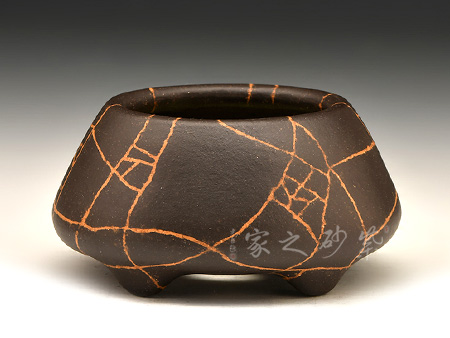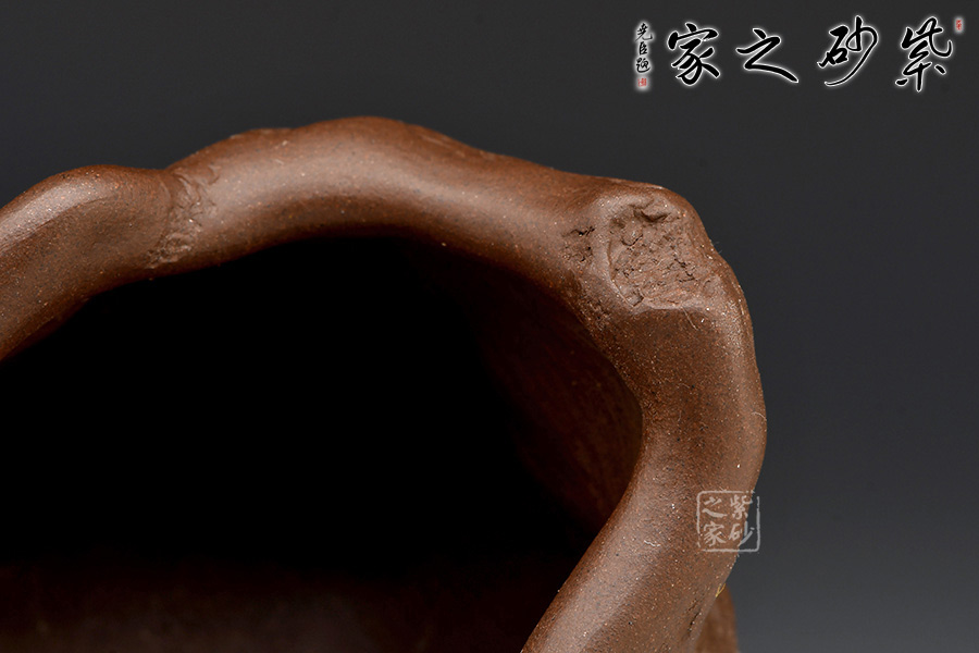 盆花口,腹、足隨形,凸凹有致,頸部外撇如同花瓣。深栗色砂泥,泥質(zhì)細(xì)膩,包漿光潤,優(yōu)雅美觀。