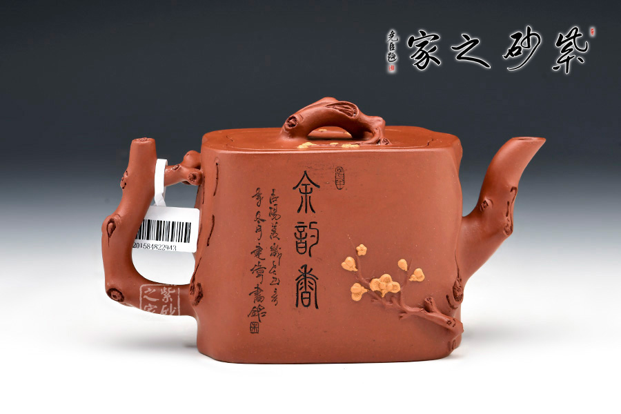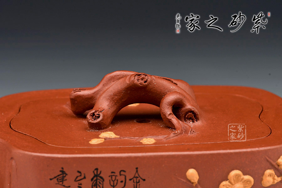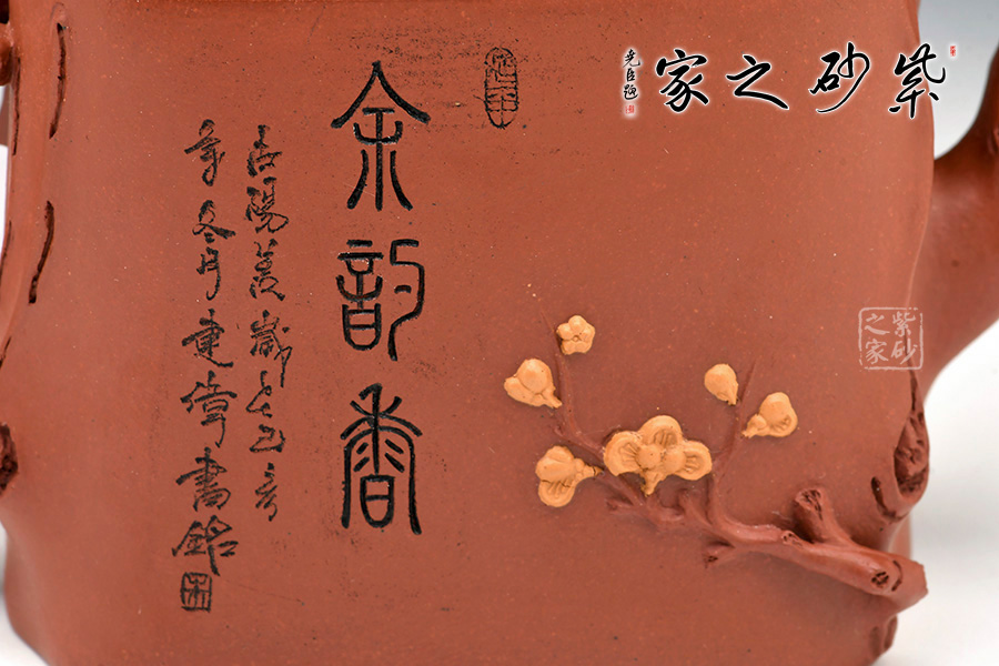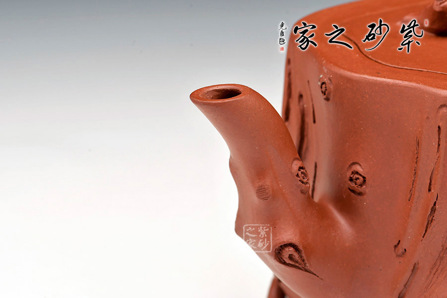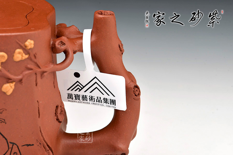《余韻春》為仿生型紫砂茶壺,形似梅干。從壺的整體看,這把壺成了一件強(qiáng)有力的雕塑作品。整把壺用紫砂泥料制作將“樹樁”的“肌理”表達(dá)得淋漓盡致,三彎流的和握把起轉(zhuǎn)降折一氣呵成。流、鈕、把皆作梅枝狀,造型生動(dòng)。壺身采用堆花手法,更有貼塑若干梅花、花蕾于其上,古意卓然。