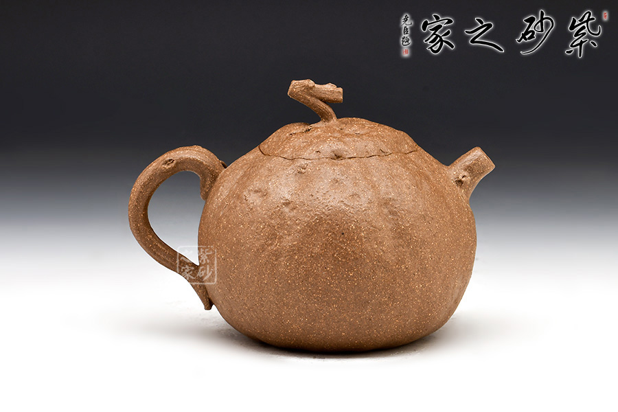 丑橘類似供春壺。壺型是按照橘子形態(tài)成型,紋理是不規(guī)則橘皮斑駁肌理,流把為枝藤,壺鈕為橘蒂,自然有趣,活靈活現(xiàn),為整器增添生機活力。