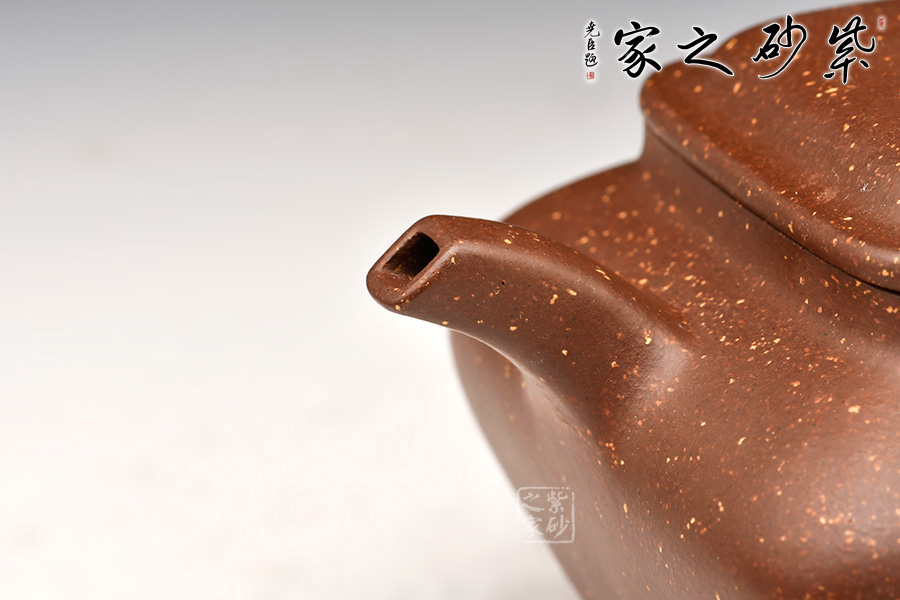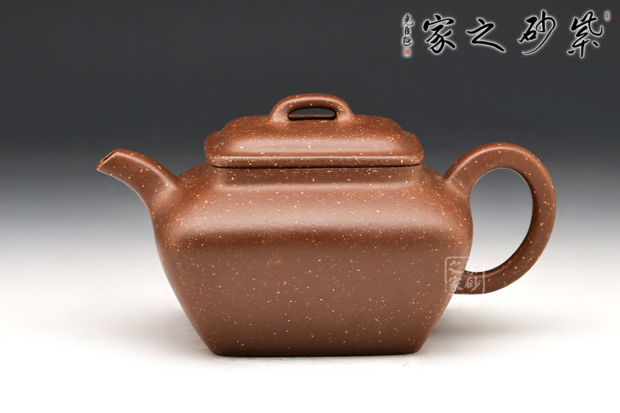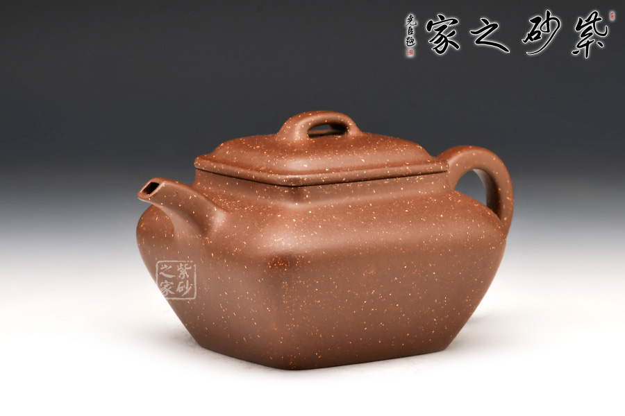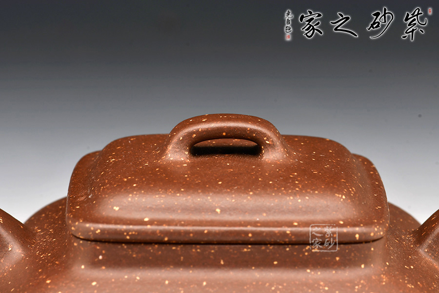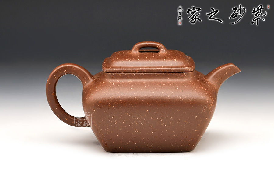四方形,上闊下斂,蓋、流、柄為方形,棱角分明,壺腹全身以鋪砂裝飾,極為少見。