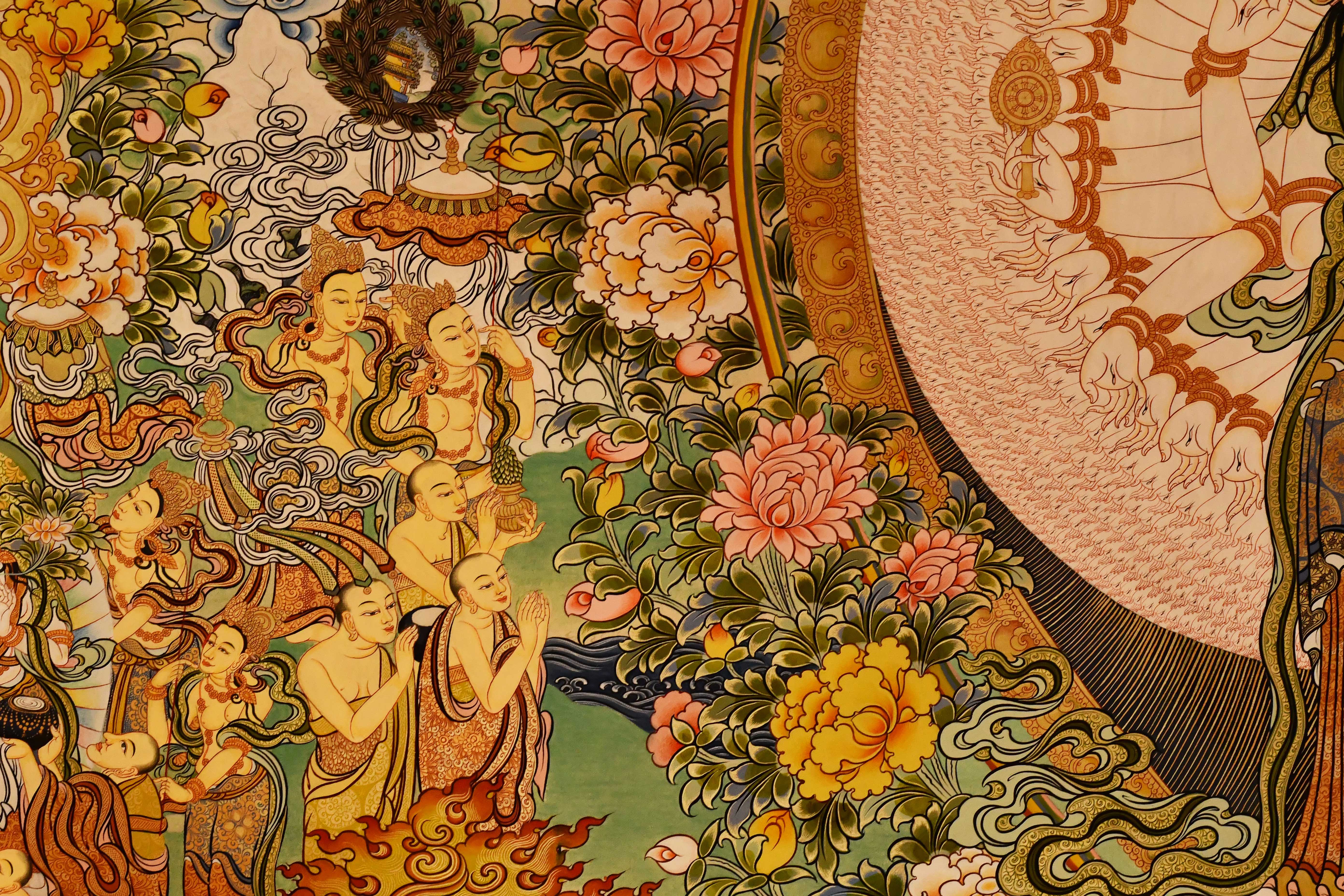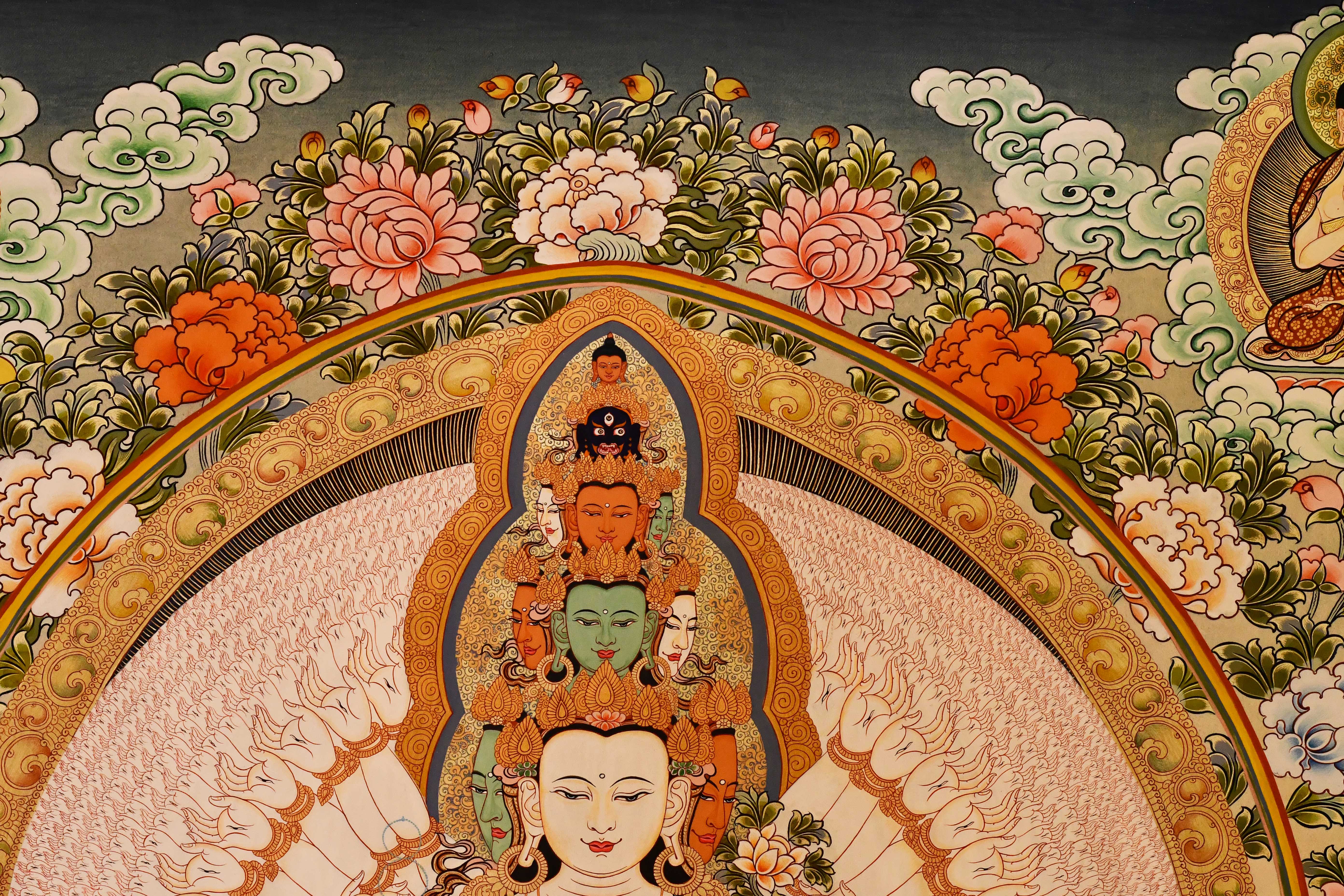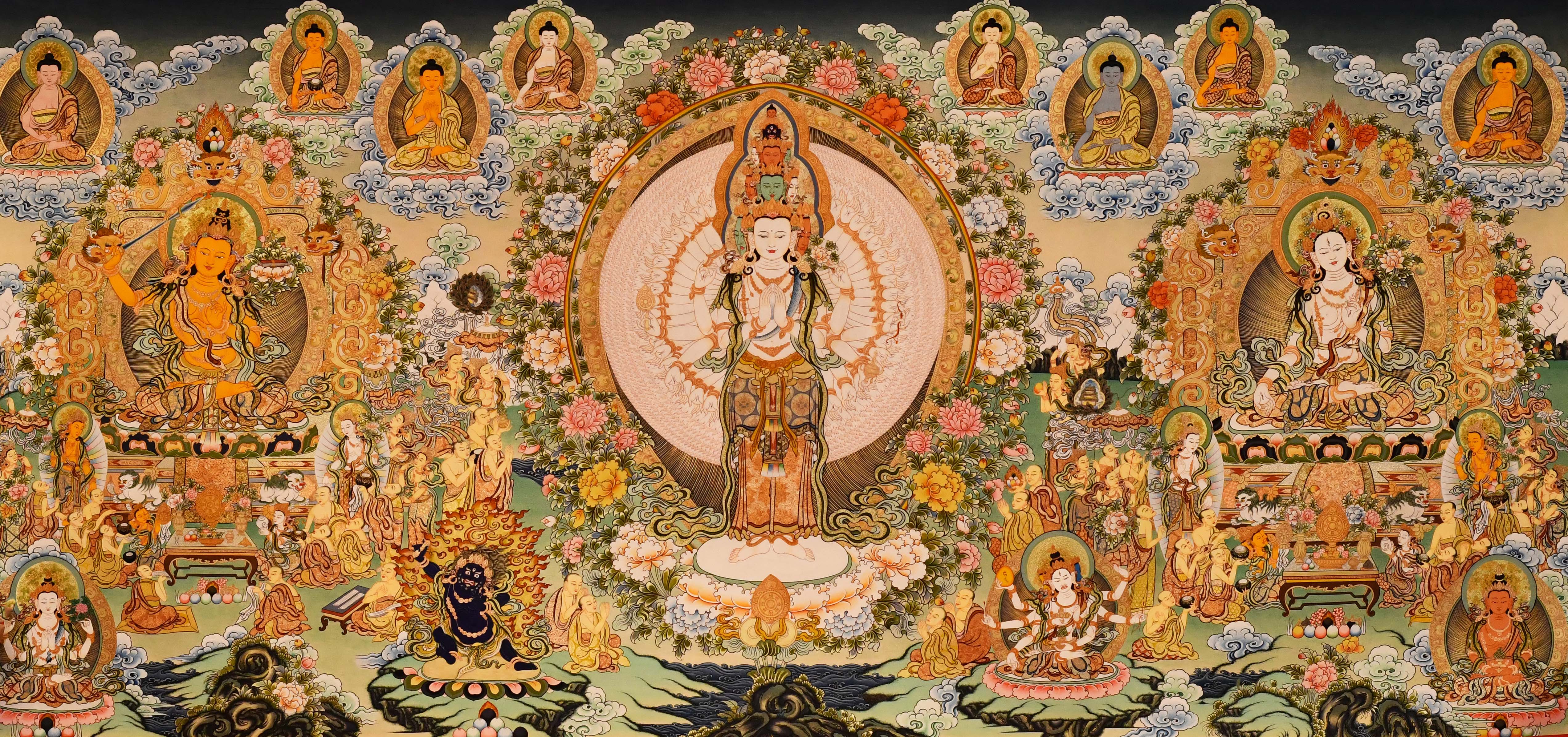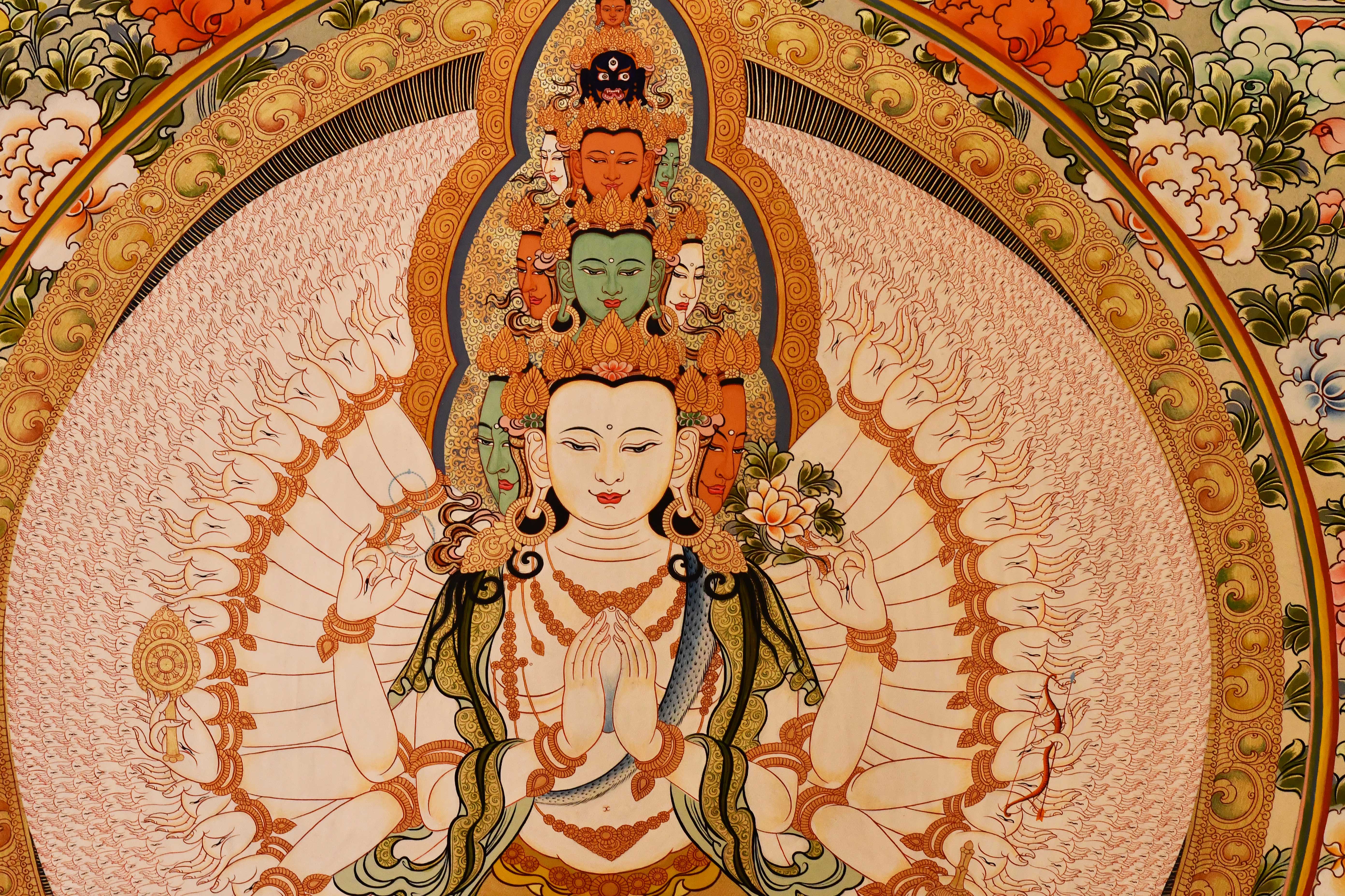 千手觀音又稱千手千眼觀世音、千眼千臂觀世音等,是我國民間信仰的四大菩薩之一。千手觀音也是觀音菩薩的化身之一。觀音菩薩與文殊菩薩、金剛手菩薩合稱為雪域三怙主。