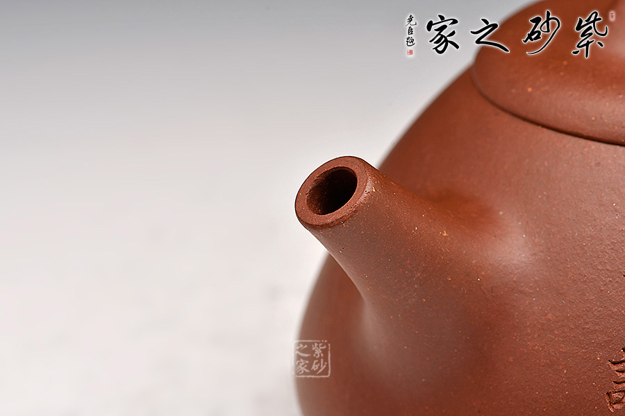 壺身豐腴飽滿,原礦底槽青使色澤溫潤古舊,質(zhì)地細(xì)膩,成色穩(wěn)重。壺嘴為直筒形,直徑精細(xì)把控,出水有力順暢。壺把渾圓有力,平蓋壓壺,咬合緊密,整個(gè)壺一氣呵成,張力十足。