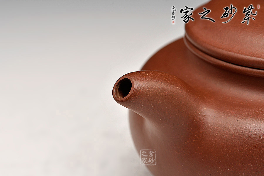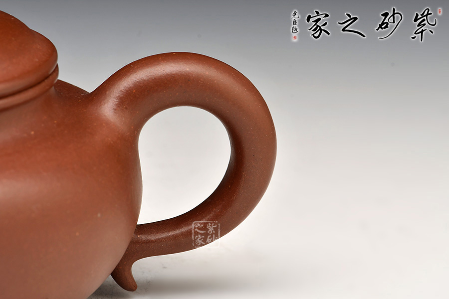 二彎流胥出自然,圓圈把自肩部勢(shì)均而起,后圓轉(zhuǎn)接入腹部下端,頸部與身桶一體成型,宛若天成,制作工藝難度極大。全器線條柔和流暢,比例協(xié)調(diào),收展有度,表現(xiàn)了紫砂茶器的簡(jiǎn)潔素雅之美。