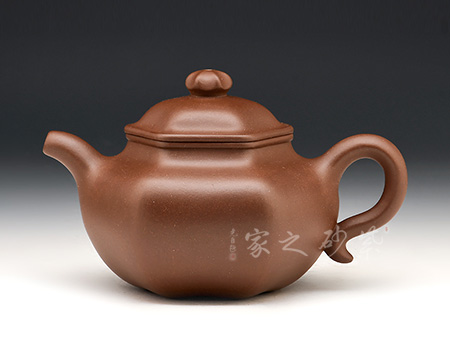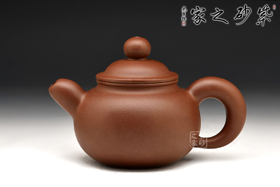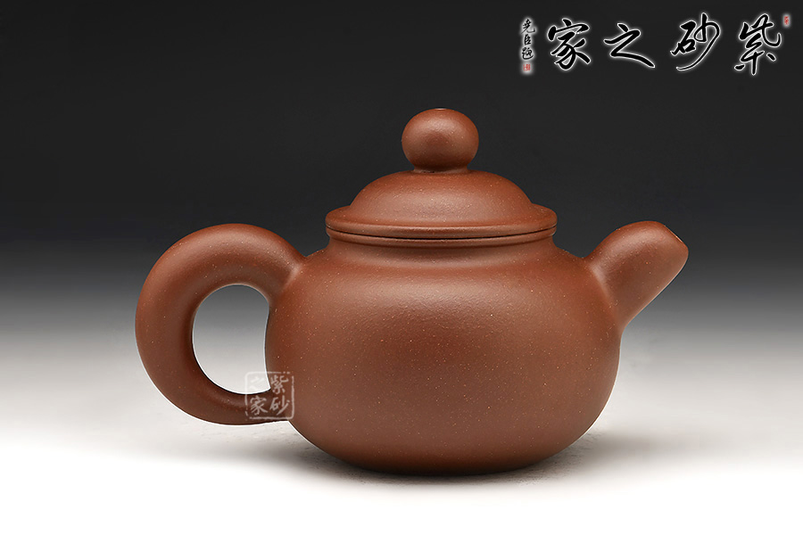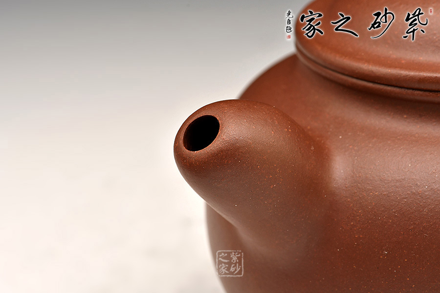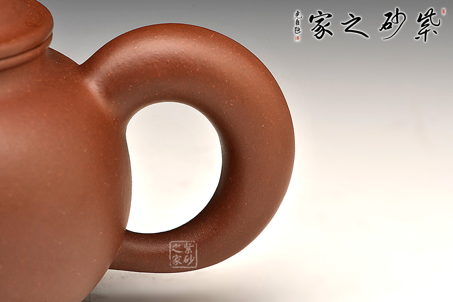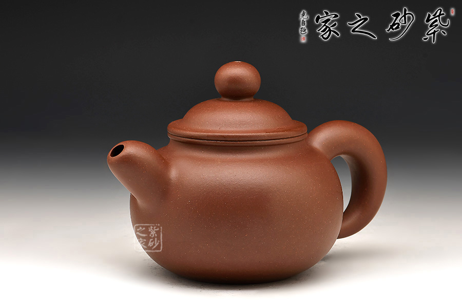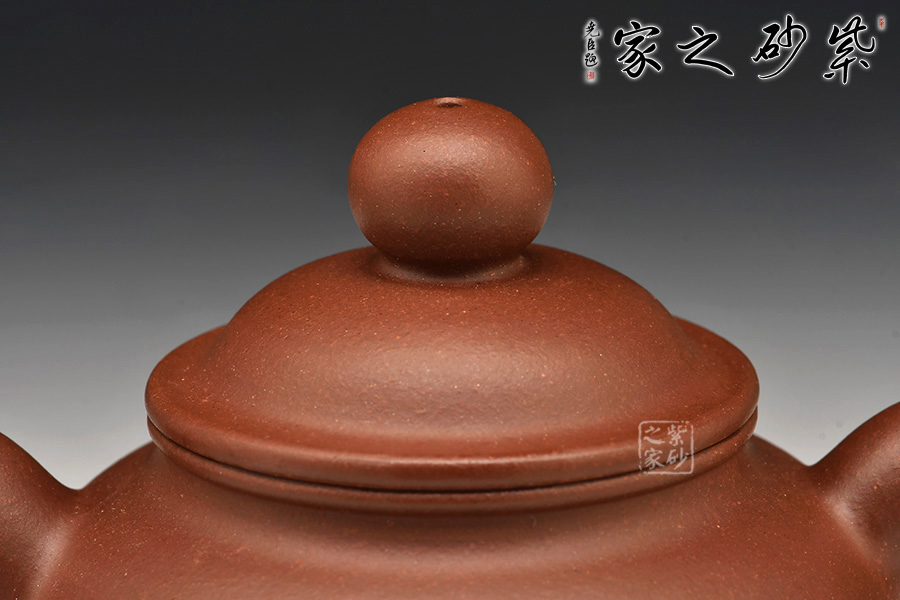 紫砂蓮子造型,鼓腹、圈底、耳形把、二彎流,流把粗憨。蓋唇與頸唇外翻并相互吻合,口蓋嚴(yán)密、制工精雅、泥色肥潤、曲線柔美、器型飽滿。