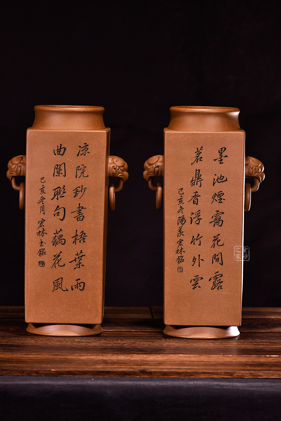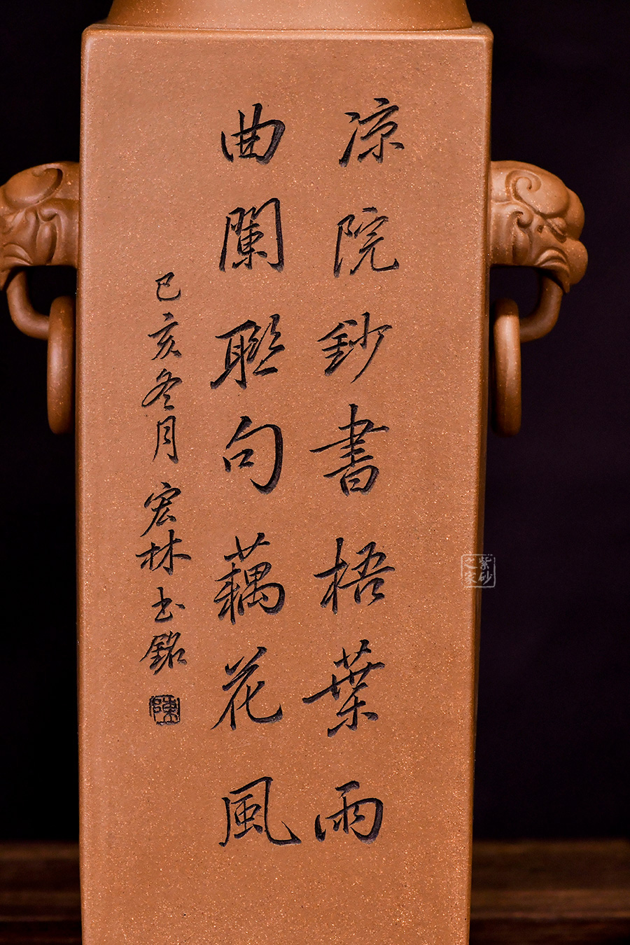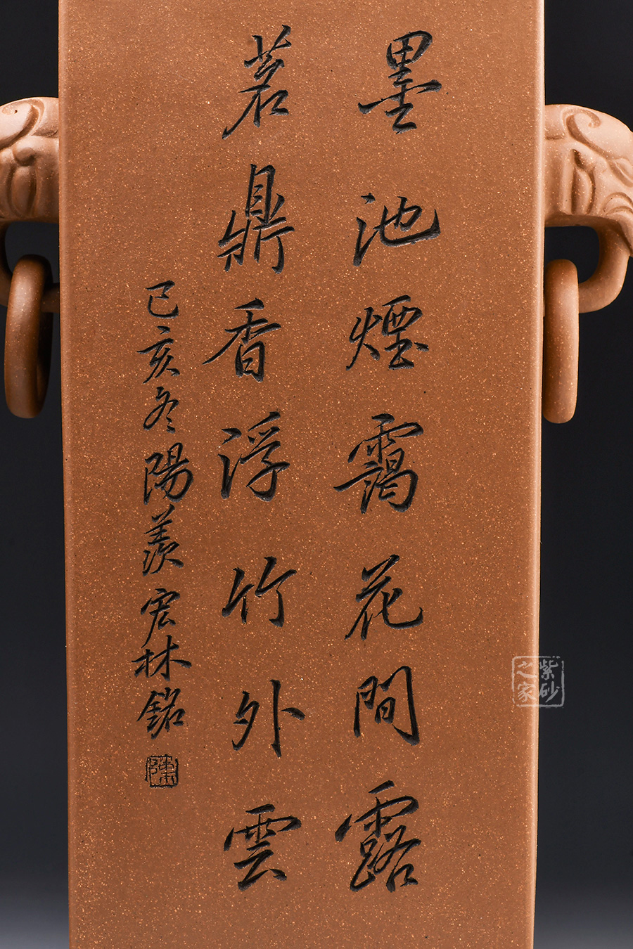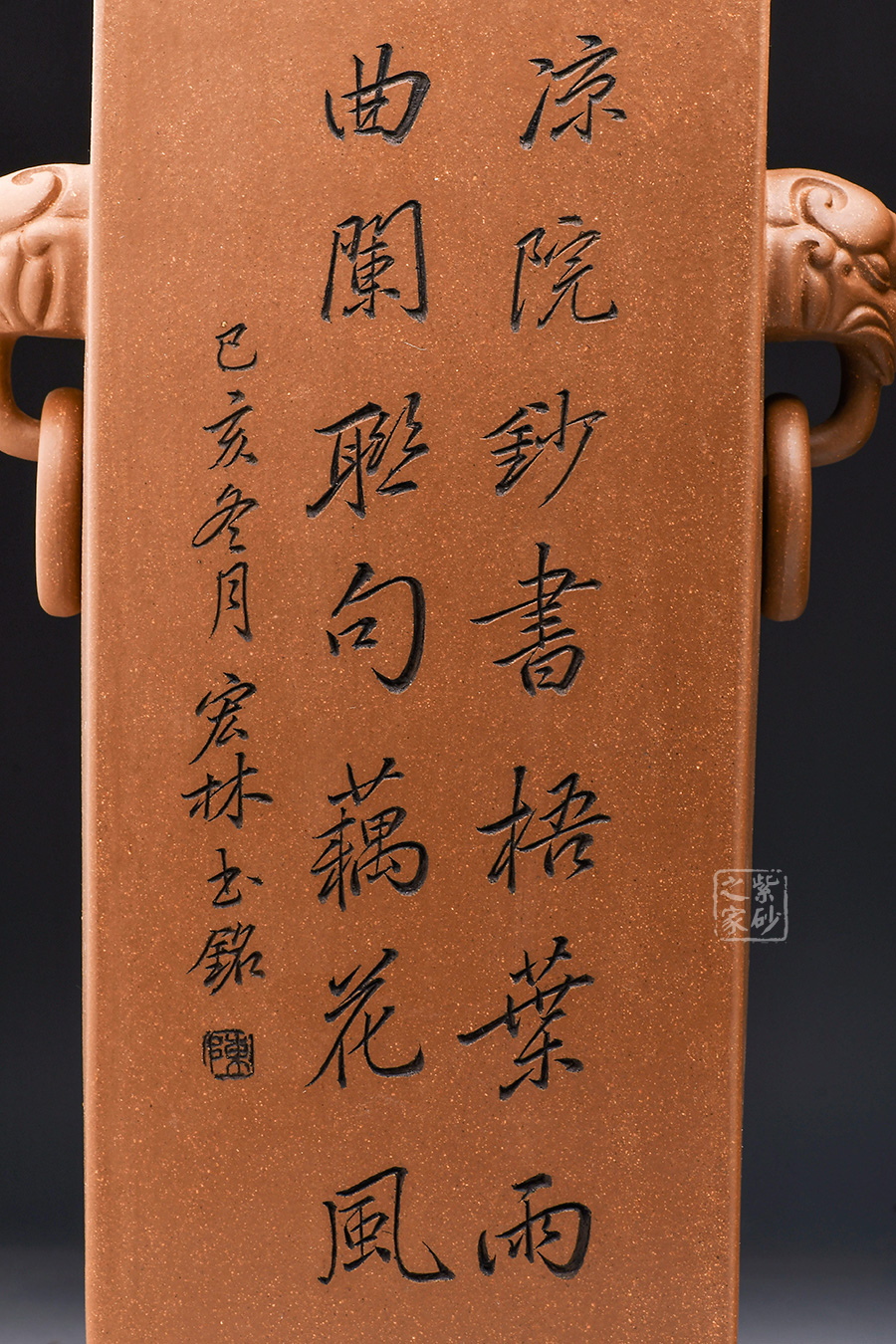 光貨離不開裝飾。俗話說(shuō)“壺隨字貴,字隨壺傳”:光壺不刻字,就是一把光壺;壺上面刻了大師、名人的字,一把壺的含金量就高了,收藏價(jià)值就更高,升值潛力就更大。王福君與中國(guó)工藝美術(shù)大師譚泉海合作最多,其次是徐安碧、鮑志強(qiáng)、毛國(guó)強(qiáng)(均為中國(guó)工藝美術(shù)大師、中國(guó)陶瓷藝術(shù)大師)。